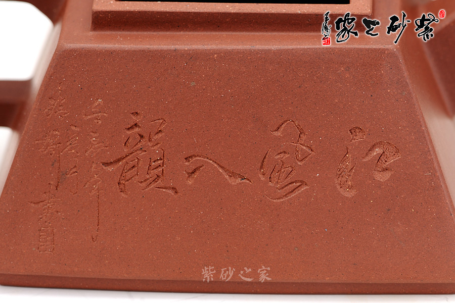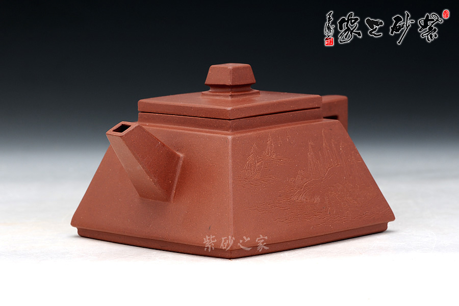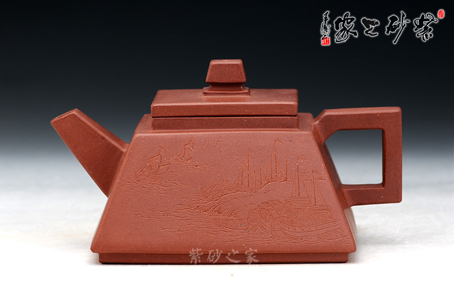 整個(gè)壺體線條直爽不凝滯,清爽流暢,直形壺嘴出水方便,方形壺把拿捏平穩(wěn)。壺身江風(fēng)、船舶相伴,一側(cè)筆跡渾厚有力,更顯此壺大氣之風(fēng)。
