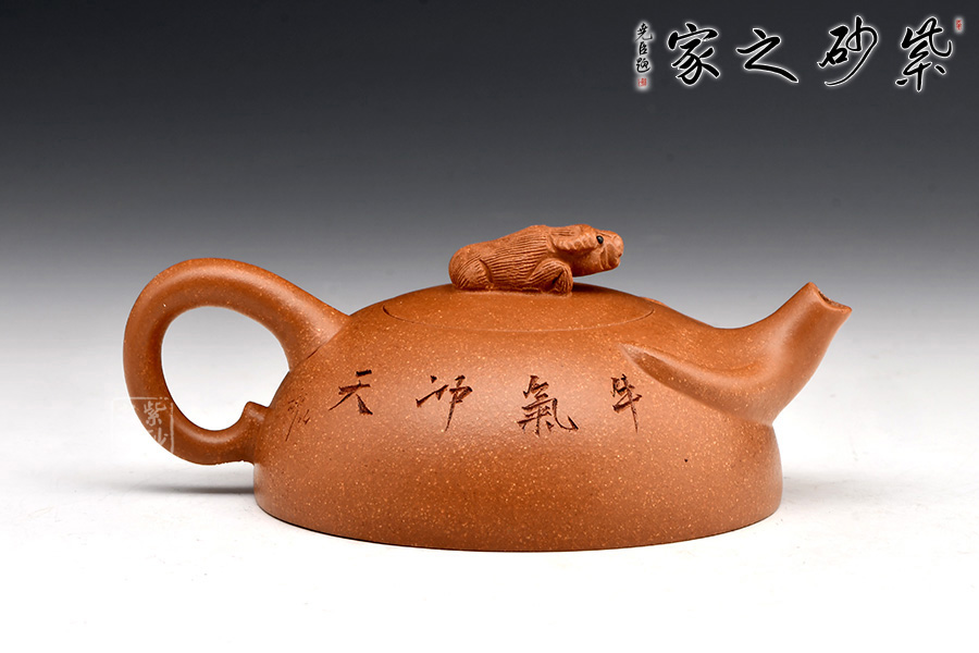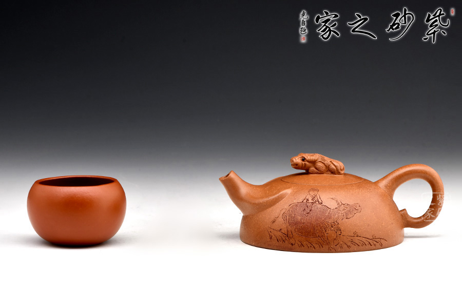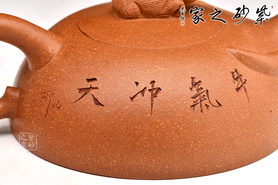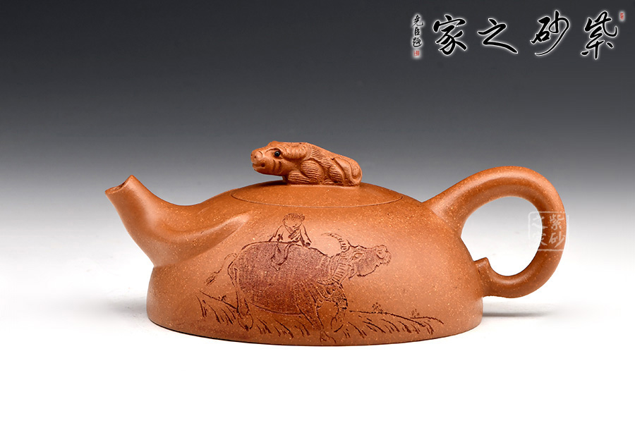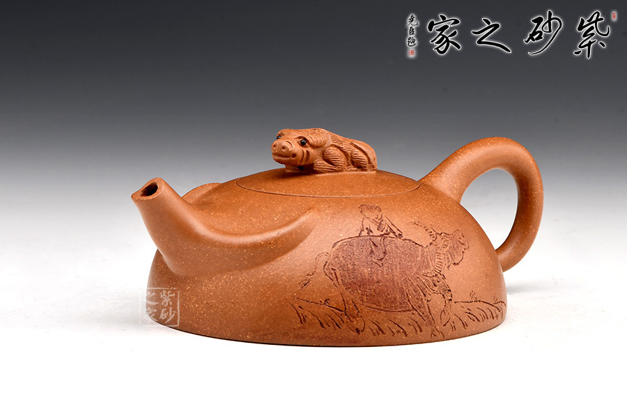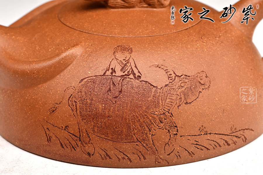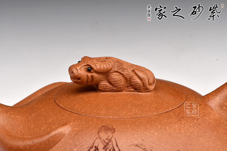 此牛氣沖天壺,以半球體為壺身,以十二生肖之一牛為鈕。短流嘴自壺身倔強(qiáng)的翹起,與外擴(kuò)的壺把兩相呼應(yīng),壺身正面刻繪的牧童騎黃牛畫面為此壺增添了很多趣味,反面的“牛氣沖天”四字蒼勁有力,對(duì)應(yīng)主題!