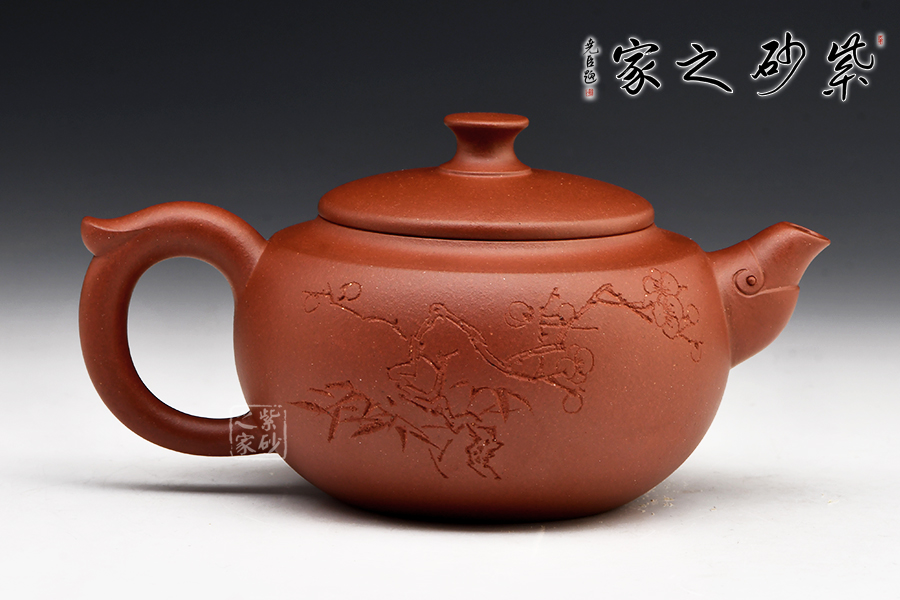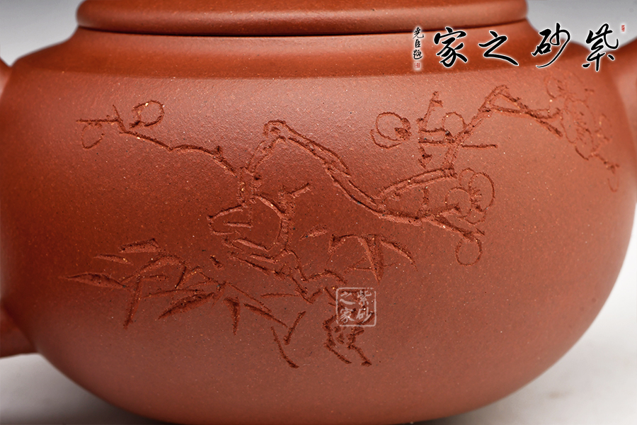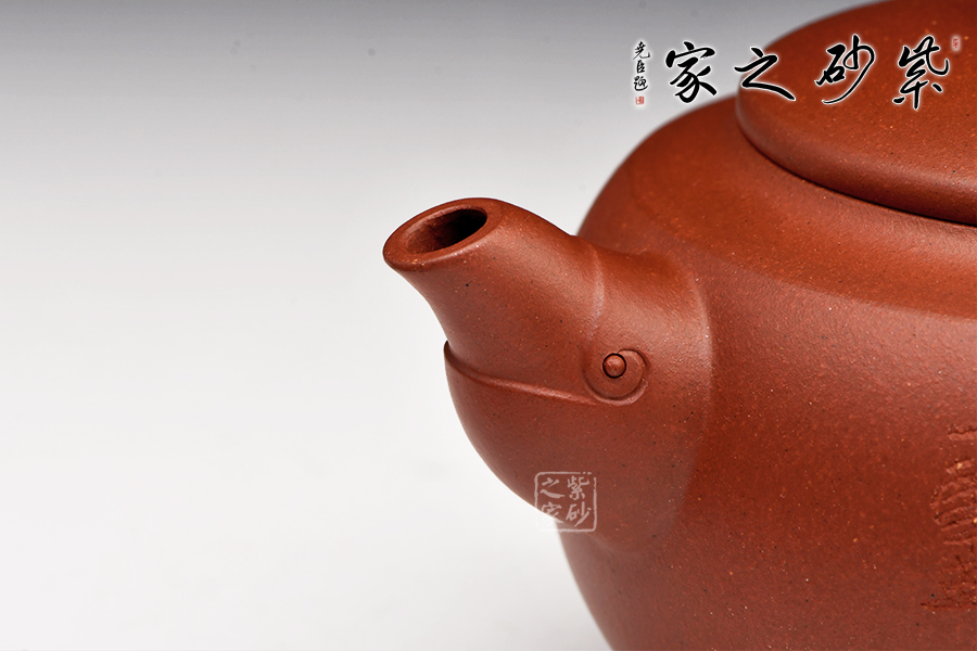 此“香遠”壺出自“香遠益清”,壺身飽滿,壺嘴有梅花裝飾,蓋平正,壺口較大便于投放茶葉,耳形把外擴,張力十足。