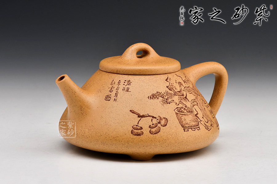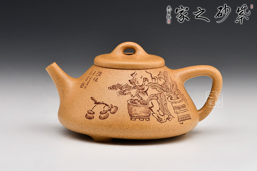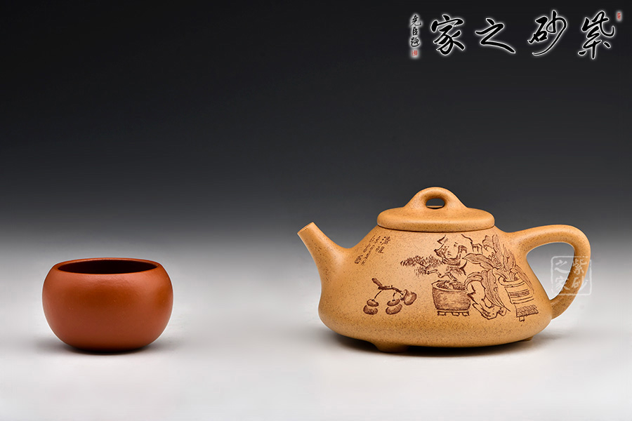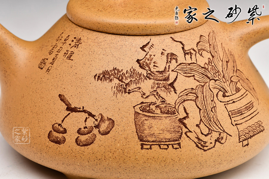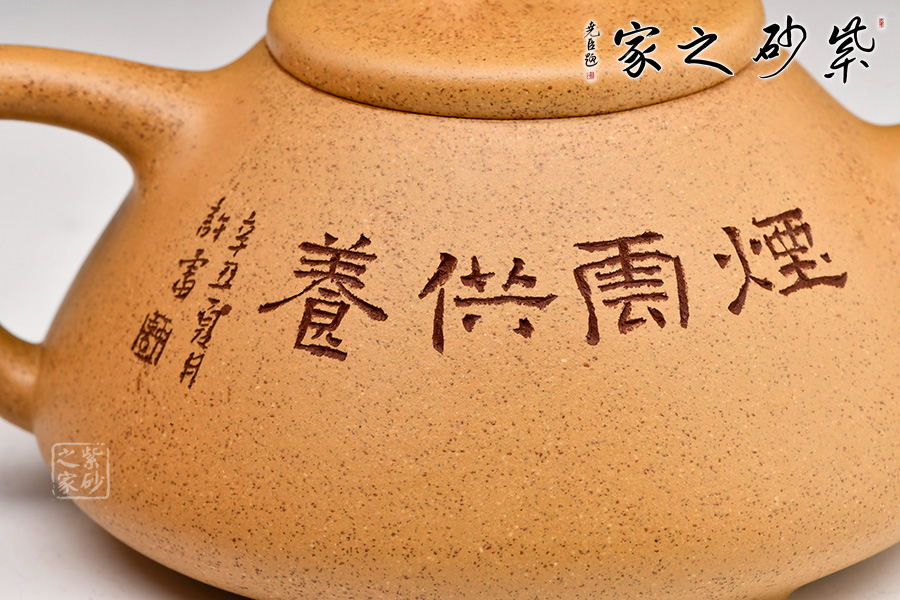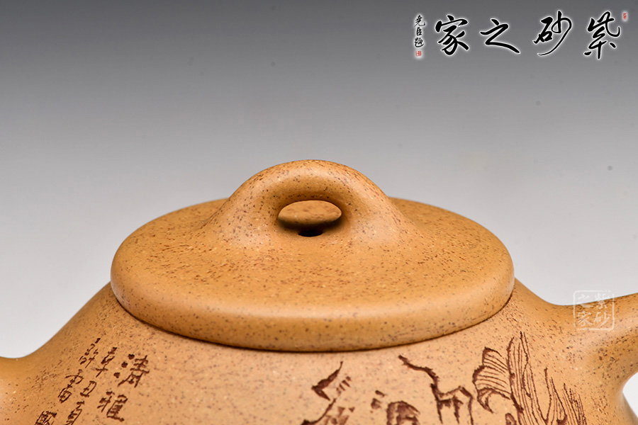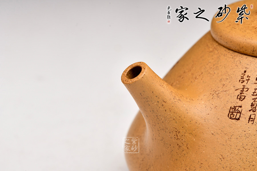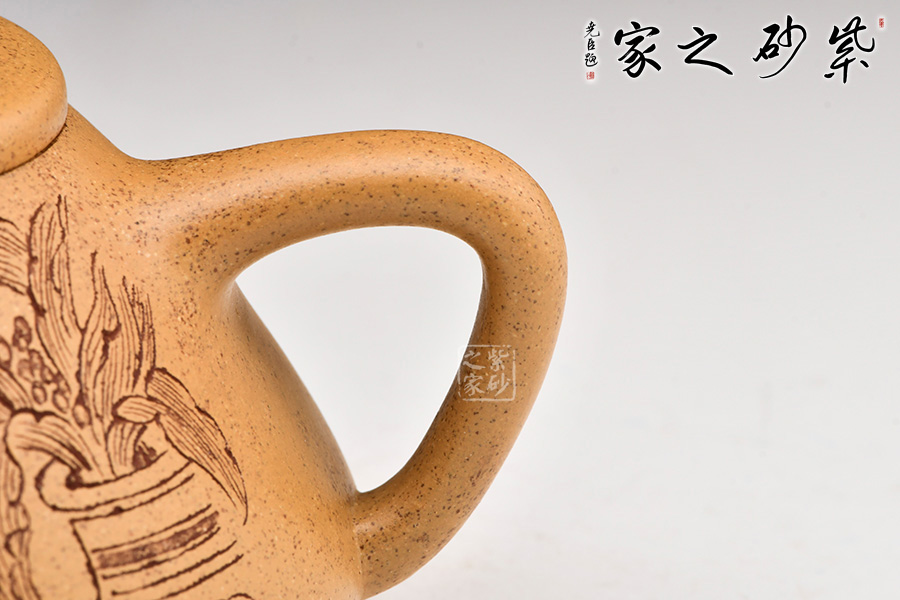 泥性:感甜嫩綿密,質(zhì)堅(jiān)而溫潤,呈近田黃色調(diào),為江蘇宜興趙莊山系朱泥礦~黃石黃之共生礦,經(jīng)挑揀練製而成,因含鐵量只達(dá)6%左右,致陶之后呈“金田黃色”。
