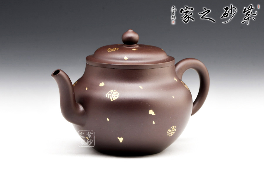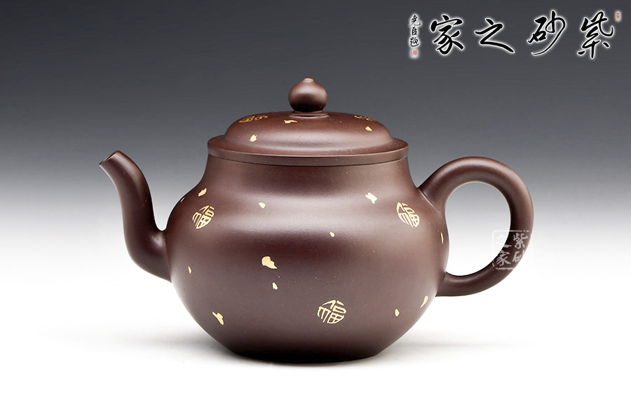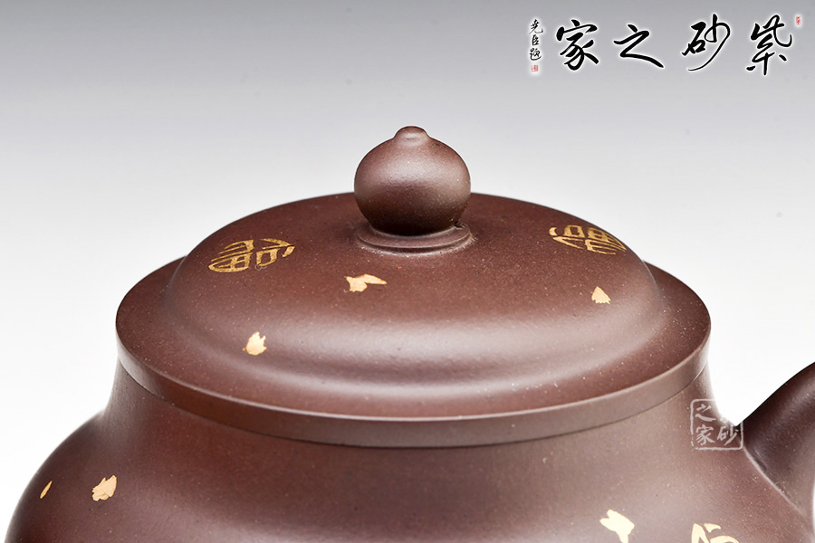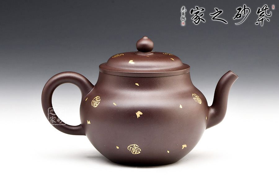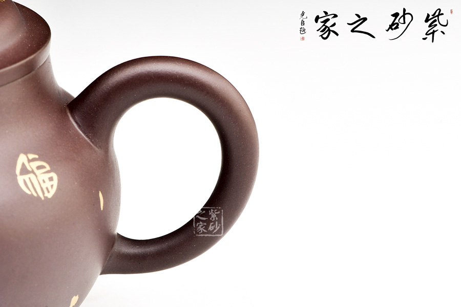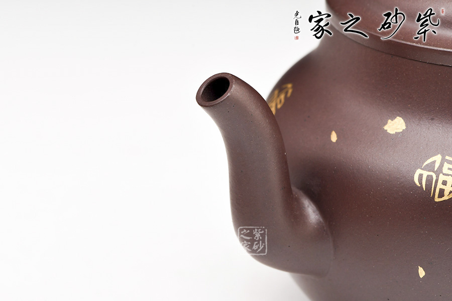 此把宮燈壺由原礦紫泥煉制而成,高貴迷人,雅俗共賞。彎流自壺身蜿蜒而出,弧度優(yōu)雅,耳形把便于抓握,桃形鈕小巧精致,壓蓋與壺口嚴(yán)絲合縫,氣密性極好。描金的福字更賦予了此壺福氣滿滿的寓意。整壺韻味十足,無論自用還是送人都值得入手!