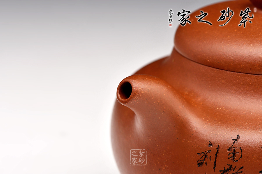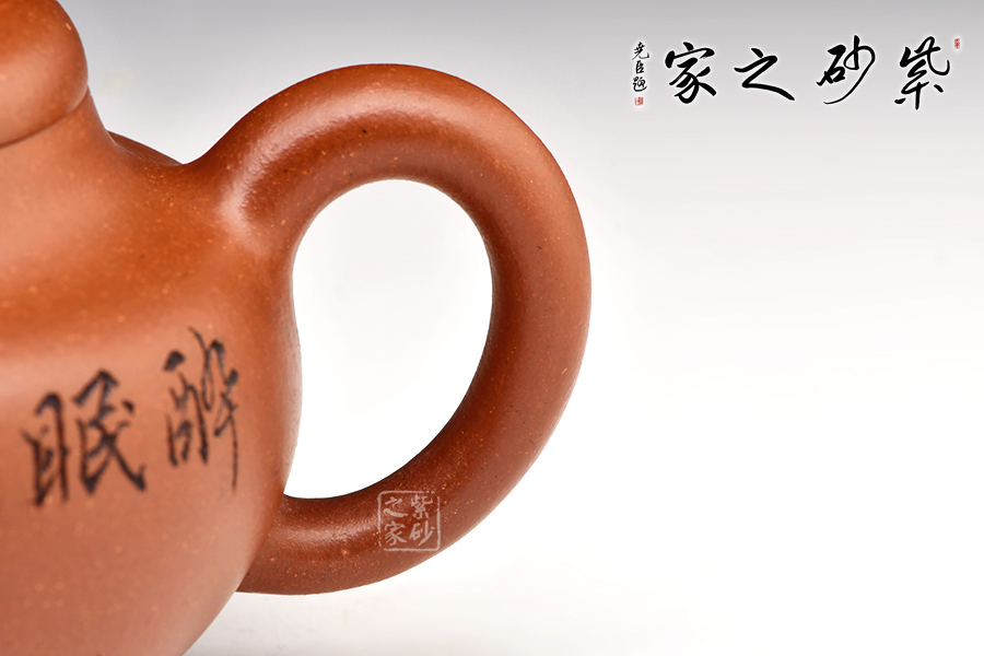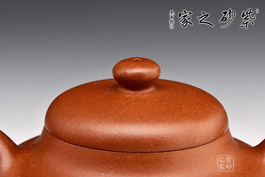 此壺由原礦紅泥制成,光潔明亮,可愛靈動(dòng)。壺身線條流暢柔和,飽滿圓潤(rùn);壺頸較高,寶珠鈕亭亭玉立,壺蓋鼓起如帽,一彎流壺嘴,渾圓可愛,出水爽利。耳形端把,線條柔和流暢,骨肉亭勻,端握舒適。整壺古樸雅致,不媚不俗,故實(shí)用價(jià)值和觀賞價(jià)值都極佳!
