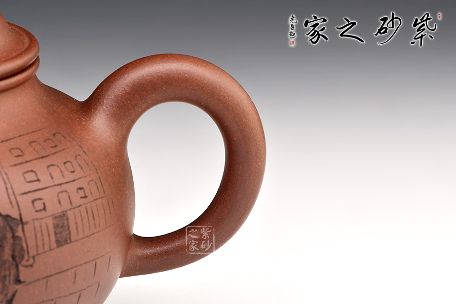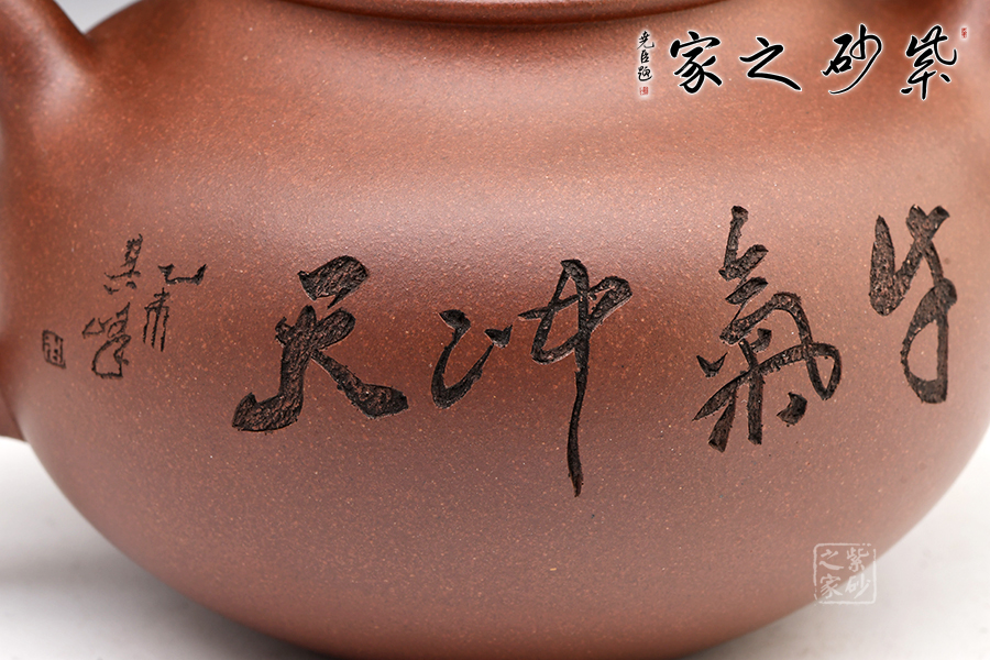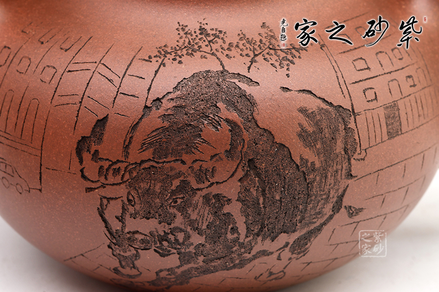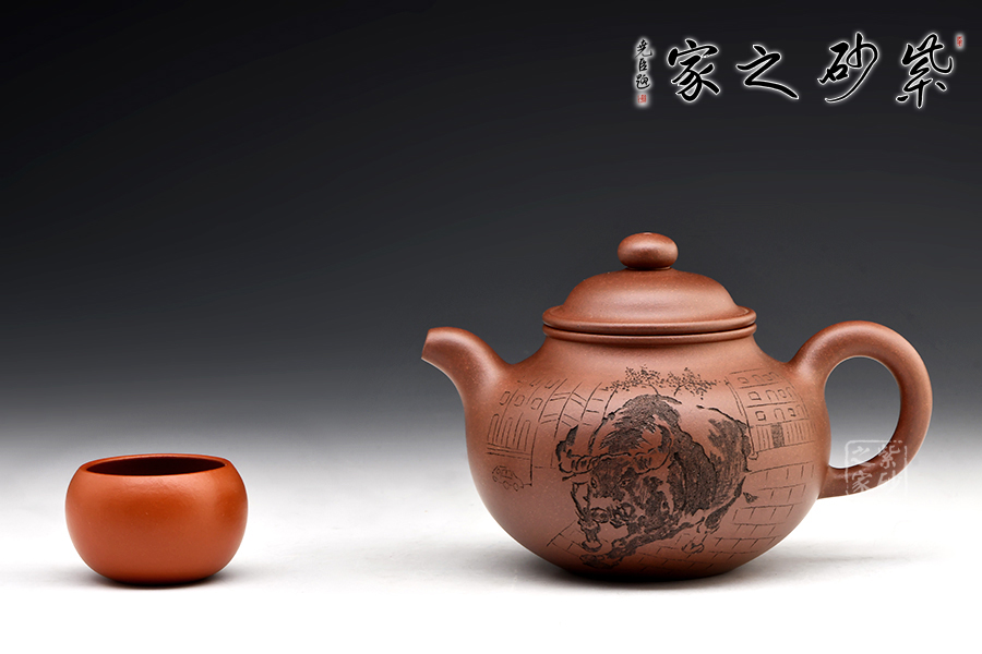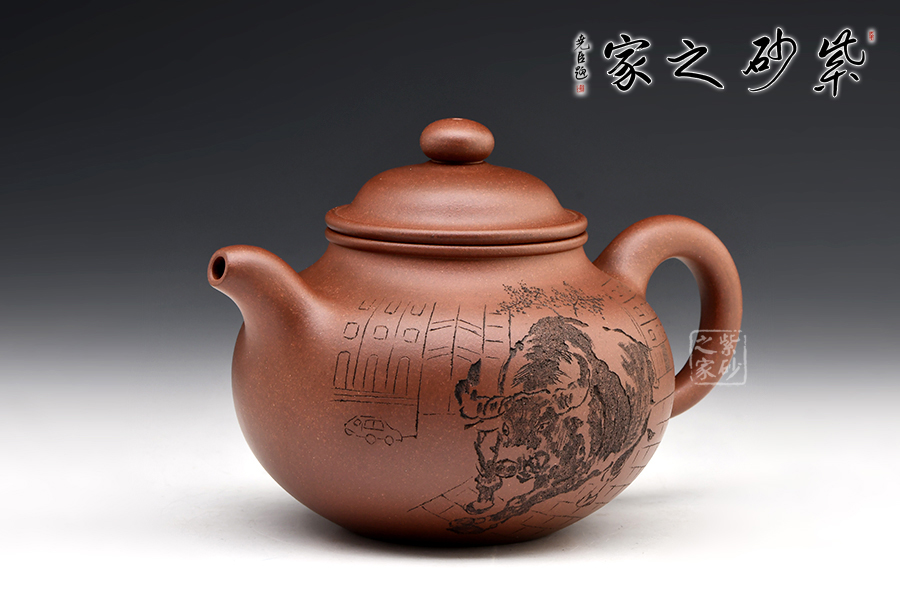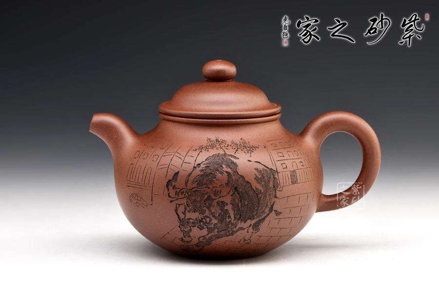 掇球壺是一種經典的傳統(tǒng)器型,幾乎每個藝人都制作過。一彎流,耳形把,壓蓋高凸,珠形鈕,壺身的斗牛四腳朝前,蓄勢待發(fā),象征著積極進取、勤勞致富。有牛氣沖天,扭轉乾坤之意。
