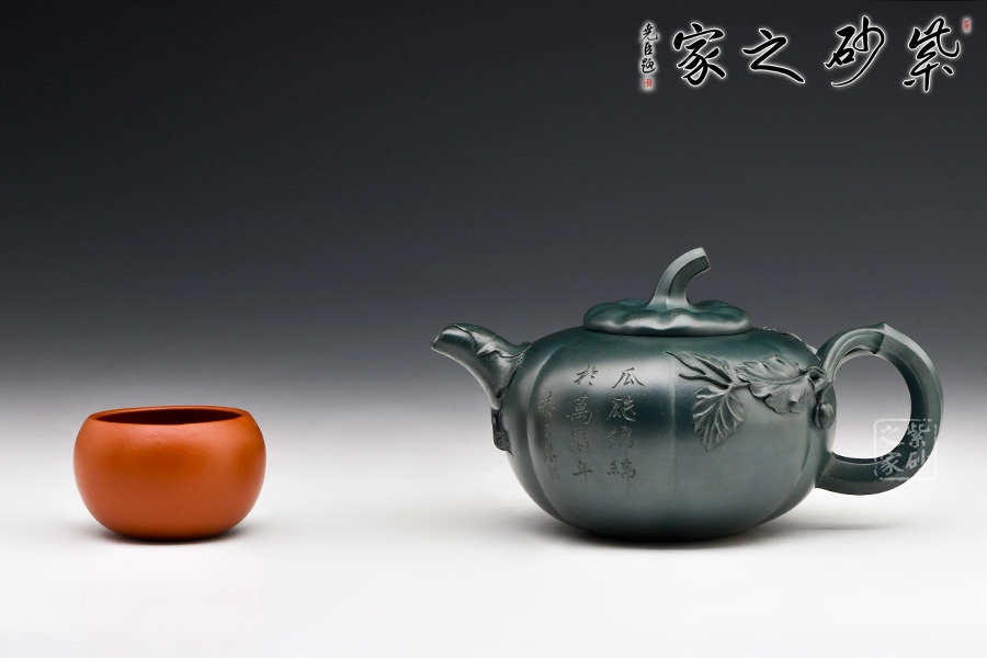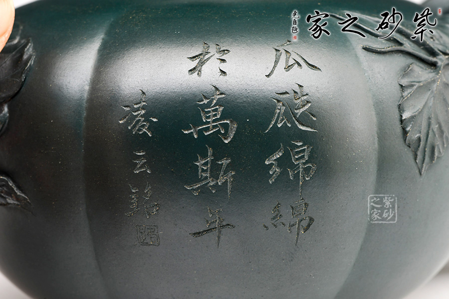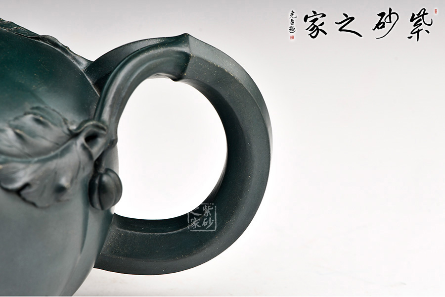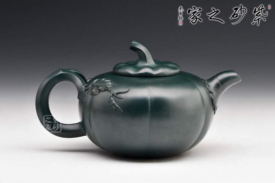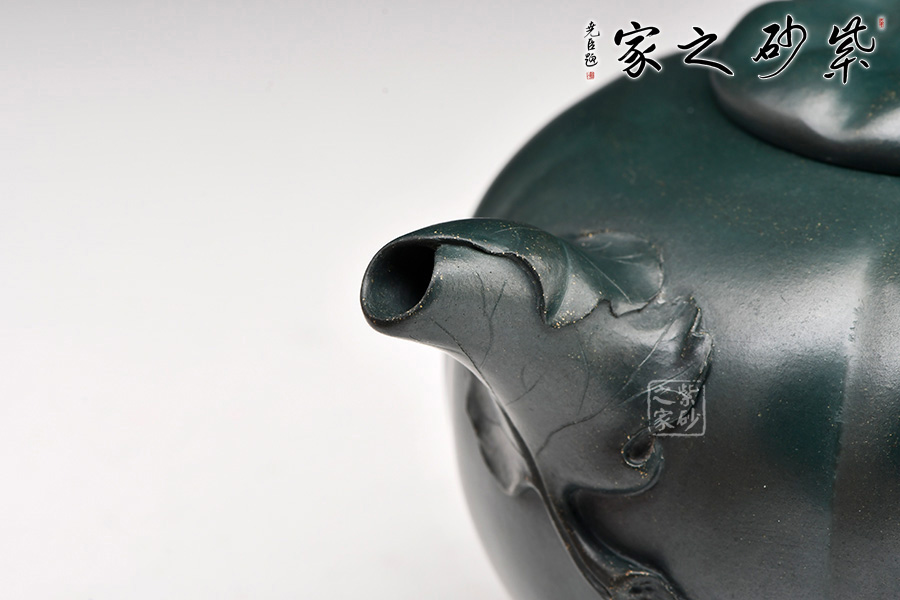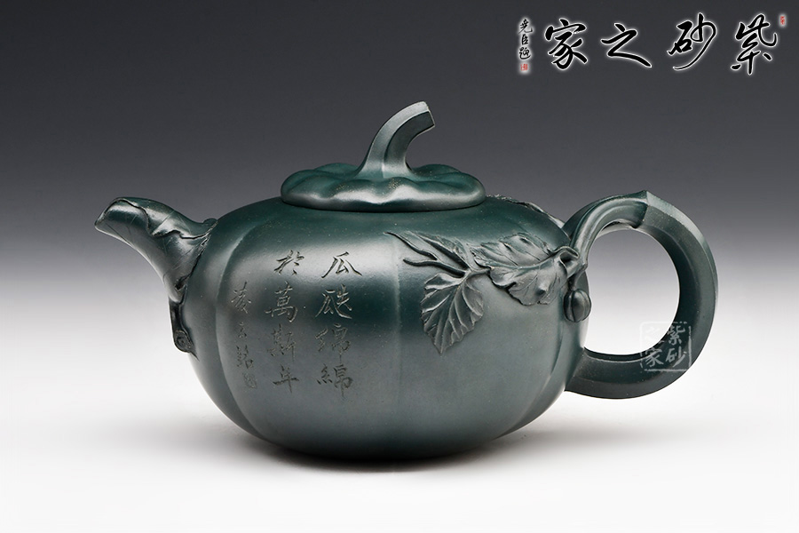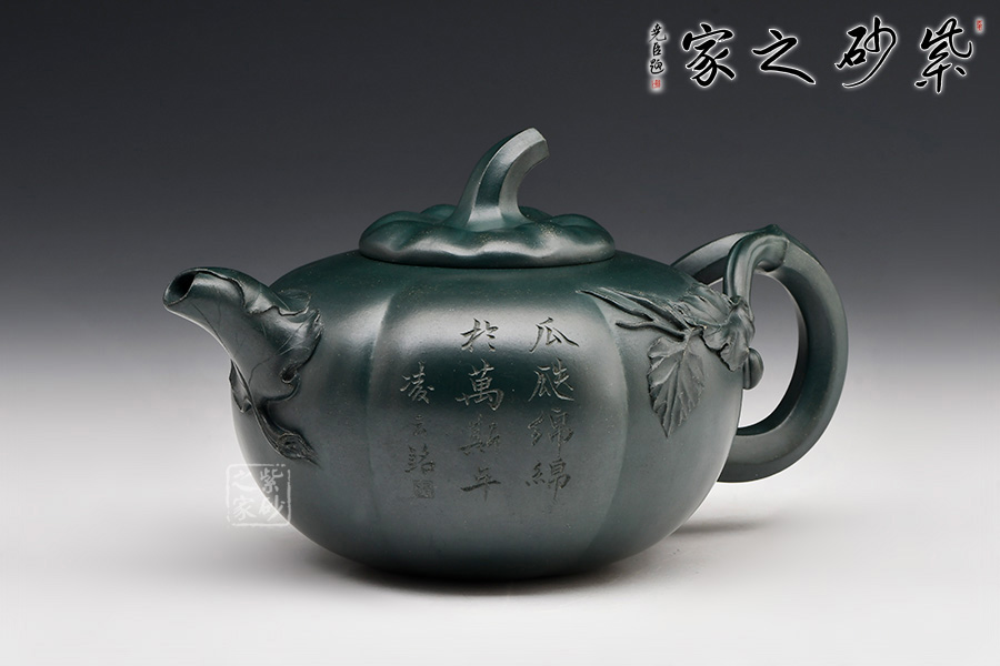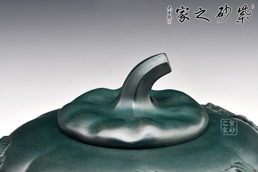 南瓜壺是紫砂壺中很常見的一種款型。此南瓜選用民國綠泥,色澤古雅,不僅外形酷似南瓜,更是集聚了南瓜的神韻。壺鈕、壺把嫉皆以南瓜藤為原型,形象逼真。壺嘴則若南瓜葉包裹而成,精巧別致,創(chuàng)意極新。壺把處一南瓜葉子胥出,形象逼真。整壺精巧別致,趣味天真,乃是一款代表作。