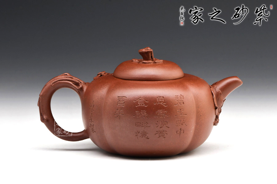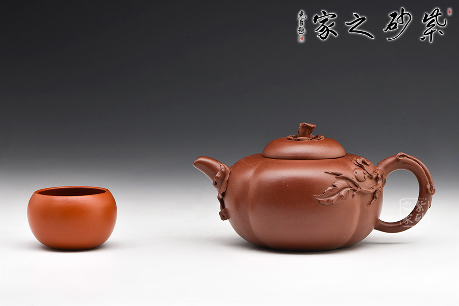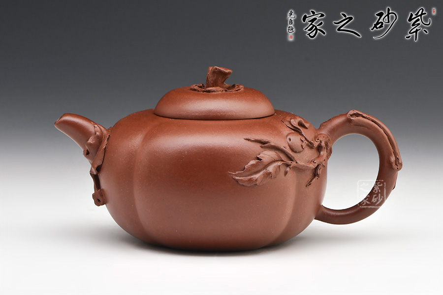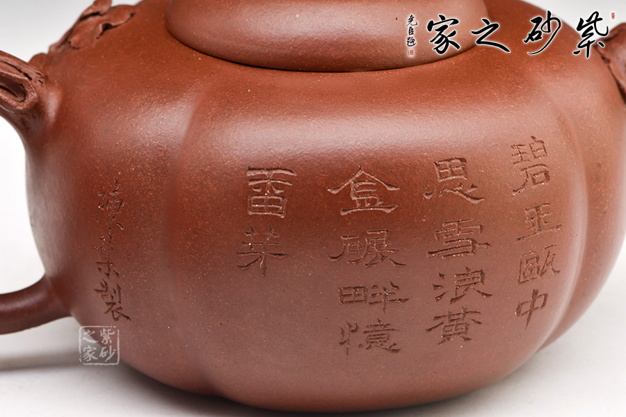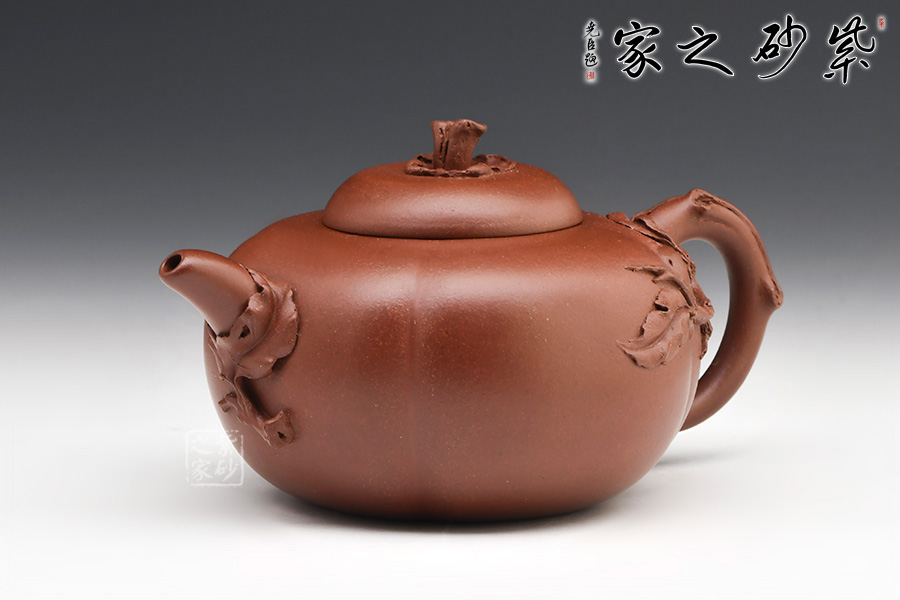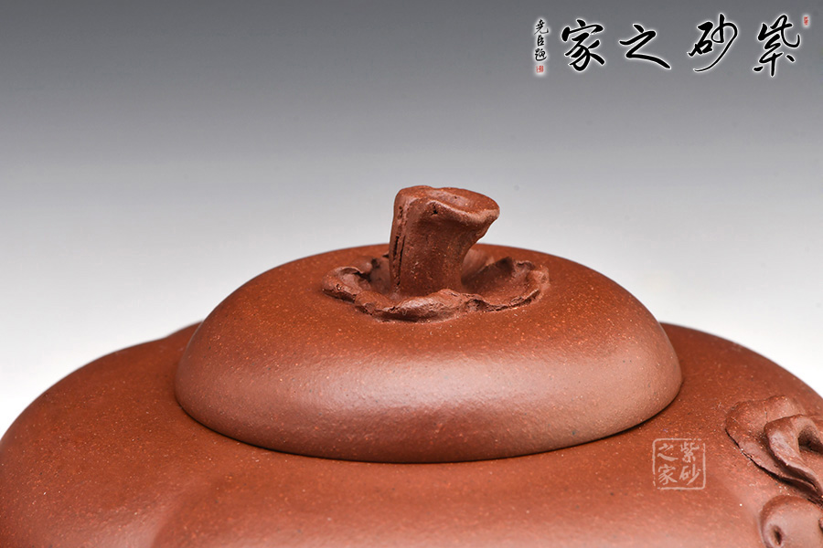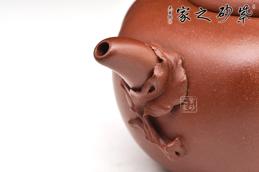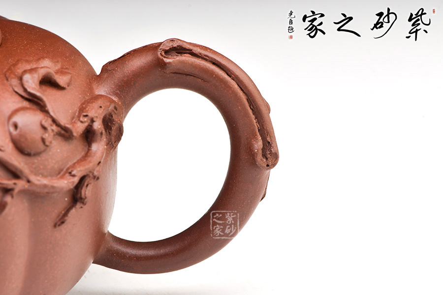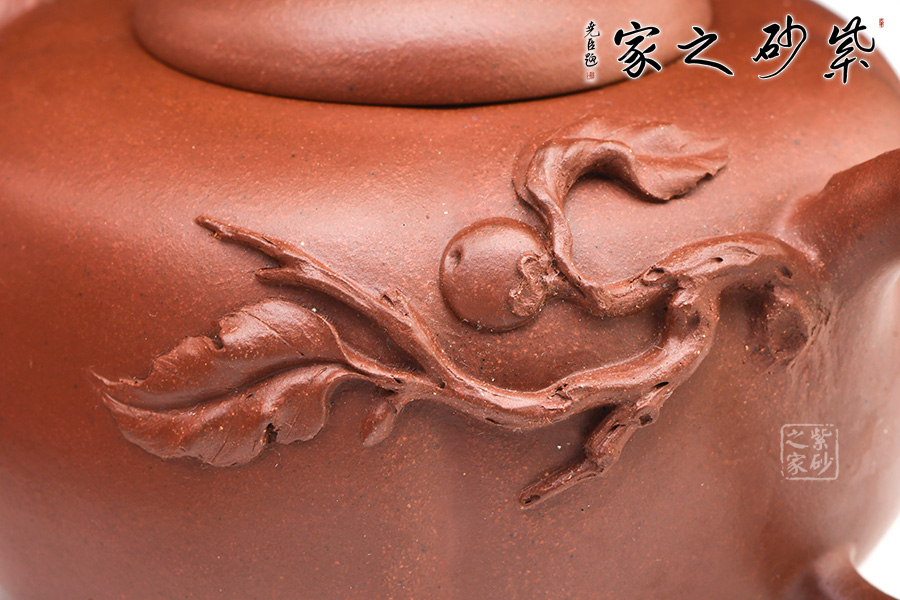 此壺以柿子為原型,造型自然生動,表達(dá)事事圓滿如意的韻味,讓人心中歡喜。整把壺就是一枚柿子,壺身為柿子,壺鈕為柿柄,壺嘴葉片包裹,壺把則以樹枝成型。壺身的柿子外觀飽滿,線條清晰,筋紋明顯,仿佛已經(jīng)熟透。壺身上的枝葉葉紋理清晰,褶皺逼真。加之刻繪,更添文人雅趣。整器頗具田園清趣又栩栩如生。