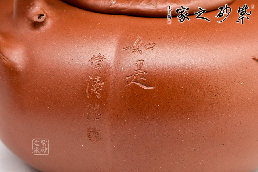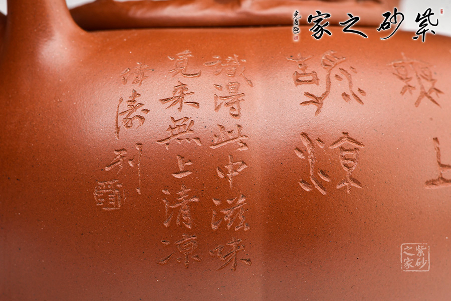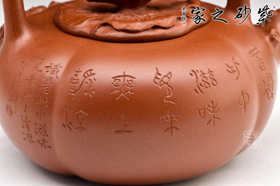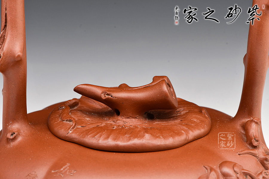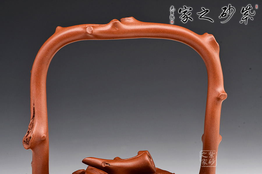 此壺為柿圓壺式,上加提梁,壺身圓潤飽滿,彎流,捺底,截蓋圓鼓,拱狀蓋鈕。在紫砂成型的難度分類中有“一提、二方、三圓”之說,可見提梁壺成型難度之高。此壺器型又以花器、提梁、筋紋,三者合一,難度成倍。絲毫沒有因燒制發(fā)生變形,加之品相完好,實(shí)為難得。