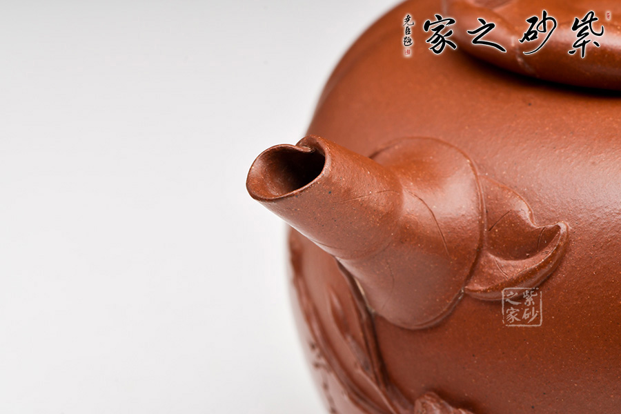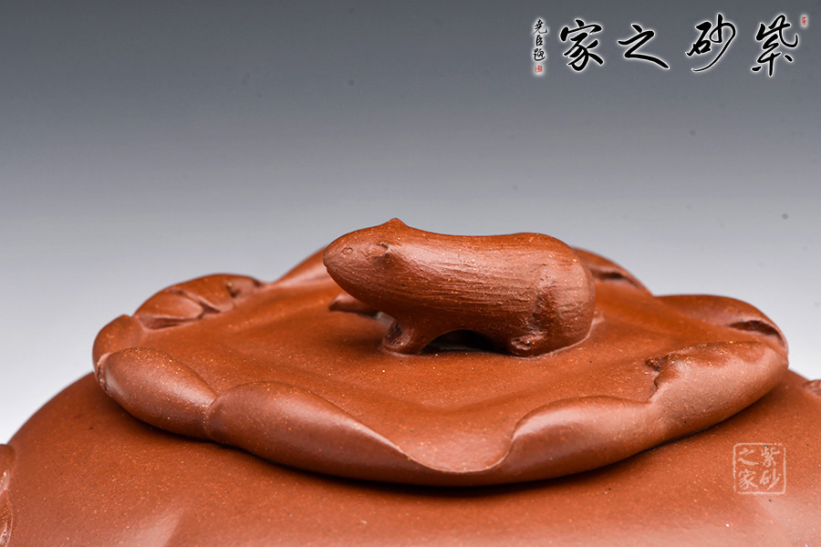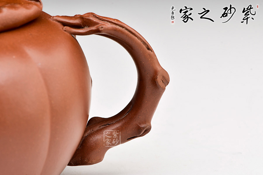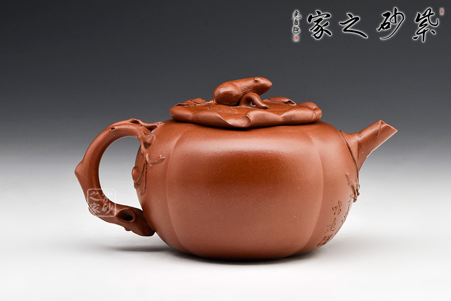作品將筋紋器與花器的造型特征,處理得恰到好處,內(nèi)中有著豐富的意趣和審美趨向。以柿子為主題,壺身扁圓,以四條對稱的凹線,形成四瓣柿身直至壺底,壺肩轉(zhuǎn)折明顯,單口壓蓋,壺口開出不對稱的海棠狀。壺蓋塑為柿蒂,八九片蒂緣環(huán)蓋翻卷,形態(tài)生動逼真,蒂心置一只松鼠為鈕,小小松鼠棲于方柿之上,抬頭扭臀擺尾,活潑靈動。壺嘴以柿葉卷成,并綴飾小枝枒,在造型做工方面破有鳴遠之風(fēng),值得賞藏。