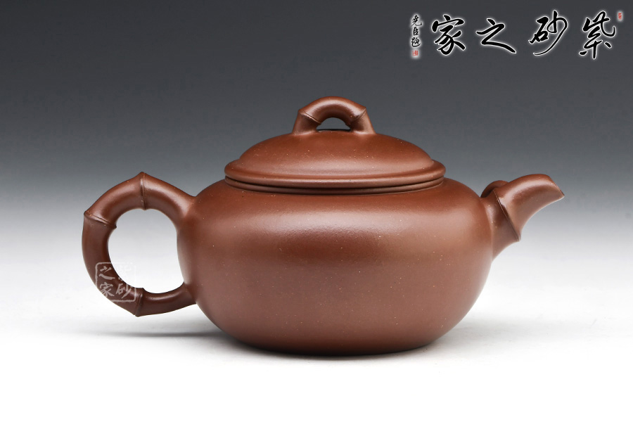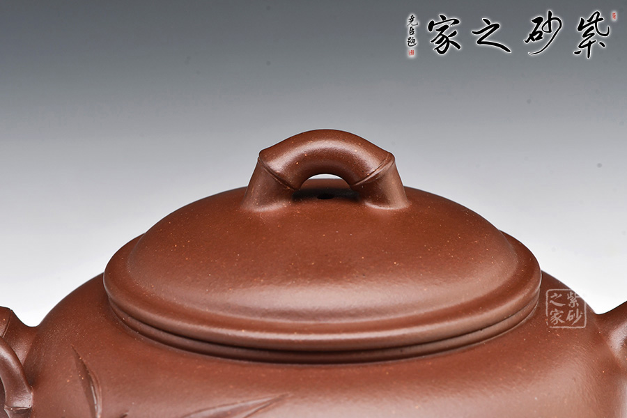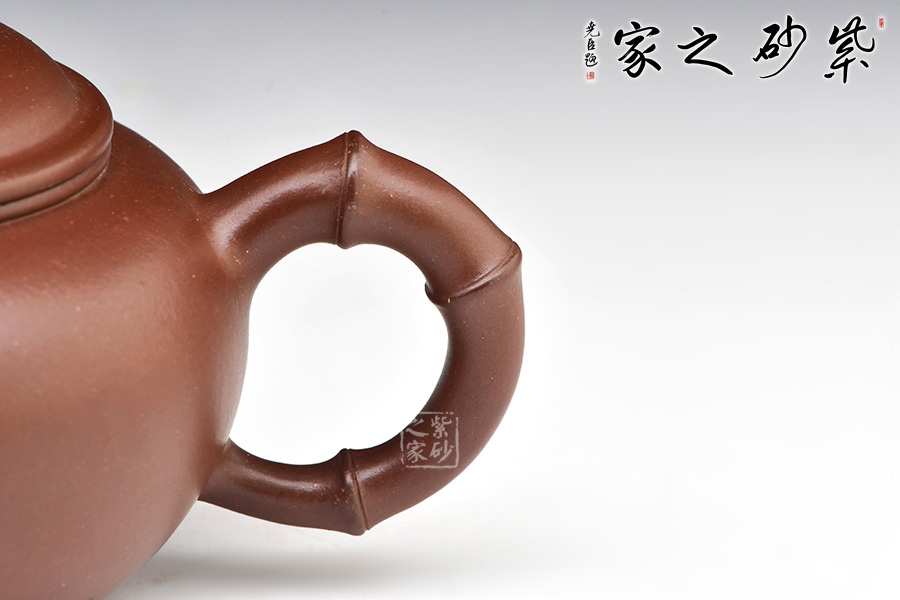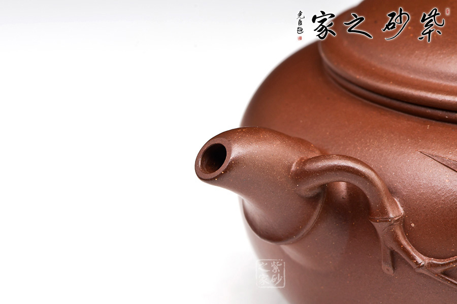 竹趣壺,由中青年實(shí)力派陳葉老師制作。壺身圓潤(rùn),壓蓋,子母線吻合緊密。壺嘴、壺把、壺鈕皆以竹節(jié)為形制。竹節(jié)壺嘴微彎,竹枝胥出,堆塑壺身;竹節(jié)彎曲成壺把,折疊間可見(jiàn)力度勁道;橋形竹節(jié)壺鈕,提捏十分方便。