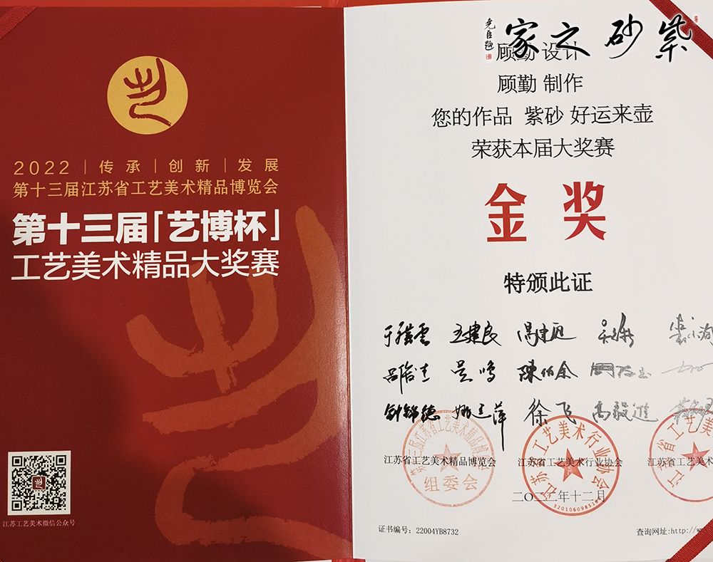 顧勤,女,1970年生于宜興市丁蜀鎮(zhèn)陶藝世家。1986年進江蘇省宜興紫砂工藝廠學(xué)藝,由談躍偉老師帶班啟蒙,后師從紫砂名宿王石耕,并受父親顧紹培大師長期的技藝教育。她在父親的影響下,堅持認真研究紫砂傳統(tǒng)技法與造型,是父親的嫡傳弟子。1992年進中央工藝美院學(xué)習(xí),1995年接受南京藝術(shù)學(xué)院吳山教授的工藝美術(shù)理論指導(dǎo)。她把理論與實際相聯(lián)系,所作傳統(tǒng)作品嚴謹規(guī)整,洗練精巧,凝重樸實;創(chuàng)作新品構(gòu)思飄逸靈動,神豐韻足,具有清新的時代風(fēng)貌,形成了個性鮮明的藝術(shù)風(fēng)格。