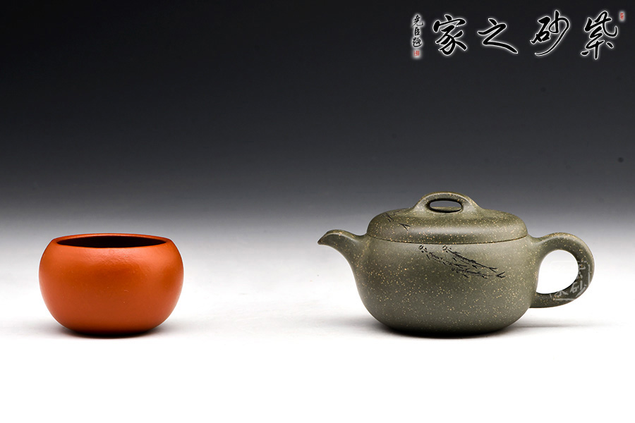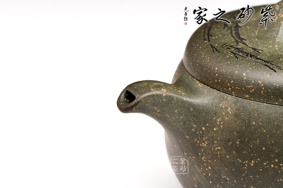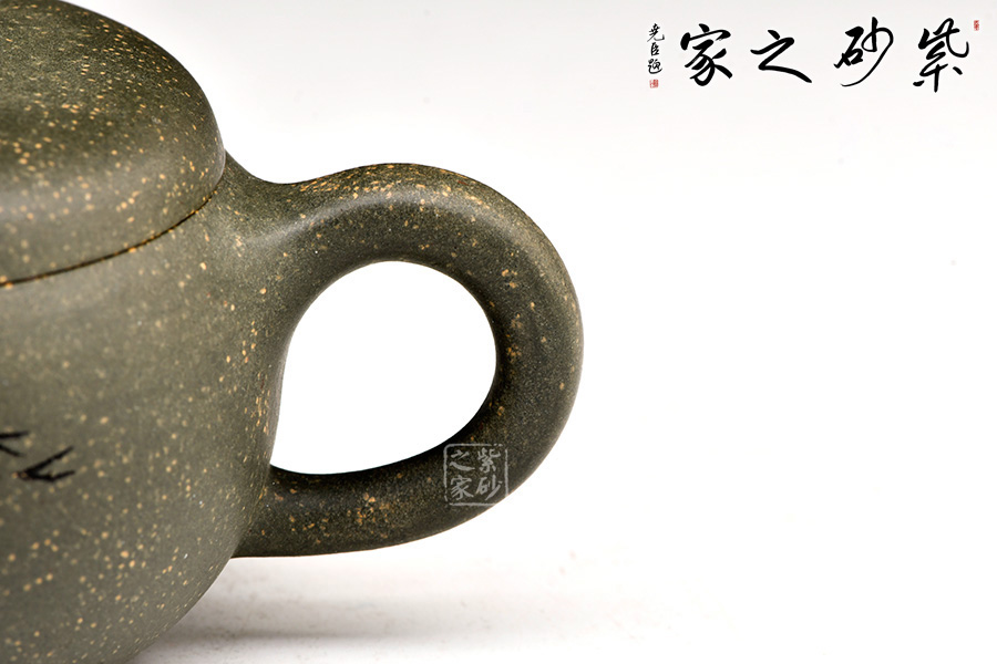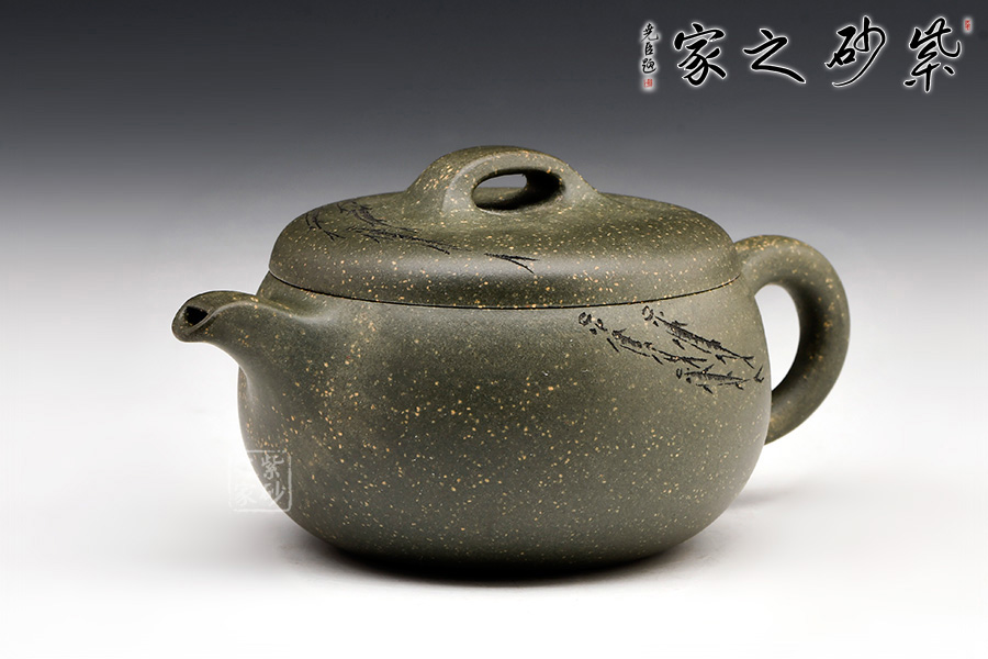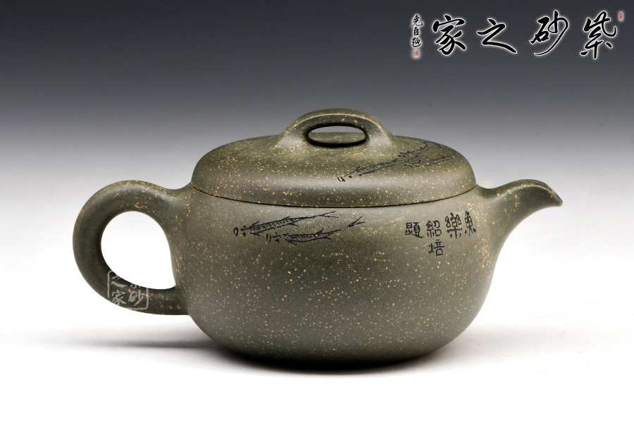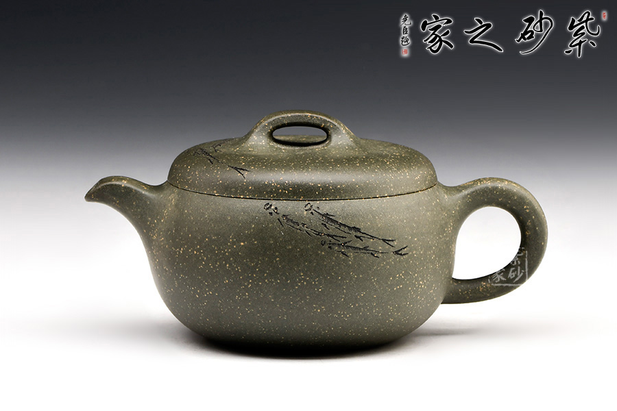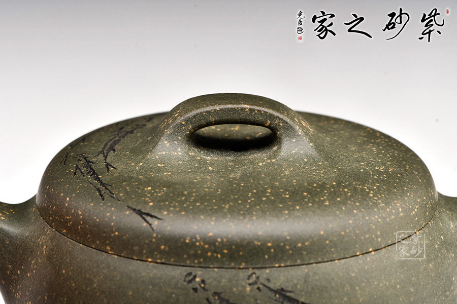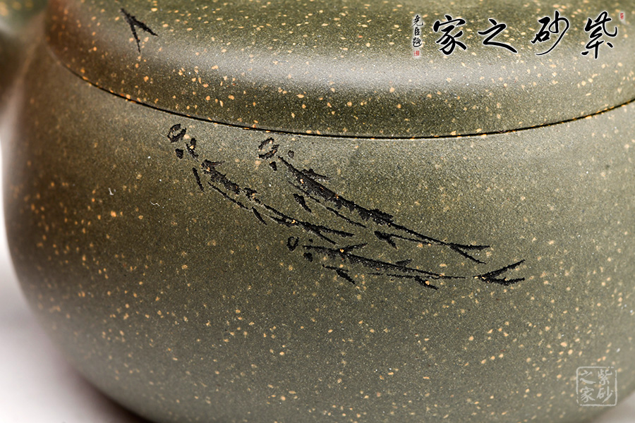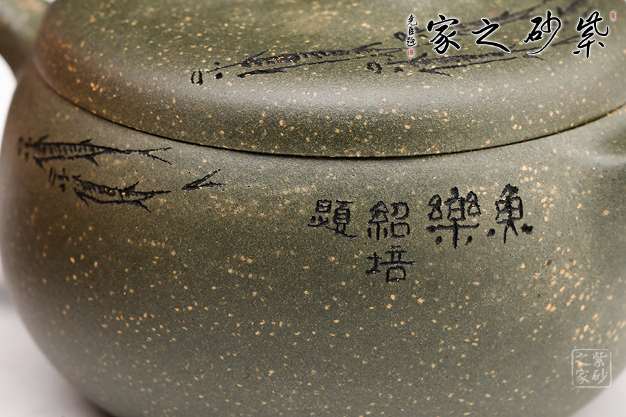 稀有雪華綠泥泥料制成,120cc,壺體圓碩小巧,肩線條過渡自然。大口蓋吻合,子母線天壓地,氣密性佳,使用方便。壺鈕造型簡潔,小耳把,小彎嘴,形制協(xié)調(diào)統(tǒng)一。由其父顧紹培大師親自題詞裝飾,收藏價值倍增?!棒~樂”,數(shù)刀刻繪,魚之輕盈靈動躍然壺上。整器清雅端莊,美麗非常,有寬和雅量之韻,潤澤之器,值得賞藏。