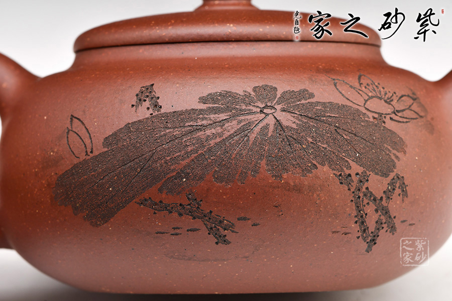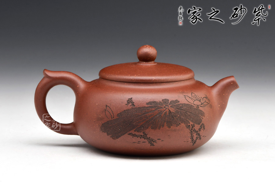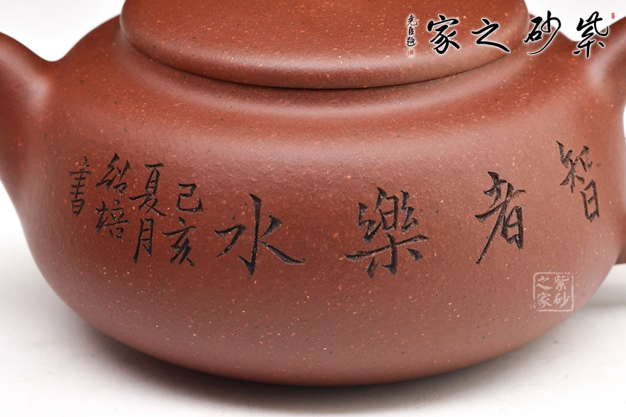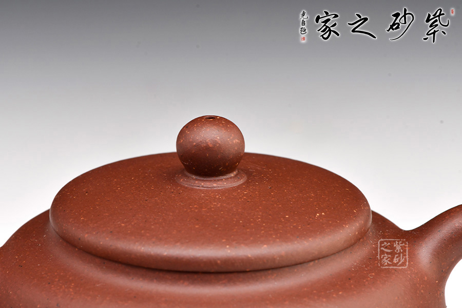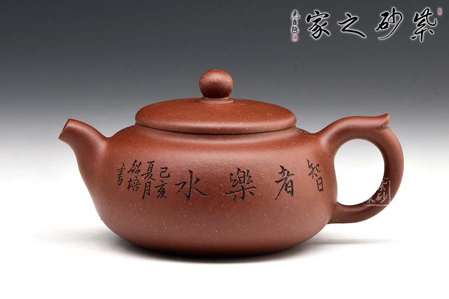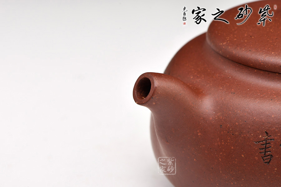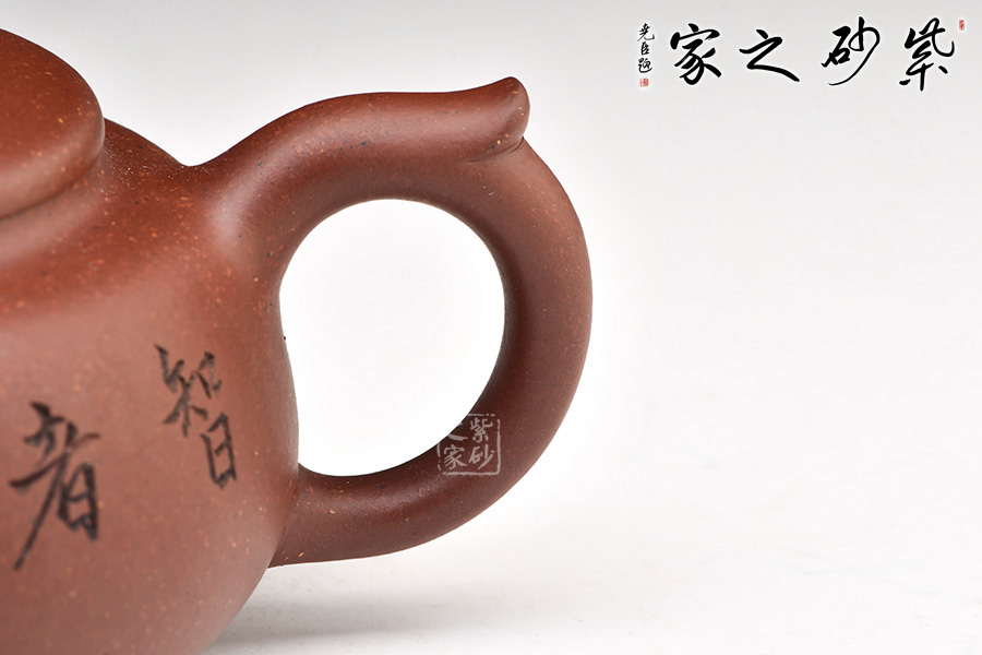 此壺扁圓形豐腴,小彎流,出水有力順暢,耳形飛把,形態(tài)優(yōu)美。口、流、柄高度一致,搭配和諧。壓蓋寶珠鈕,鈕形與壺身形呼應,原礦底槽青作料,極富質(zhì)感,凝重樸實。整器造型規(guī)整,沉穩(wěn)端莊,制作精細,充分展現(xiàn)出紫砂的天然泥色之美。由顧紹培大師裝飾,氣度簡樸大方,賞用皆佳。