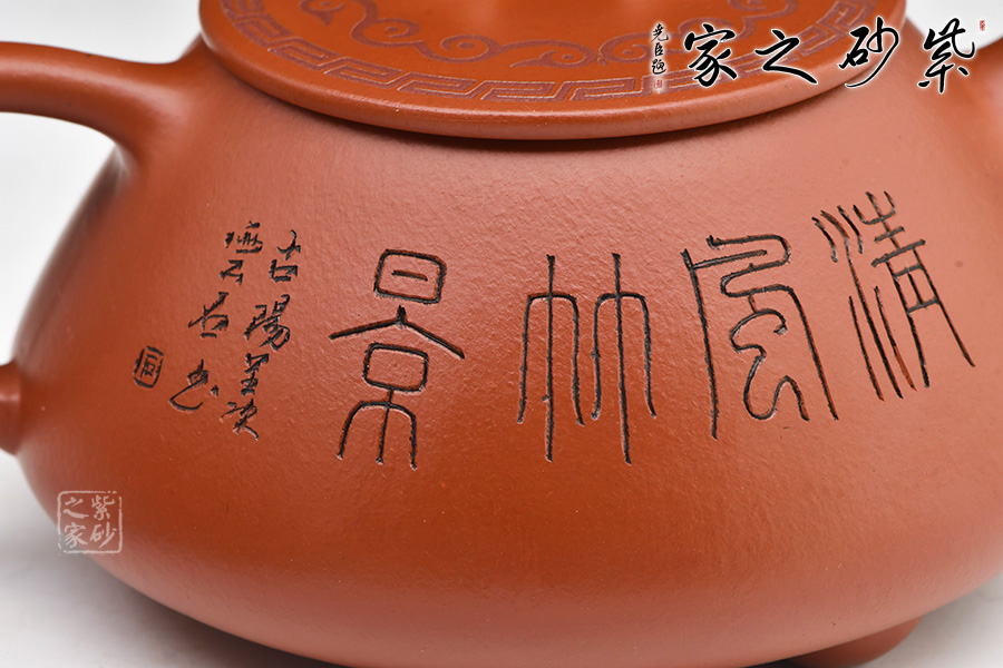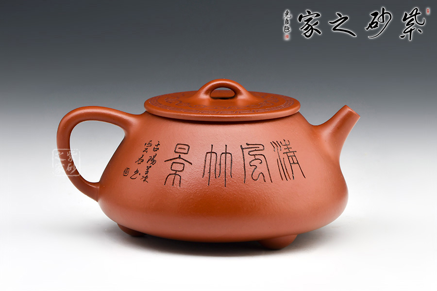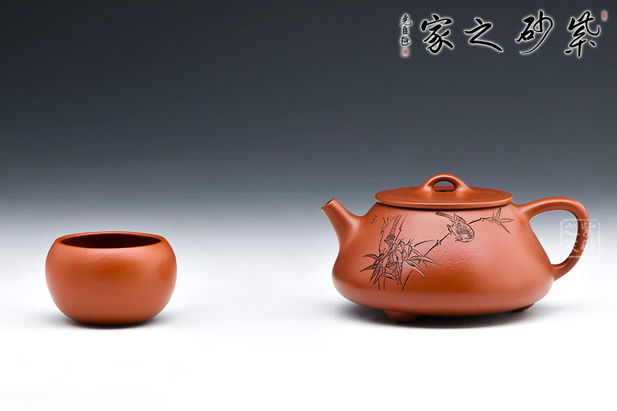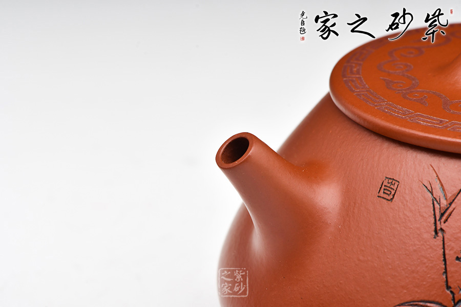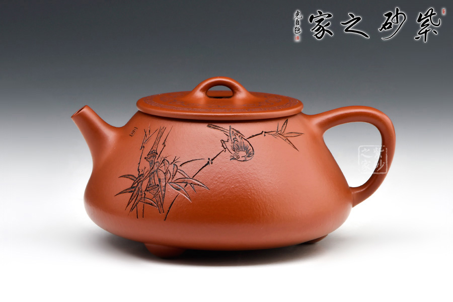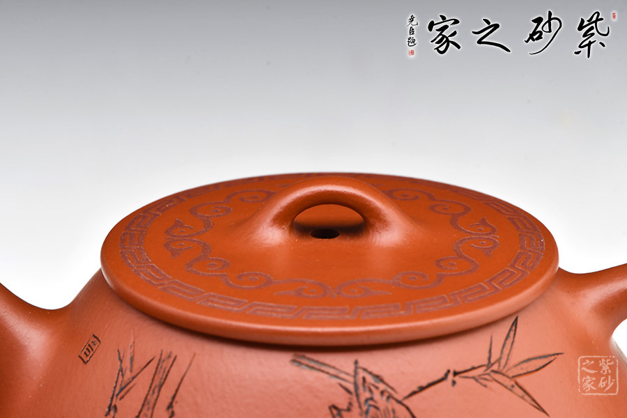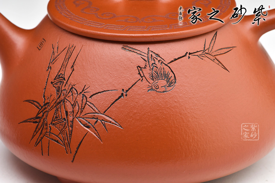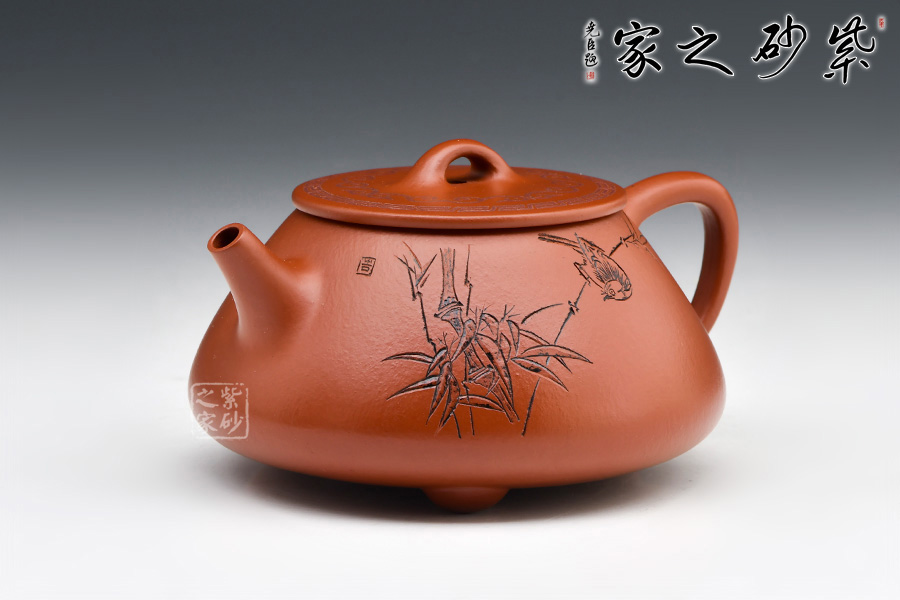 這是一款經(jīng)典的石瓢壺。原礦朱泥制成,整款器型非常到位,石瓢挺俊之美,淋漓盡致,整個壺身呈“金字塔”形,由于重心下垂使用很穩(wěn)當(dāng),更具有極大的觀賞性。壺身與壺底的銜接,轉(zhuǎn)折恰到好處,精神又不失銳氣。流把鈕均為暗接手法,與壺身宛若一體。流把張弛有度,比例恰到好處。壺鈕采用常見的拱橋造型,使整款壺在簡單中多了一份活力,壺蓋與壺身嚴絲密縫使此壺具有極高的實用性。竹枝鳥鳴,自然和諧,更添收藏觀賞價值。