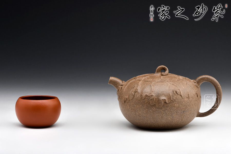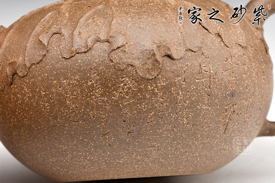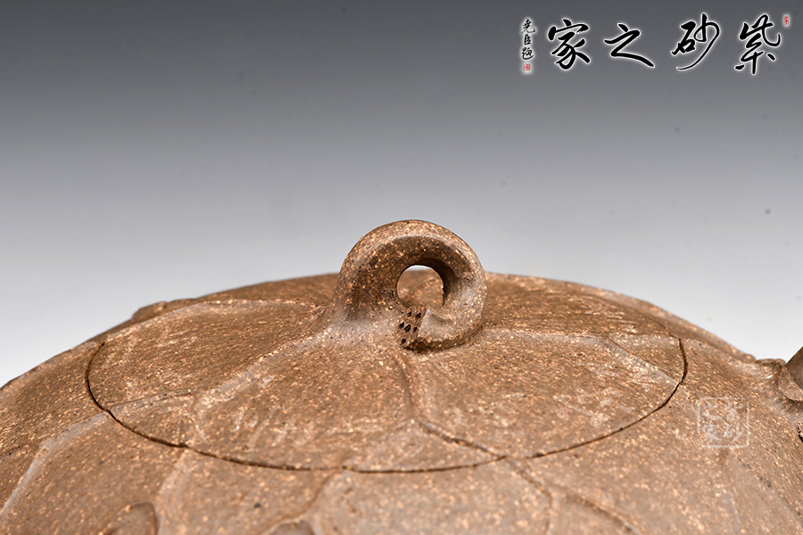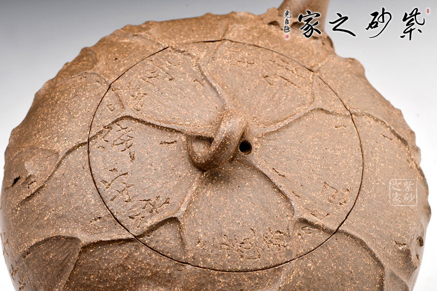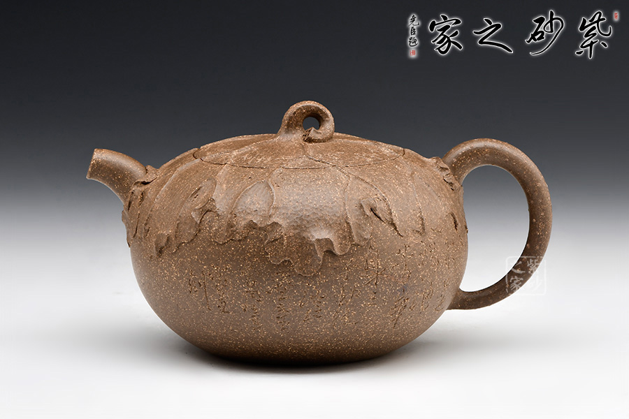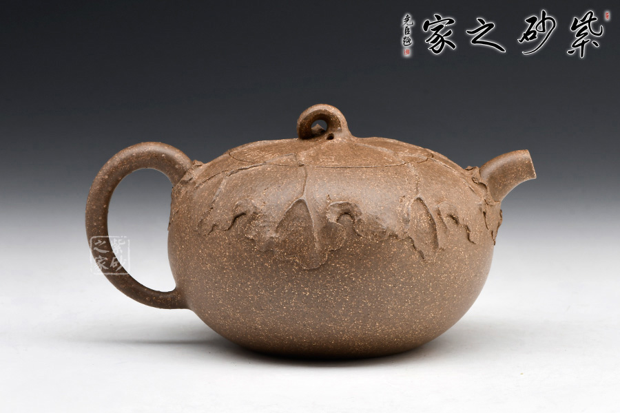 老段泥制作。圓潤的壺身,短彎的壺流,纖細(xì)的壺把,嵌蓋,不規(guī)則圓鈕。從上往下俯視,一片荷葉包裹壺身,荷桿作鈕。荷葉面紋路起伏有致,自成規(guī)律,風(fēng)采倍添。