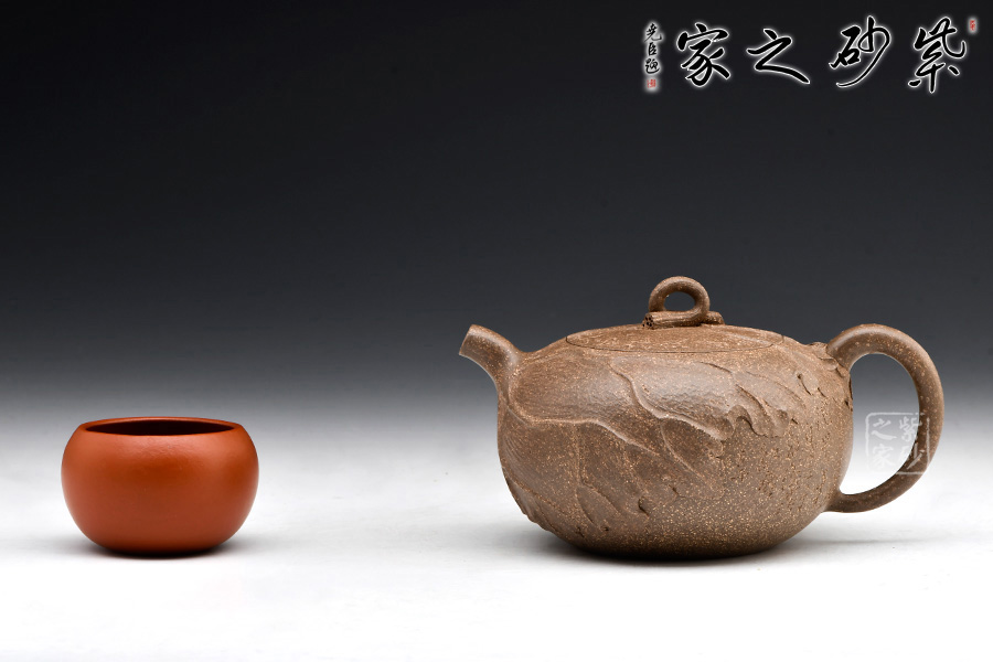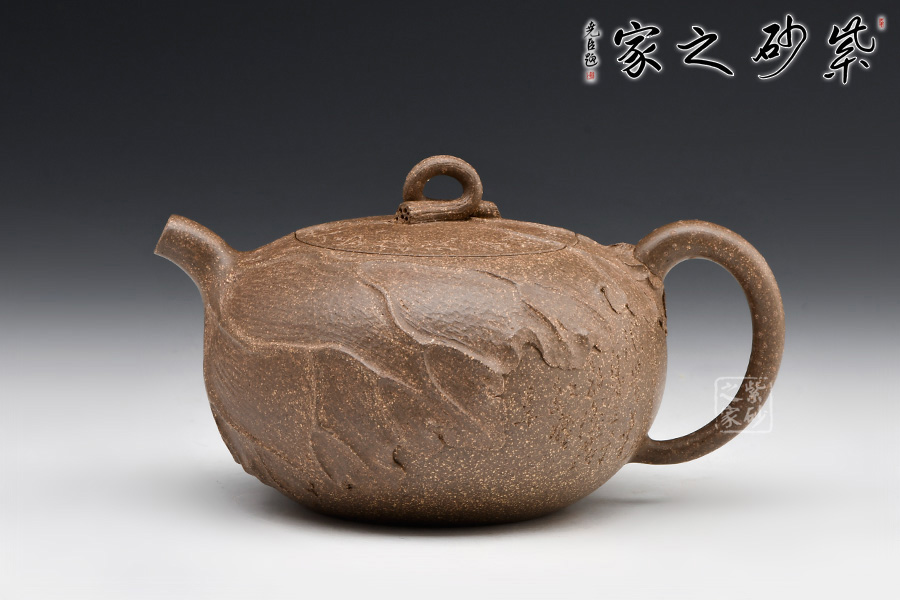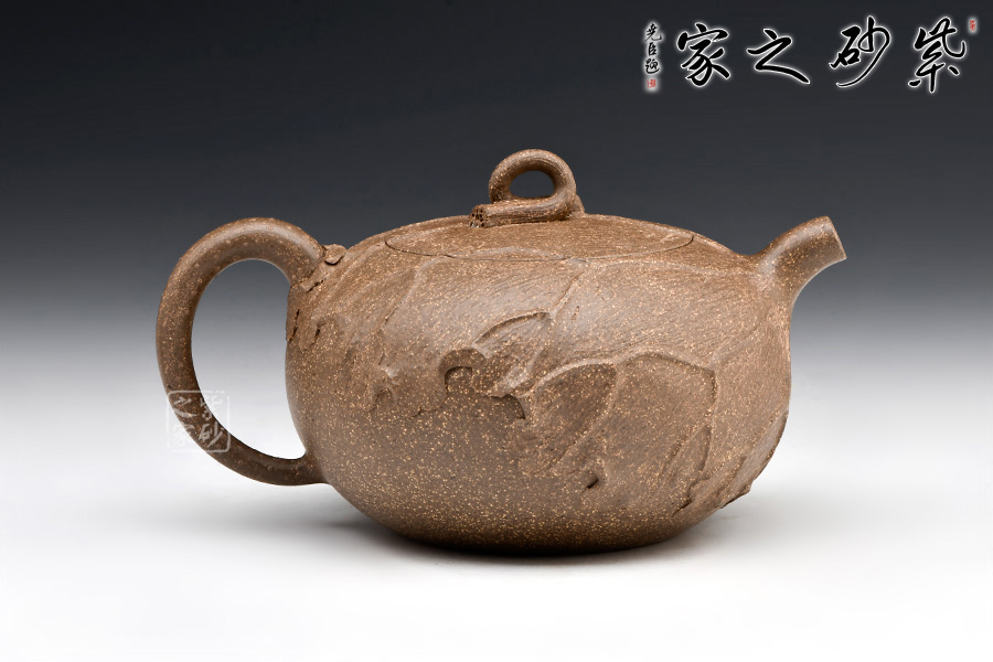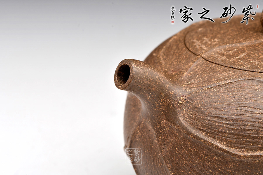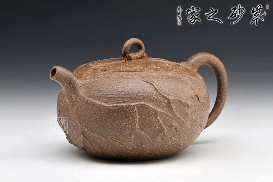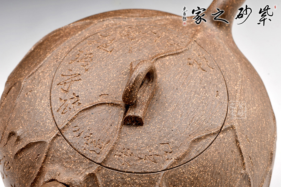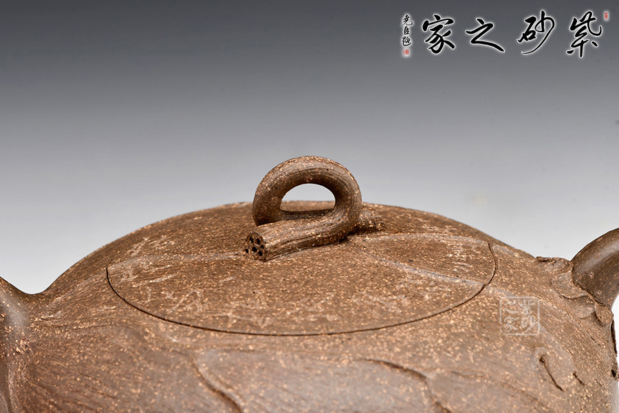 老段泥制作。圓潤的壺身,短彎的壺流,纖細的壺把,嵌蓋,不規(guī)則圓鈕。從壺嘴往壺把看去,一片荷葉包裹壺身,荷桿作鈕。荷葉面紋路起伏有致,自成規(guī)律,風采倍添。
