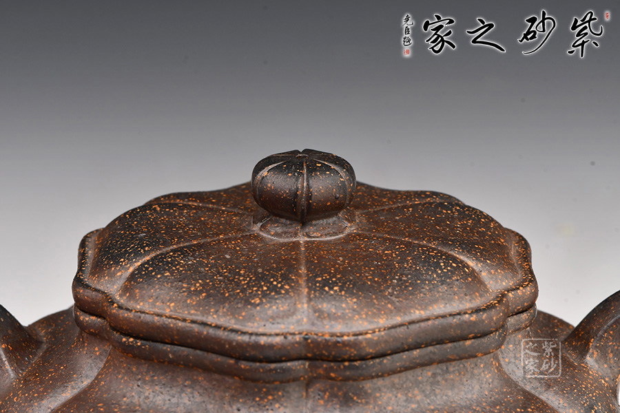 邵立平老師所制葵仿古壺,以紫玉金砂為料,以六菱葵瓣為圖案。整壺筋紋起線,如一朵盛開的葵花,熱烈而奔放。壺鈕似嫩葉托起的花苞,羞澀待放,生命的活力與勃勃生機(jī)展露無遺。