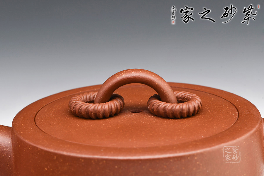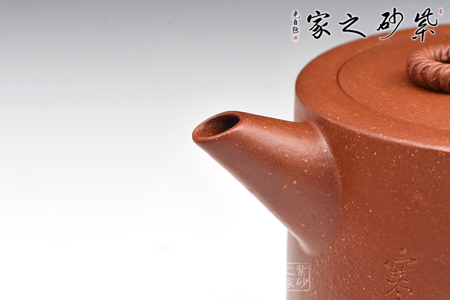 整個(gè)壺乃是一個(gè)簡(jiǎn)單的柱形身桶勾勒而成,橋鈕根部?jī)蓚€(gè)圓圈,乃是“雙圈”之名由來(lái),與一些壺不同的是,且雙圈上螺旋的紋路細(xì)密。嵌蓋與壺肩平整吻合,更覺(jué)壺體渾然一體。三彎流胥出強(qiáng)悍勁道,嘴頭齊整,并無(wú)收縮,一門悍流噴薄而出,氣勢(shì)龐大。大耳形圈把略微呈方形,拿捏得手,倒水方便。