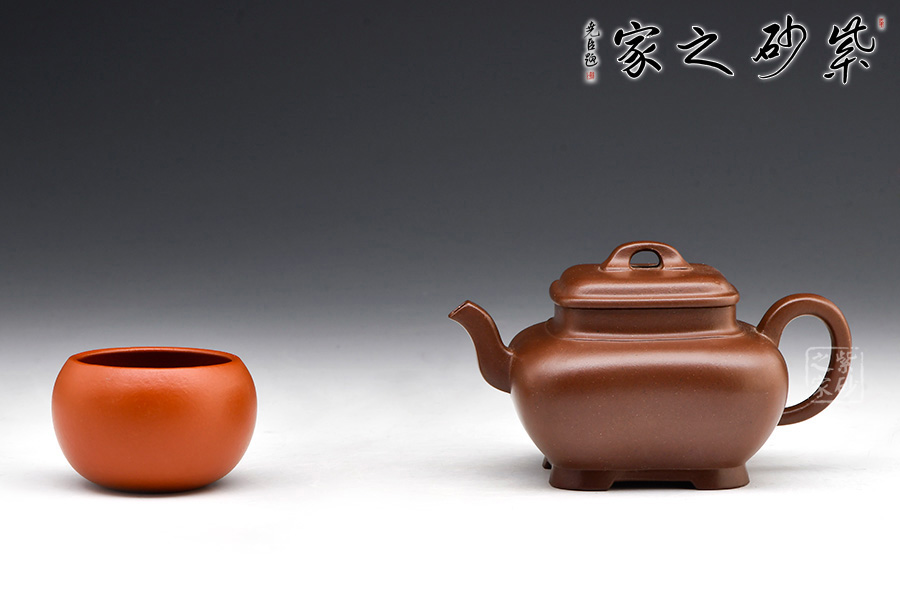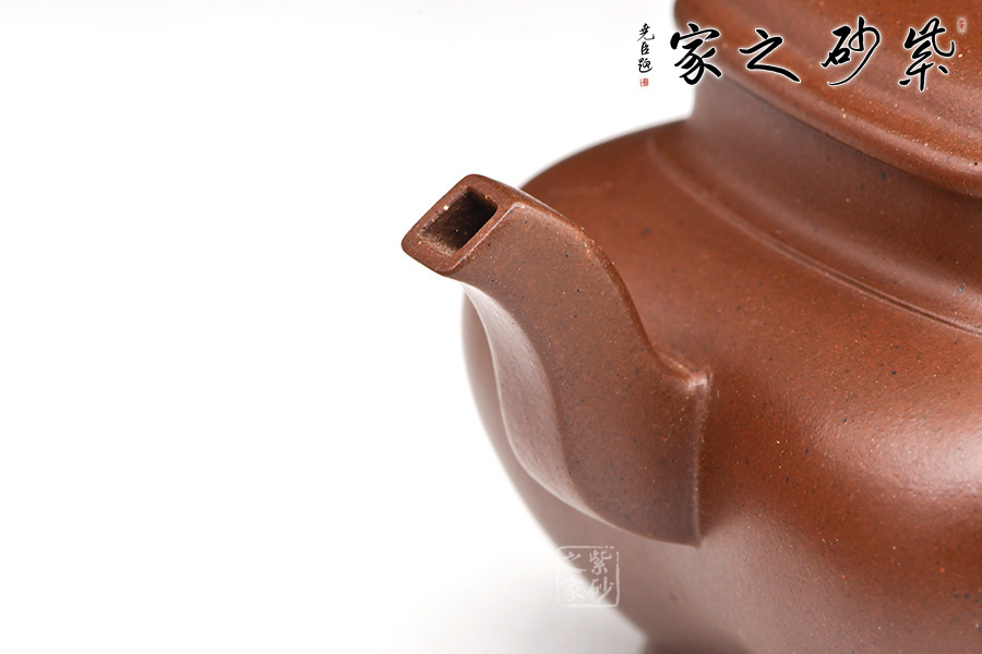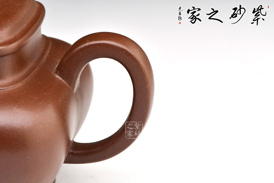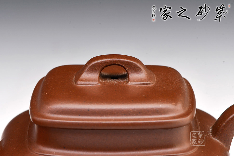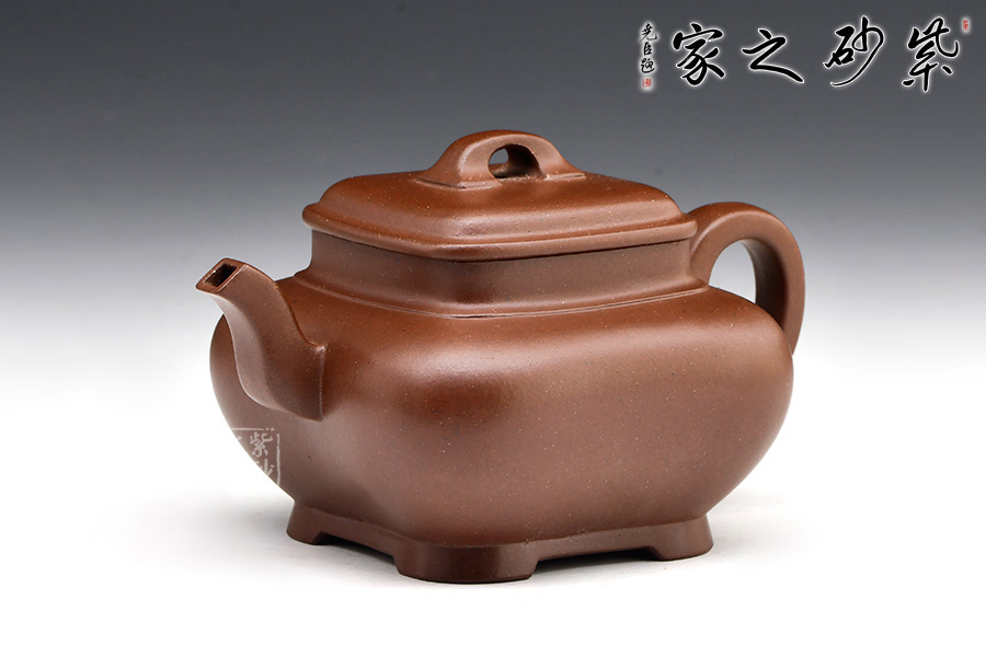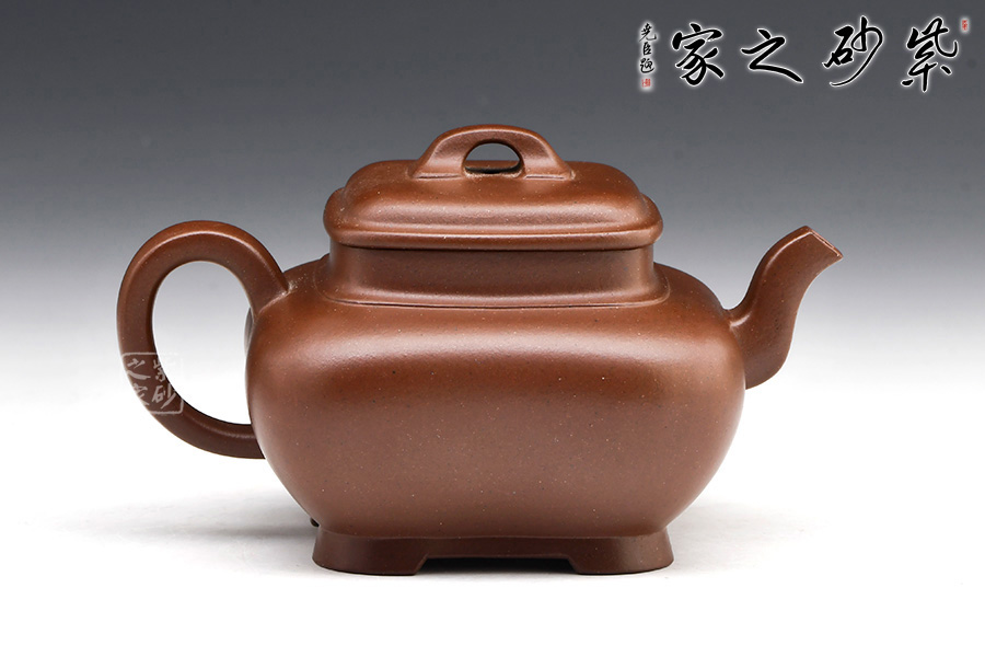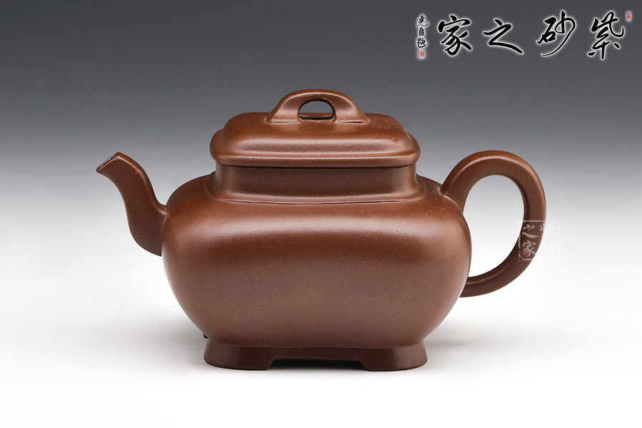 壺身為四方造型,略顯扁圓狀,矮而敦實。壺底四足,呈犴門狀,尤顯渾厚有力。彎嘴胥出,耳形把隨身勢。高頸,子母線壓蓋設(shè)計,四方蓋,如意橋形鈕與壺身呼應(yīng),表現(xiàn)出如意吉祥的寓意來。