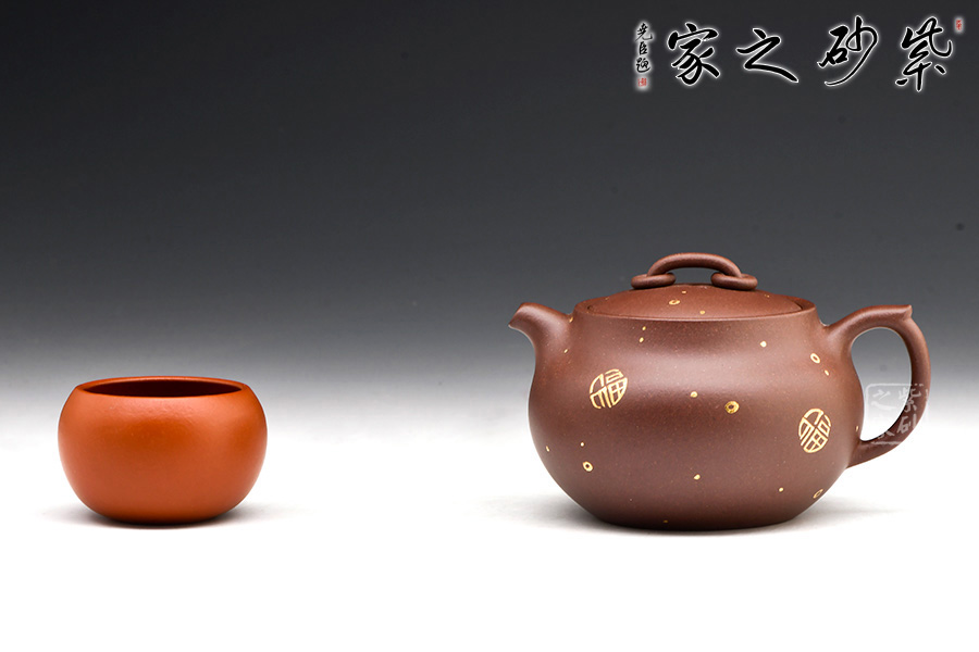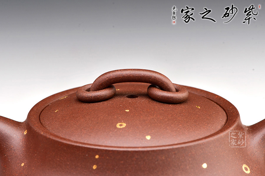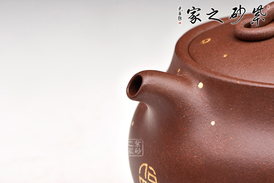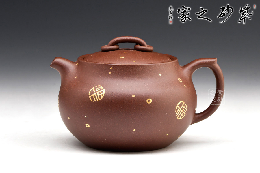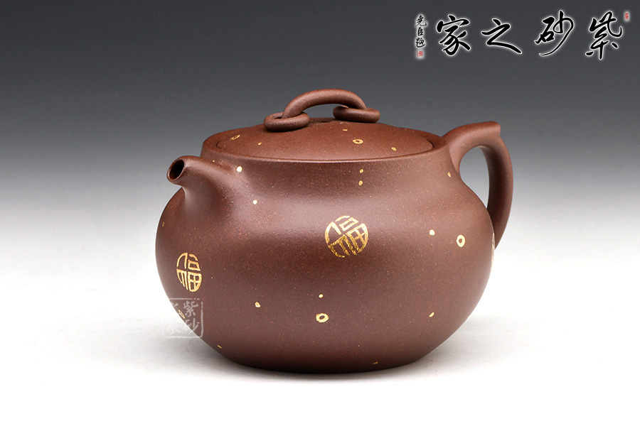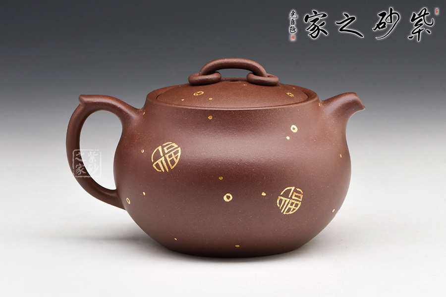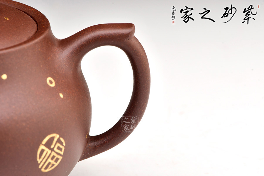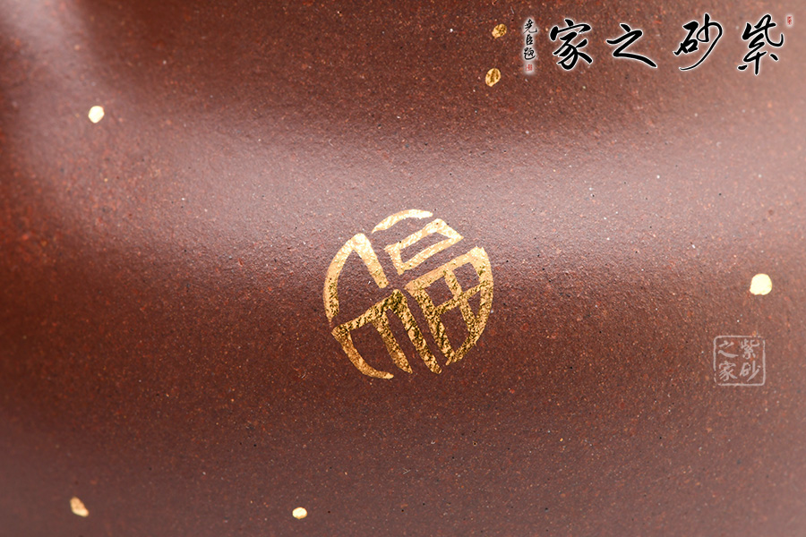 選用優(yōu)質(zhì)泥料原礦紫泥制作,簡約大氣的器型,精湛的工藝加工,尤其是嵌蓋獨具一格,橋型鈕上雙圈,撥弄之下發(fā)出叮鈴清音,悅耳動聽。描金的“?!弊?,賦予了納福壺豐富的內(nèi)涵、美好的寓意。