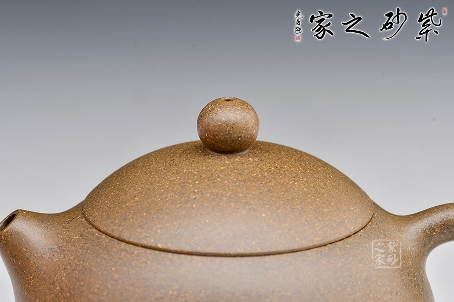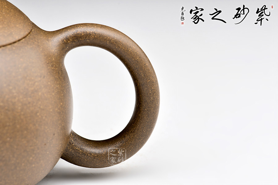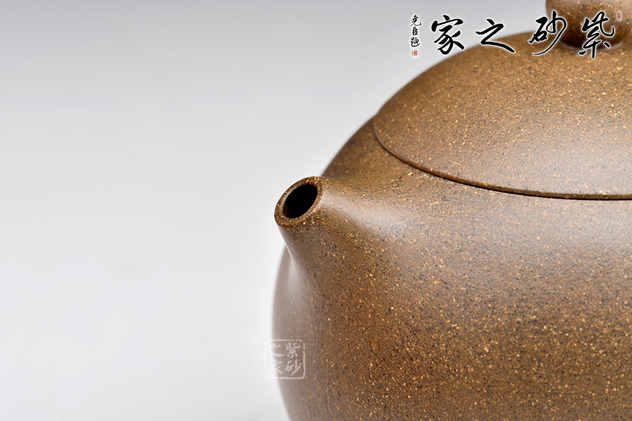 整壺圓潤(rùn),上斂下豐。截蓋與身合融,氣密性好;蓋上一寶珠鈕,拿捏舒適;倒把線(xiàn)條上細(xì)下粗,富于變化,與短直流搭配的恰到好處。