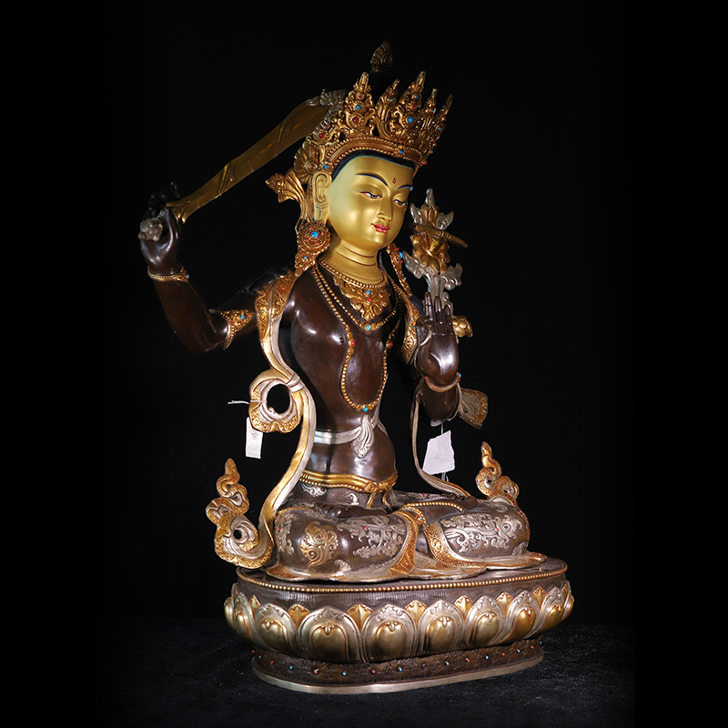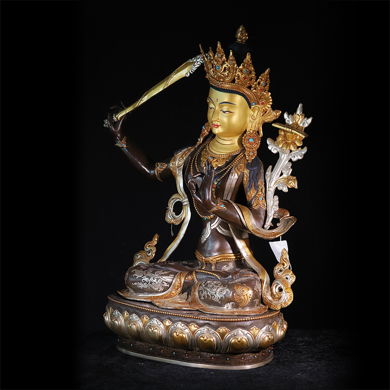 文殊菩薩為諸佛、諸菩薩之師,是大智慧的象征,智慧無雙,有開悟明智的加持力。通常手持慧劍,騎乘獅子,比喻以智慧利劍斬斷煩惱,以獅吼威風震懾魔怨。
