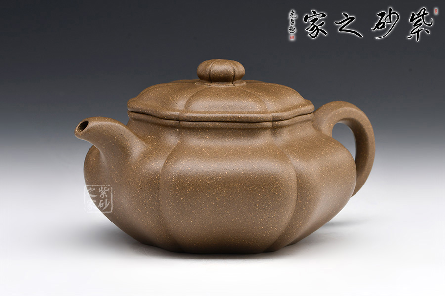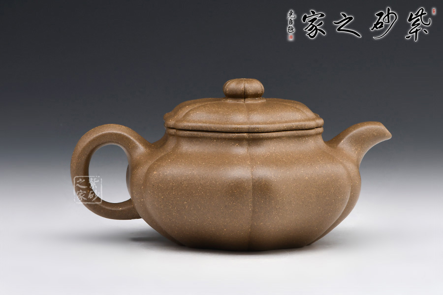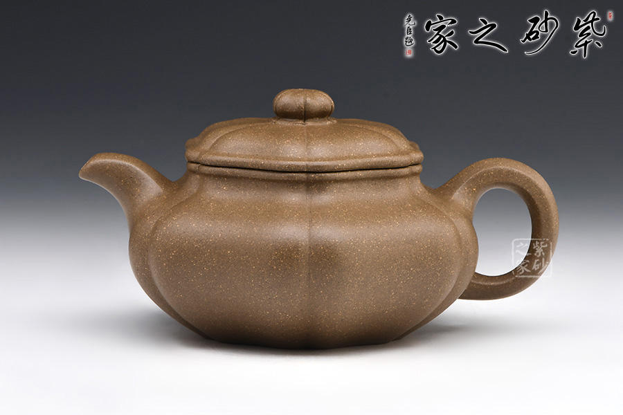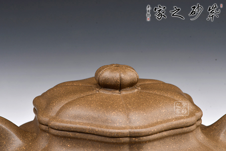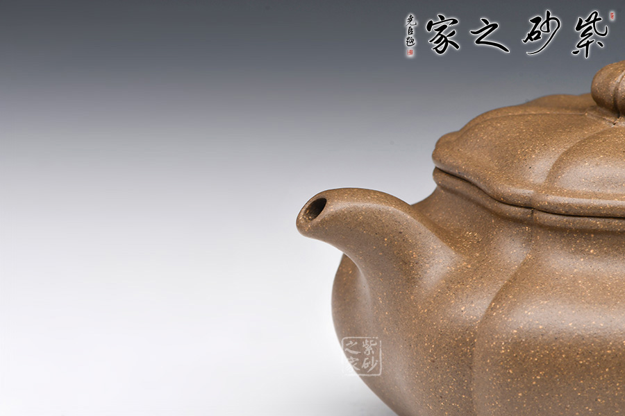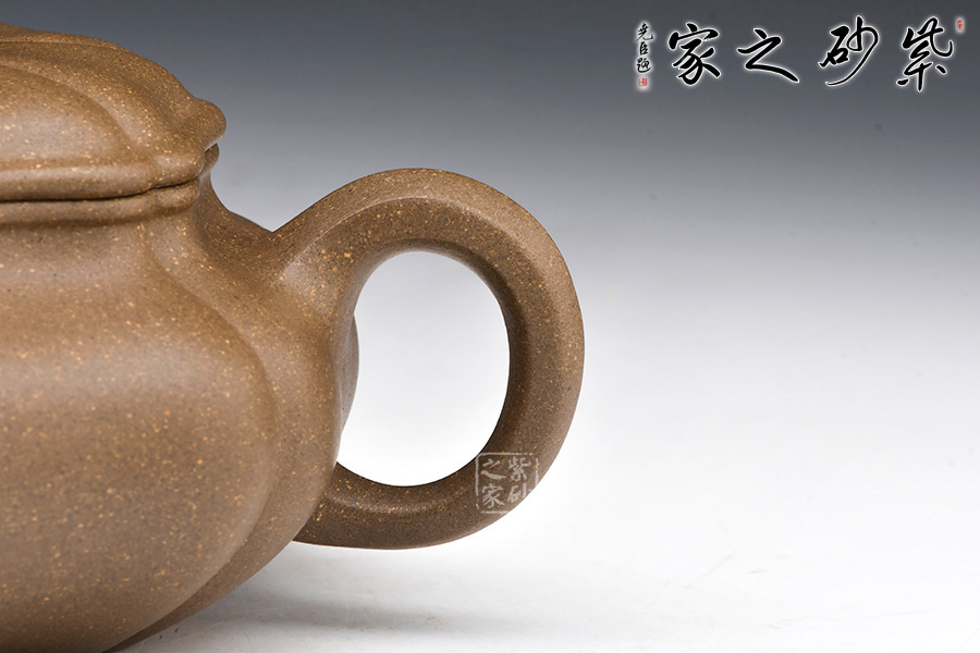 整壺器型為仿古壺,加之筋紋工藝,更顯古樸典雅。壺身略微扁圓形,肩頸襯托之下更覺壺身略扁,圓潤的壺鈕與壺身一致,應和之下韻味十足。而六條筋紋將整壺等分成6瓣,不差一毫,不失一里,拿捏有度,更見功底。一變嘴,耳形壺把隨身勢,線條流暢,比例得當,同時圓中見方,設計巧妙,力蘊十足。