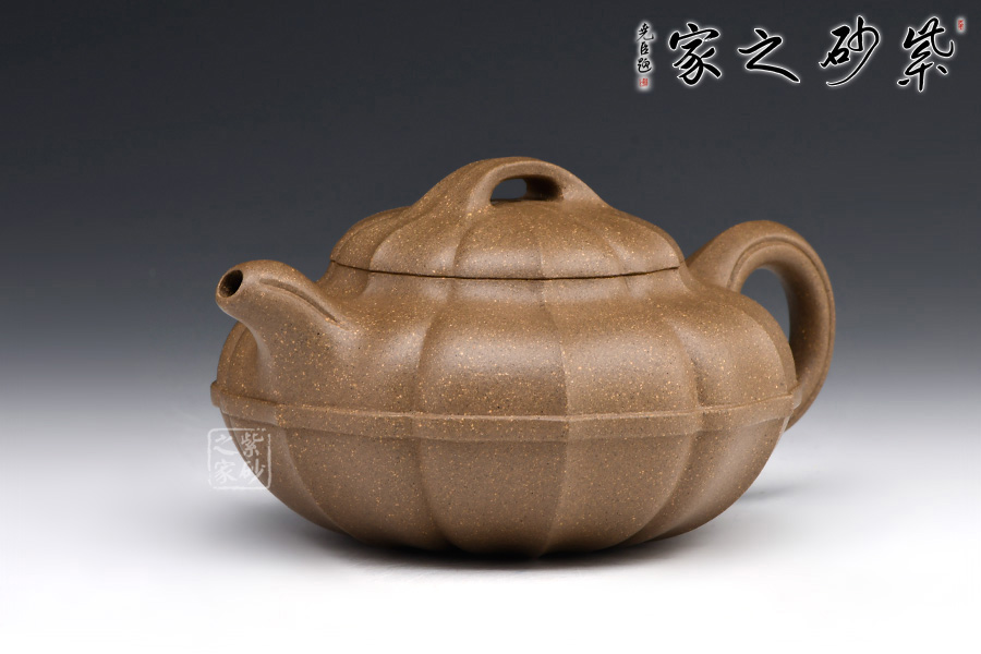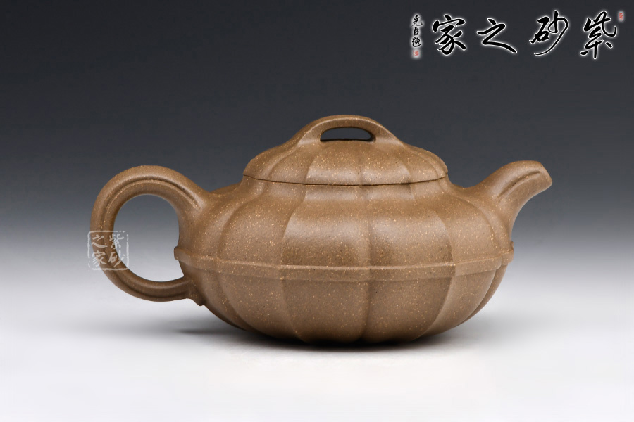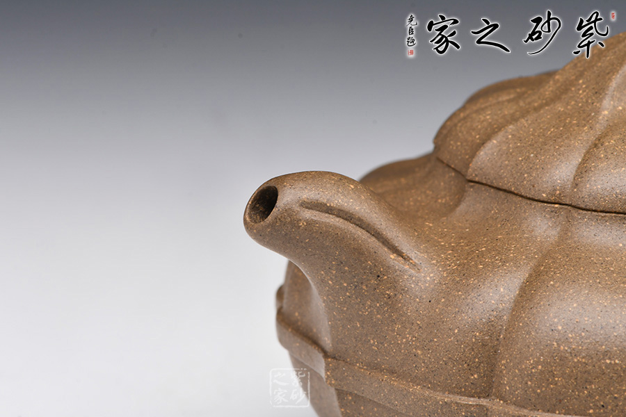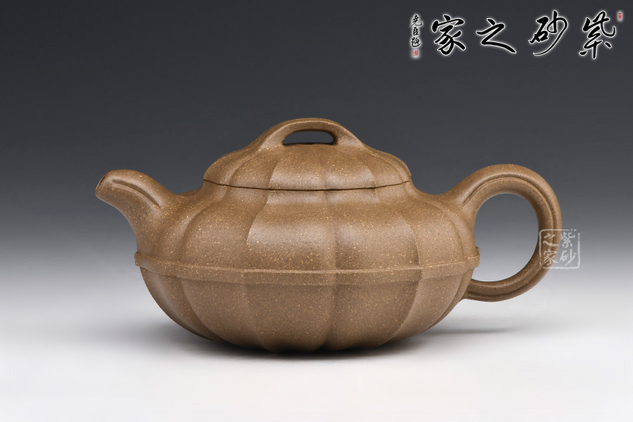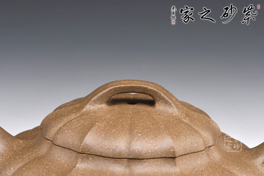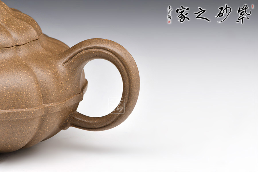 壺式由線圓壺變化而來,橋鈕與菱花瓣相融,嘴作棱花式,胥出自然,把彎曲恰體,端握方便,壺腹中央束一方腰帶,整個菱線自壺頂至壺底相交成一點,分毫不差。