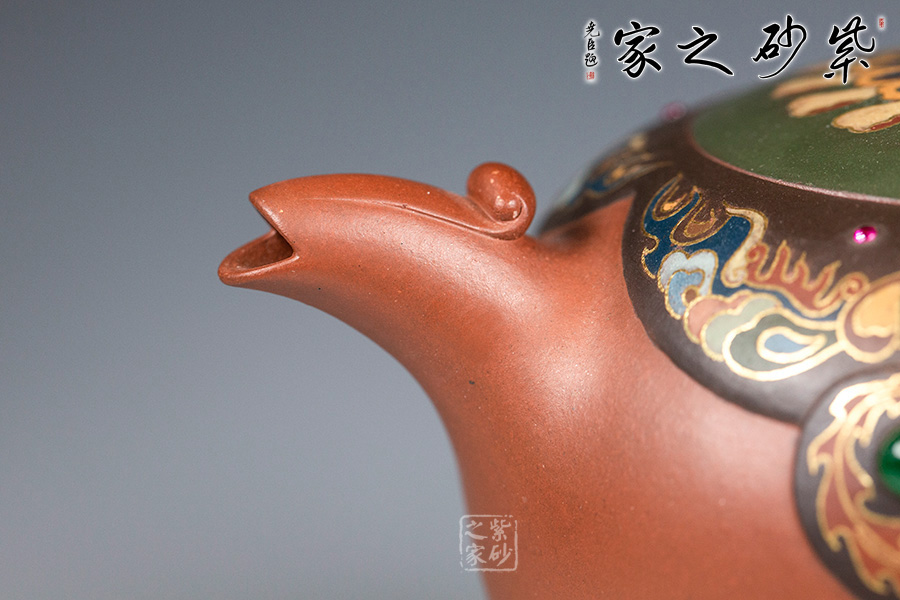 壺身高挑、修長,上圓下凹,聘婷站立。圓嵌蓋,蓋面微微拱起,正中圓潤寶珠紐。鳳首為壺嘴,鳳尾為壺把。