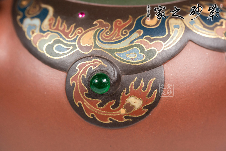 以鑲金的工藝,描繪出一幅火焰熊熊燃燒的巨畫。鑲嵌翠綠小圓珠,仿若眼睛一般。