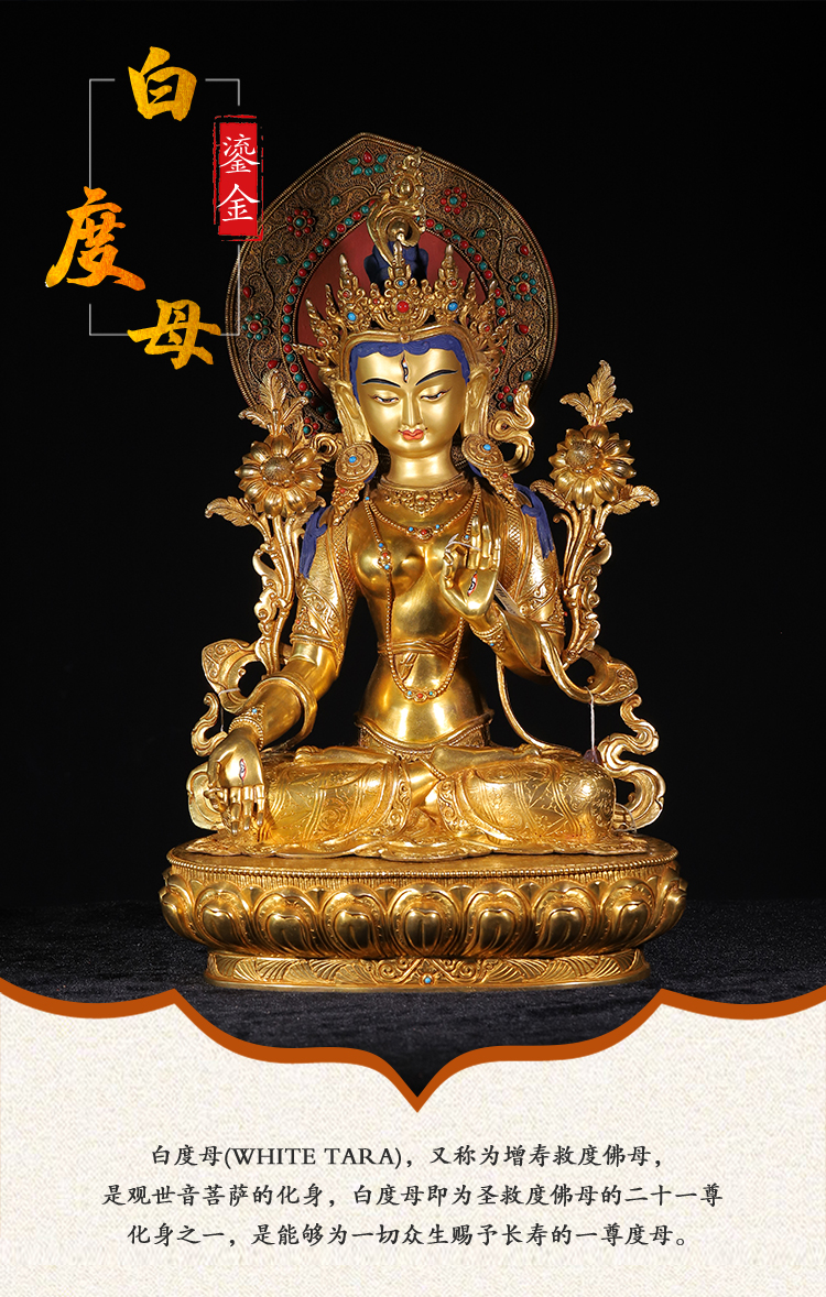 白度母(White Tara),藏音譯卓瑪嘎爾姆,又稱為增壽救度佛母,是觀世音菩薩的化身。觀世音有32種應(yīng)化身,僅其中的度母化身就可以變化為21位救度母,白度母即為圣救度佛母的二十一尊化身之一。
