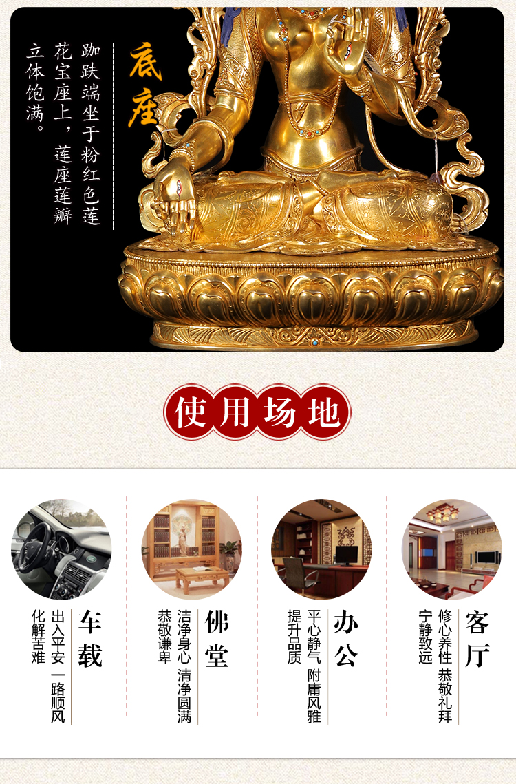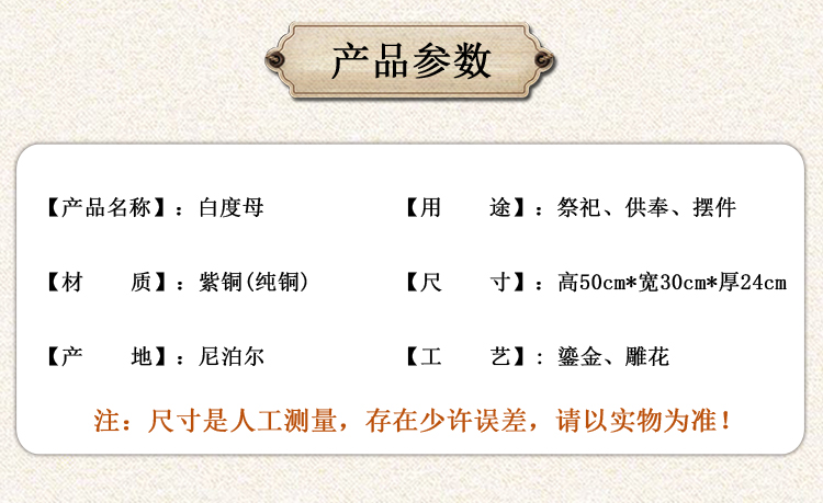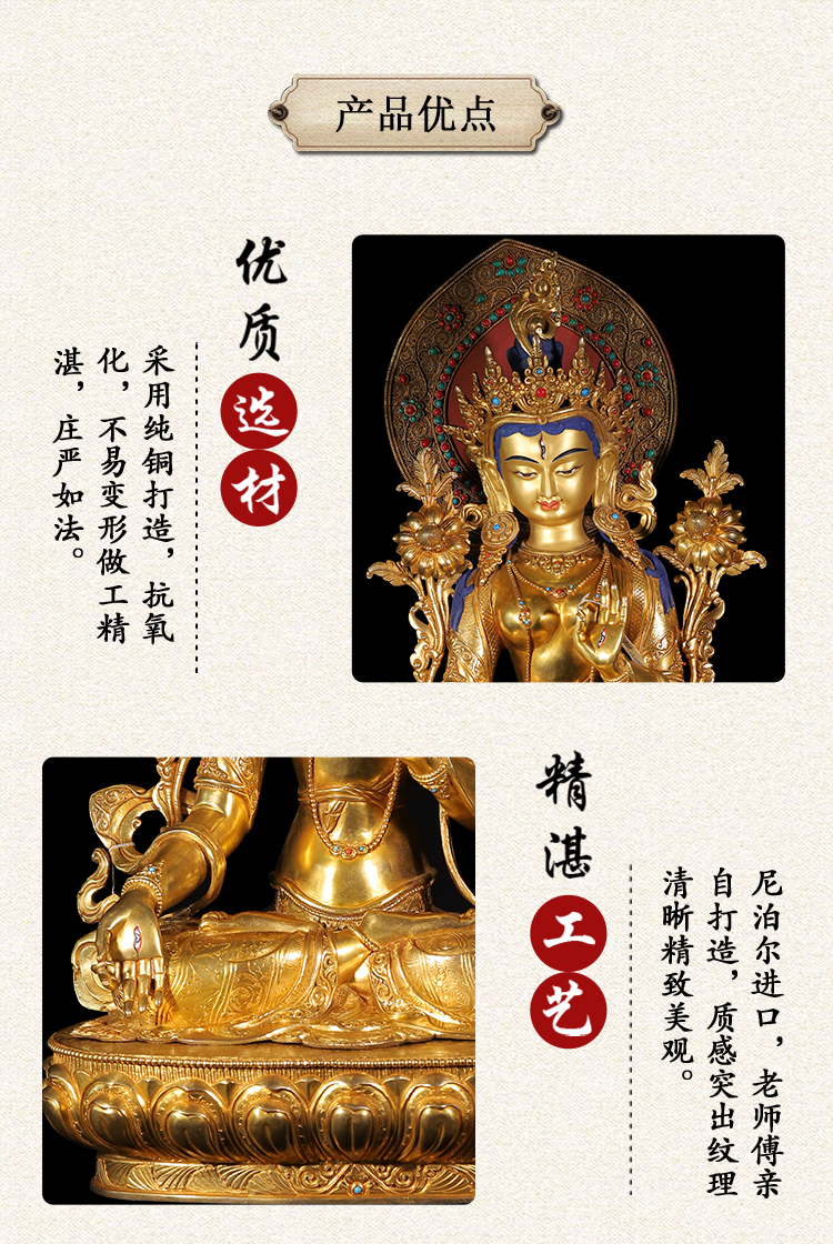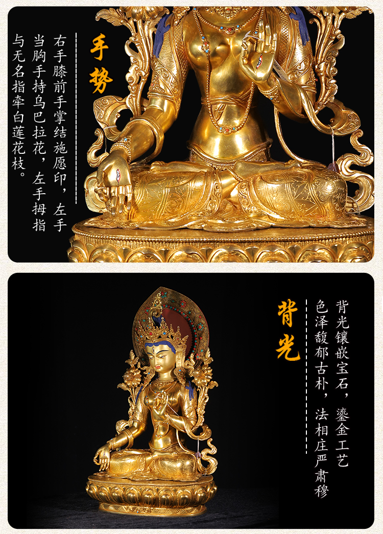 產(chǎn)地:尼泊爾 工藝:紫銅 創(chuàng)作年份:2020 題材:白度母 繪制時(shí)間:0日 尺寸:24*30*50cm 重量:0 g 材質(zhì):紫銅 使用場地: