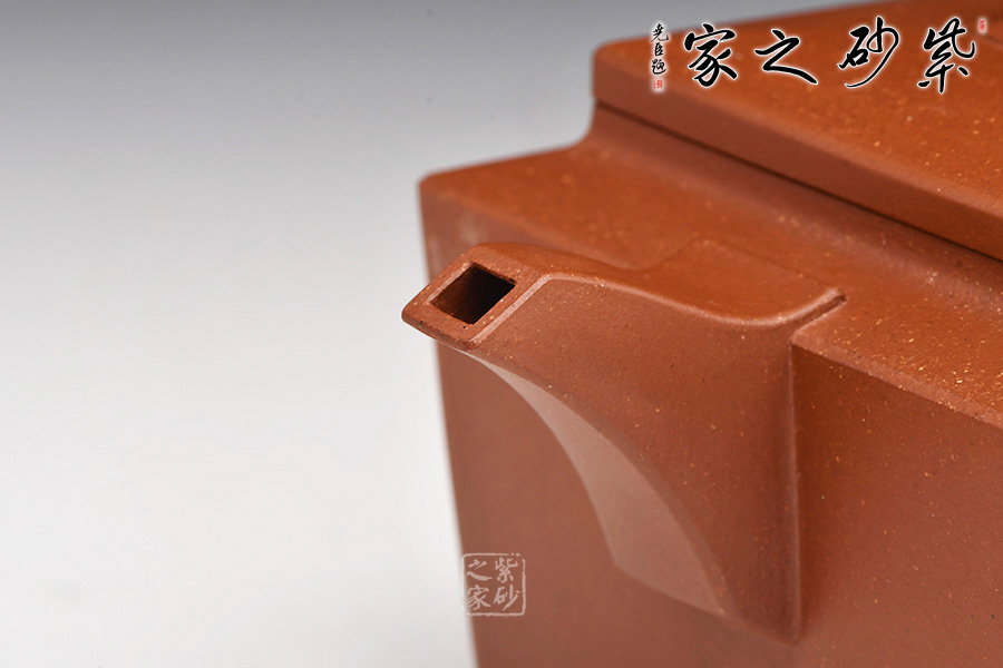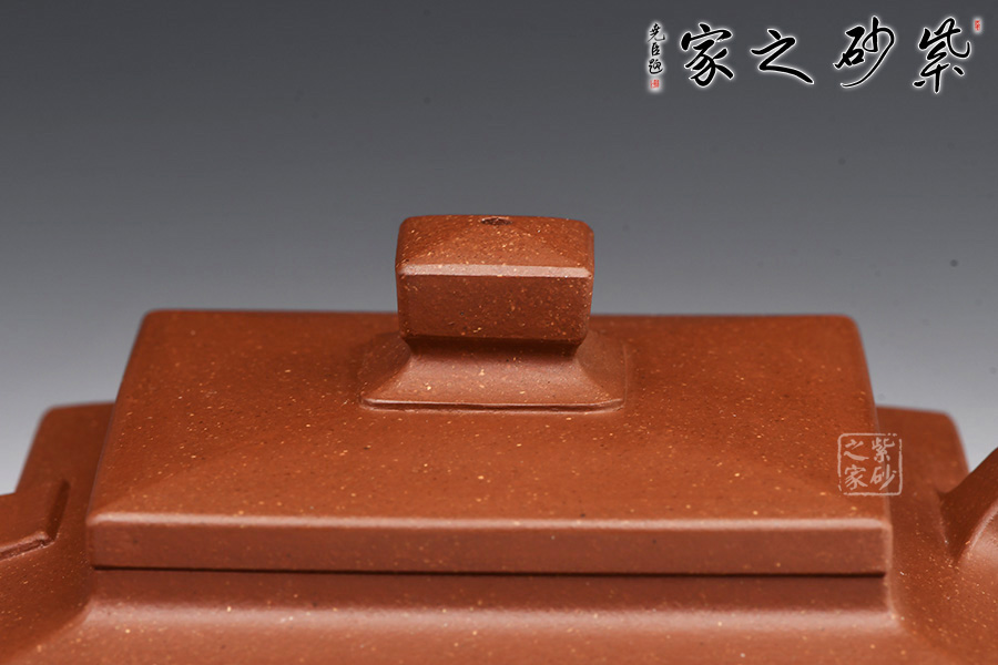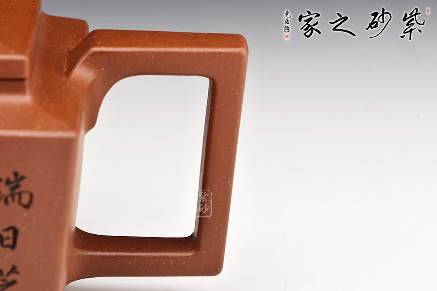 此壺四方規(guī)整,挺拔有力,方耳形壺鋬,彎壺流,四面壺身向下形成四角壺足。折角內(nèi)隱的壺足托起整壺,使壺凌空,打破方斗的沉重感,又令整器透出靈秀之氣。