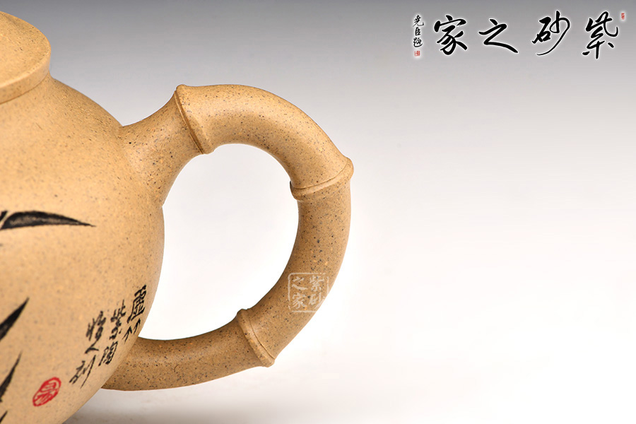 整個壺體是自然和生活的巧妙融合,壺嘴,壺鈕,壺把均是以一小節(jié)竹節(jié)彎曲而成,尤其是壺鈕,有細(xì)小竹節(jié)胥出,顯出一種生機(jī)勃勃的韻味。