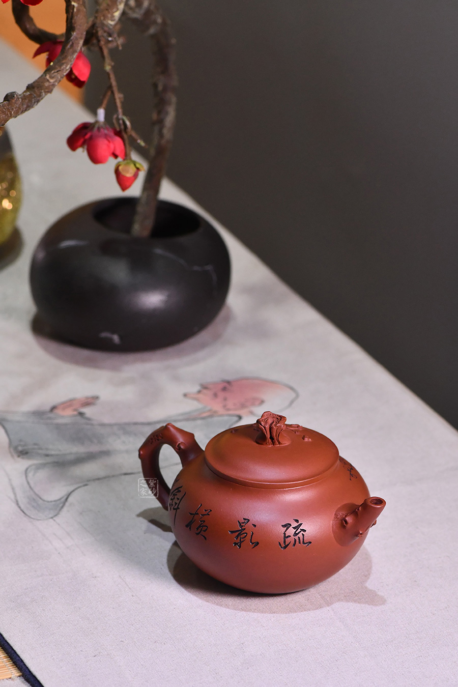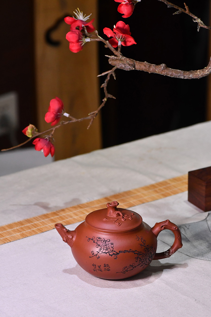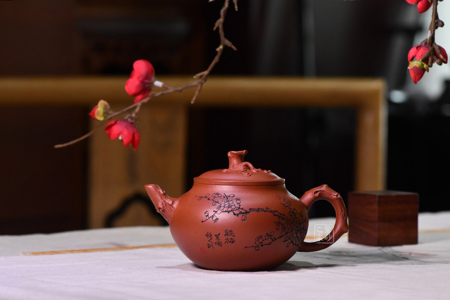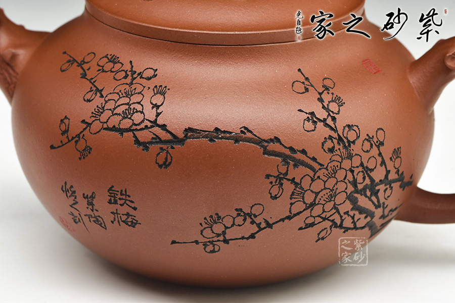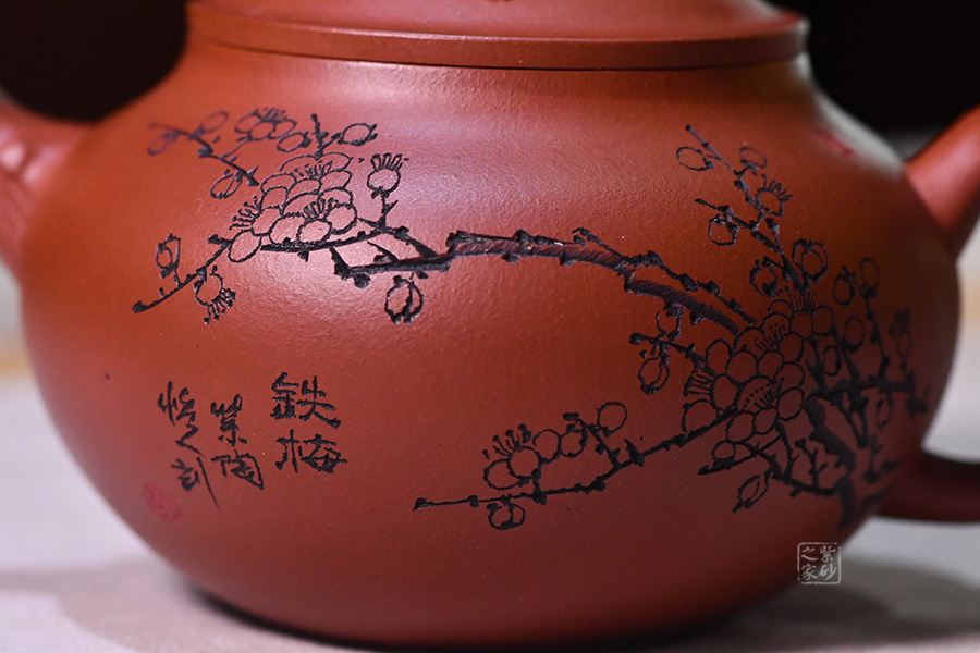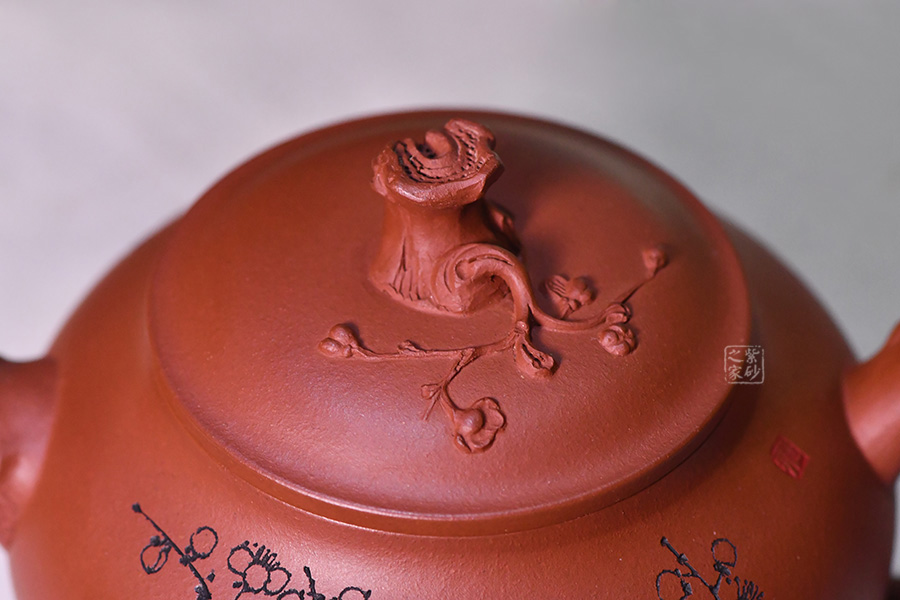 壺身圓潤光滑,滑肩,壓蓋。器型雖簡,有梅花增添其艷色,仿若有暗香來。