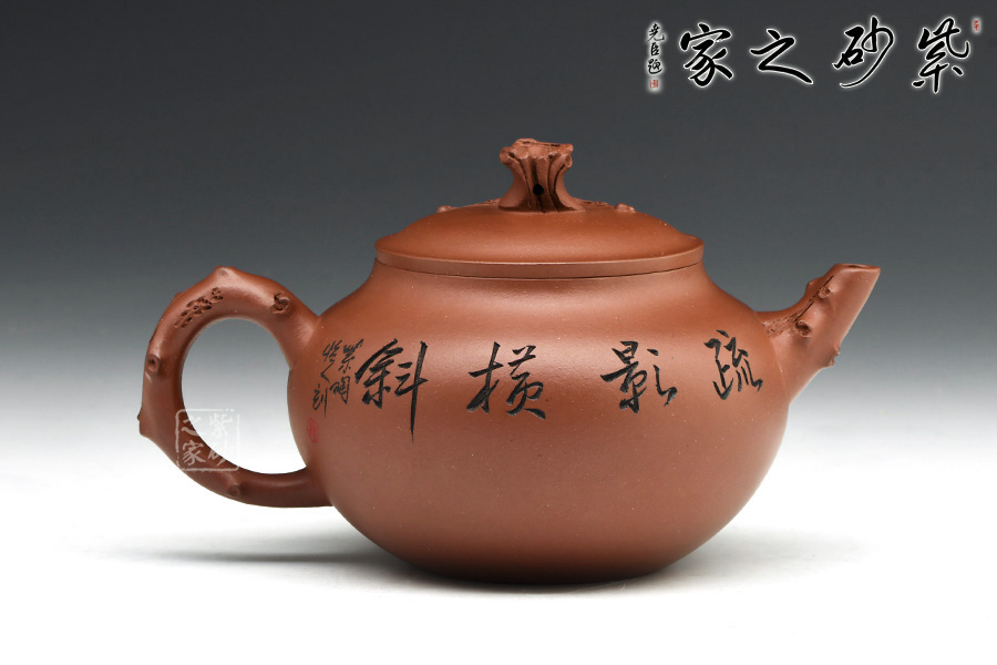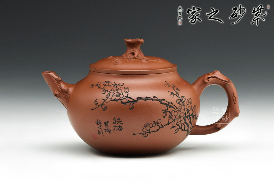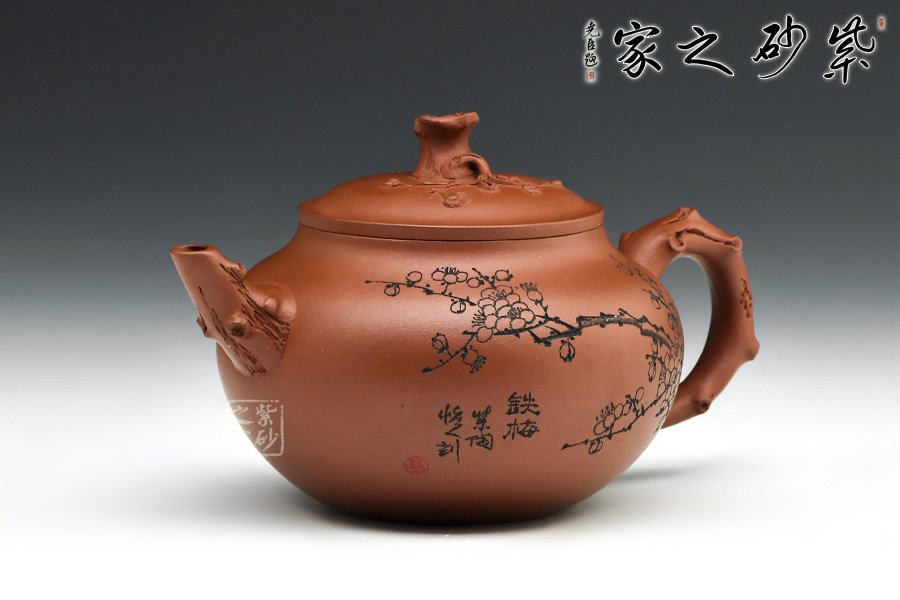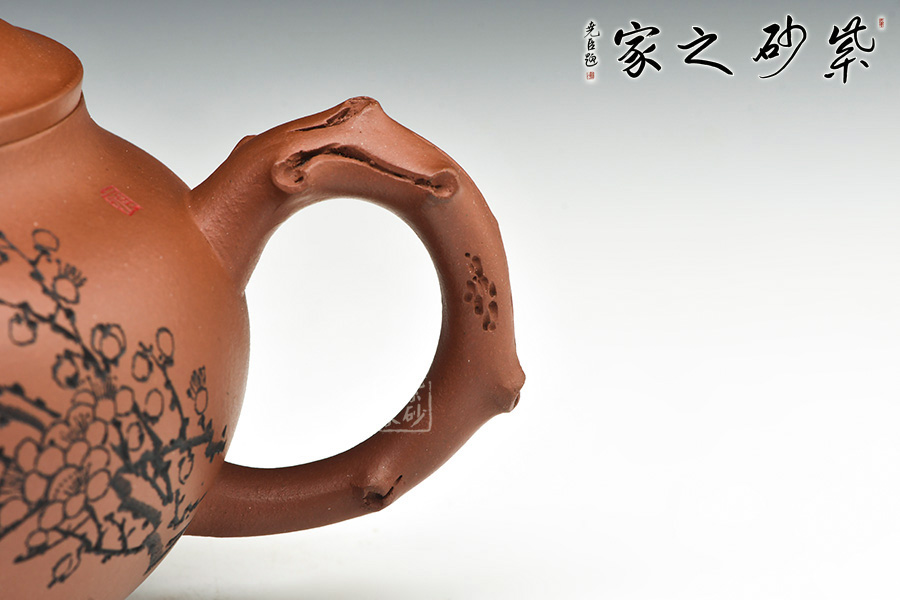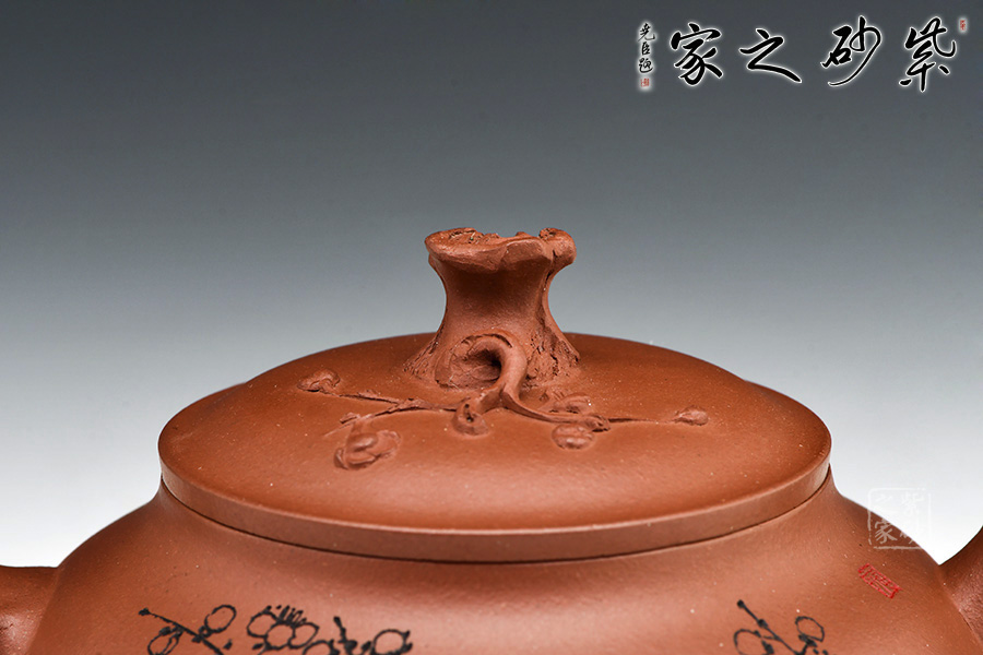整個壺體是自然和生活的巧妙融合,壺嘴,壺鈕以一節(jié)梅枝干成型,壺鈕是梅樁,有細小梅枝胥出,開出梅花,顯出一種生機勃勃的韻味。