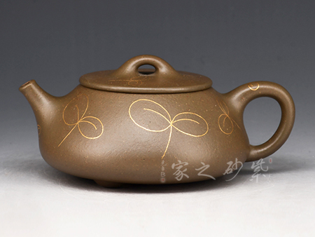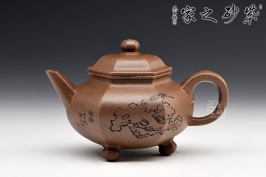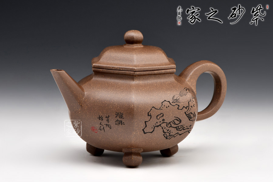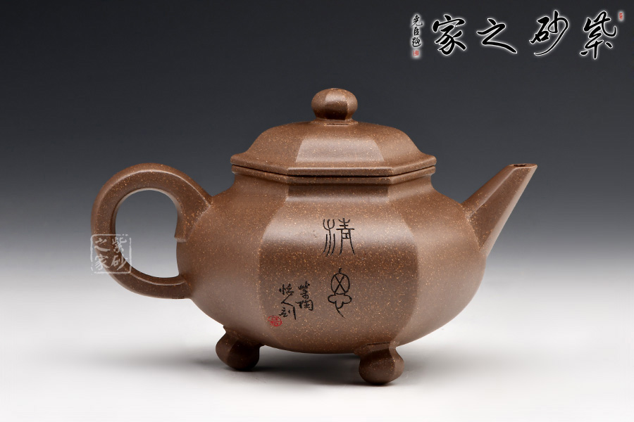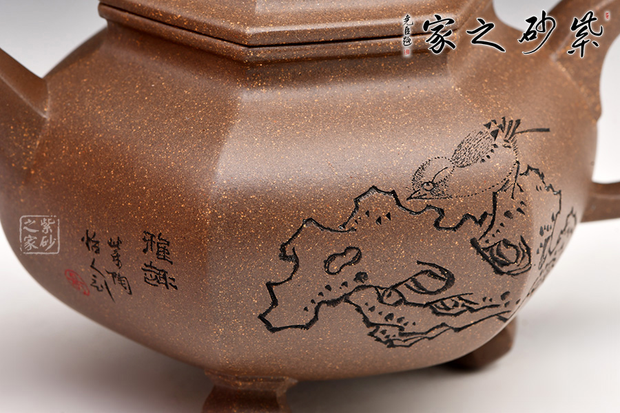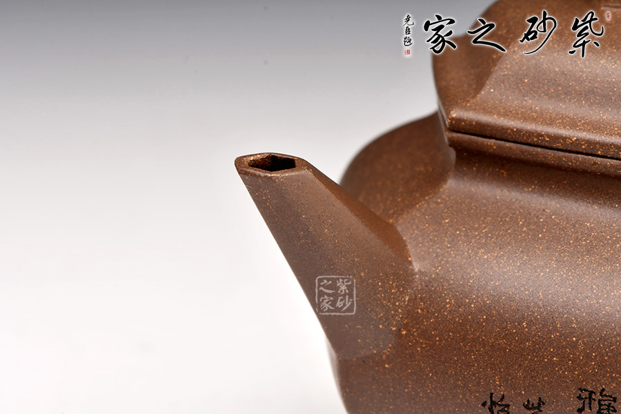 壺嘴壺把借鑒了水平壺的形態(tài),將其塑造成六方形,與壺身搭配得當(dāng),增添了輕盈之感。底部三足,沉穩(wěn)有力,穩(wěn)穩(wěn)當(dāng)當(dāng)。