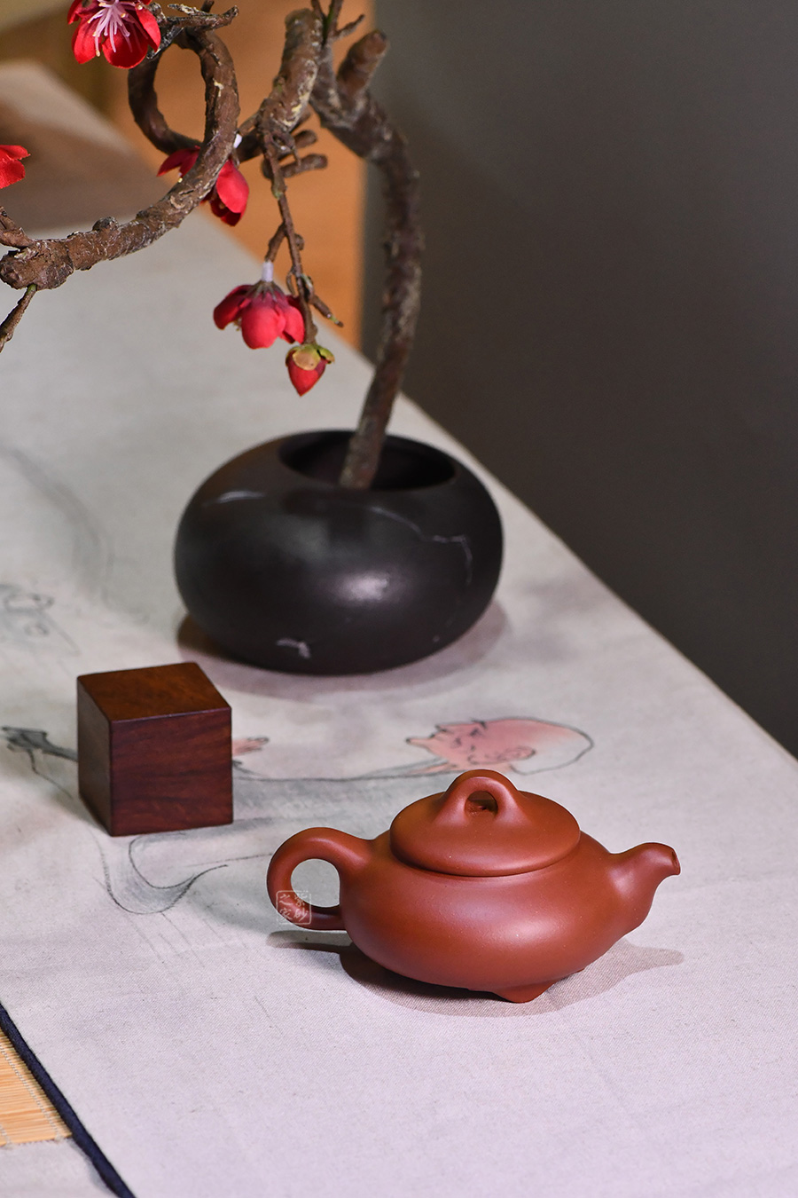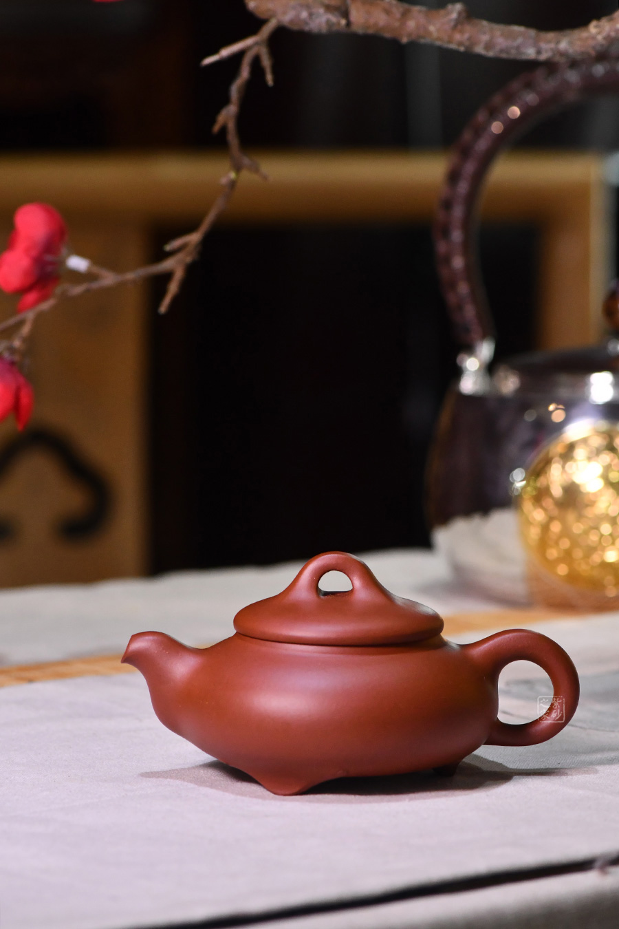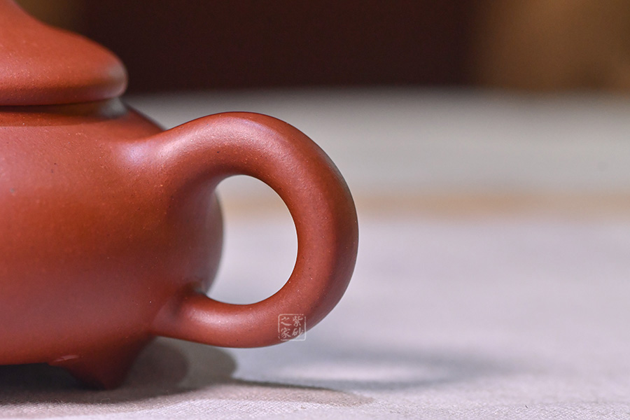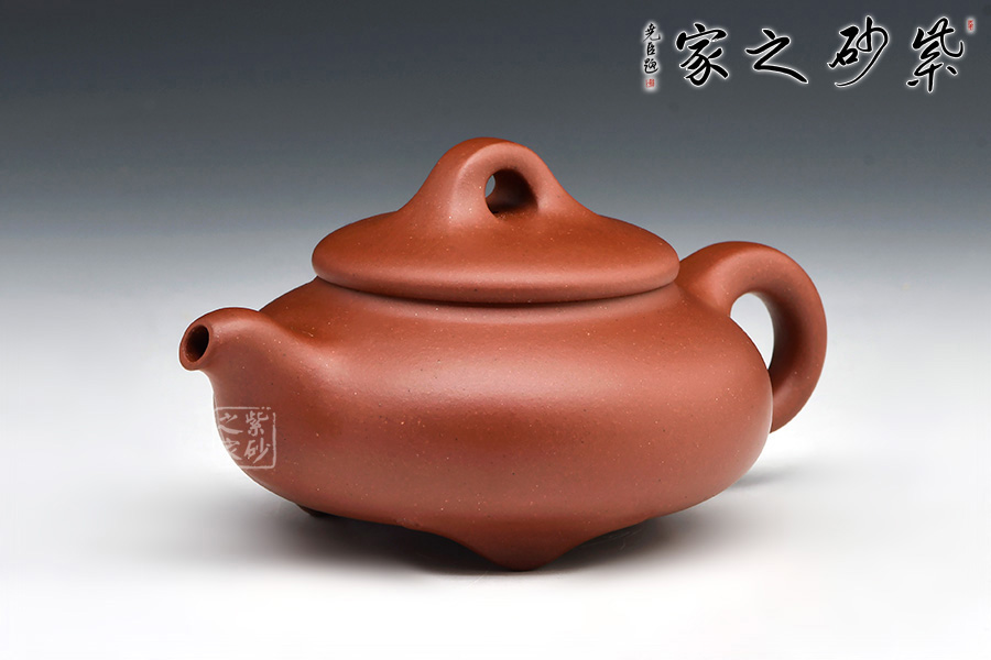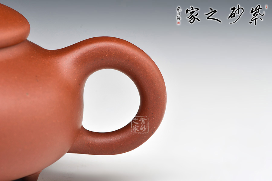 作品以小紅泥精工細作而成,泥質(zhì)細膩,壺身形狀柔美,線條豐潤。整器以矮石瓢為形,傳統(tǒng)之上又有創(chuàng)新,三足鼎立,橋鈕彎流耳把。