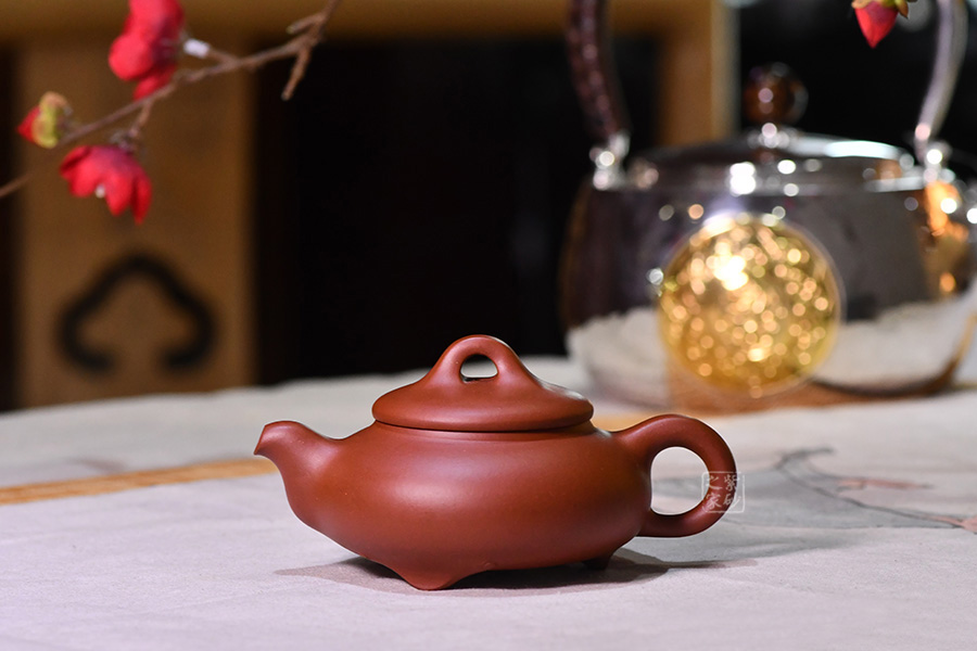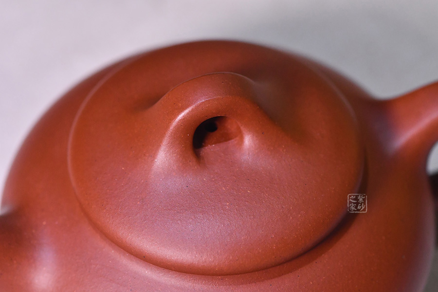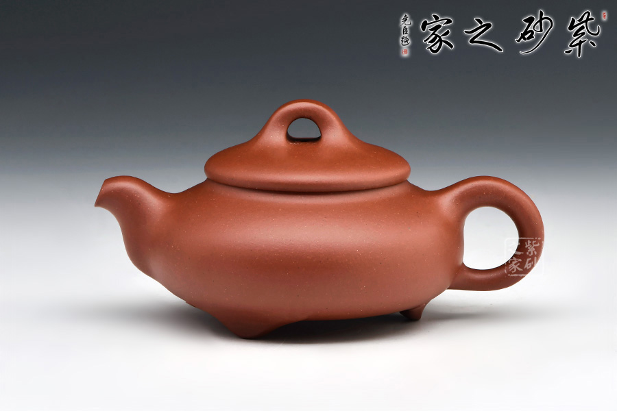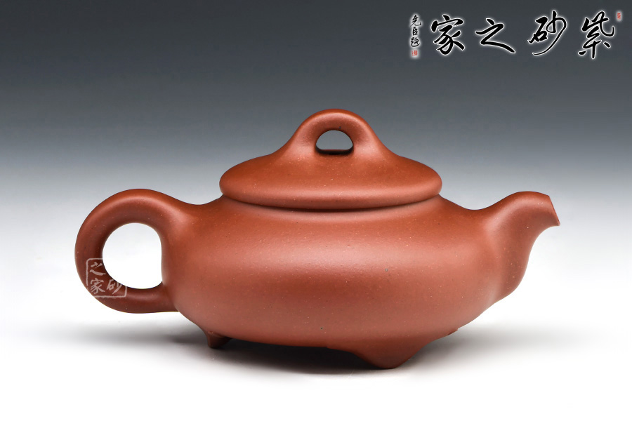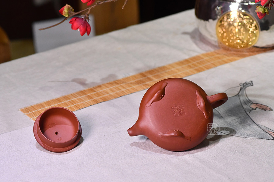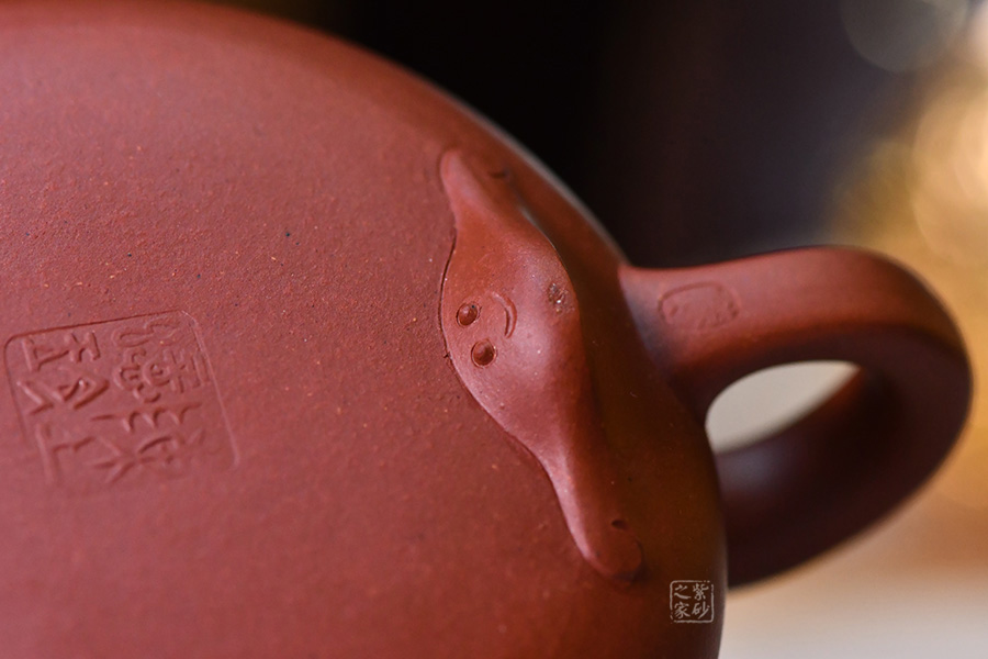 作品以小紅泥精工細作而成,泥質(zhì)細膩,壺身形狀柔美,線條豐潤。整器以矮石瓢為形,傳統(tǒng)之上又有創(chuàng)新,三足鼎立,橋鈕彎流耳把。