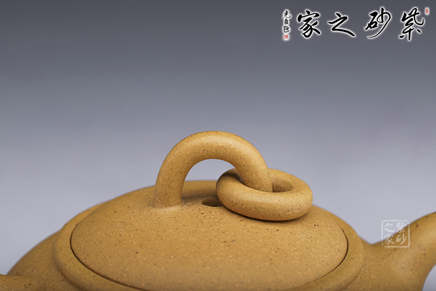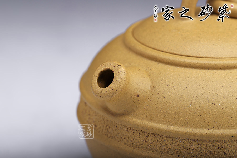 壺腰處有一條圓形德溝壑,溝壑中的泥料布滿小孔,使此壺透氣性更強(qiáng)。圓形的壺把上還夾有一顆圓珠,圓形的壺嘴做的非常短小,完美的暗接在壺身的上半部分,絲毫不顯眼。圓形壺鈕還鎖住一個(gè)圓環(huán),整把壺非常多的圓形,團(tuán)團(tuán)圓圓,寓意非常的美好。