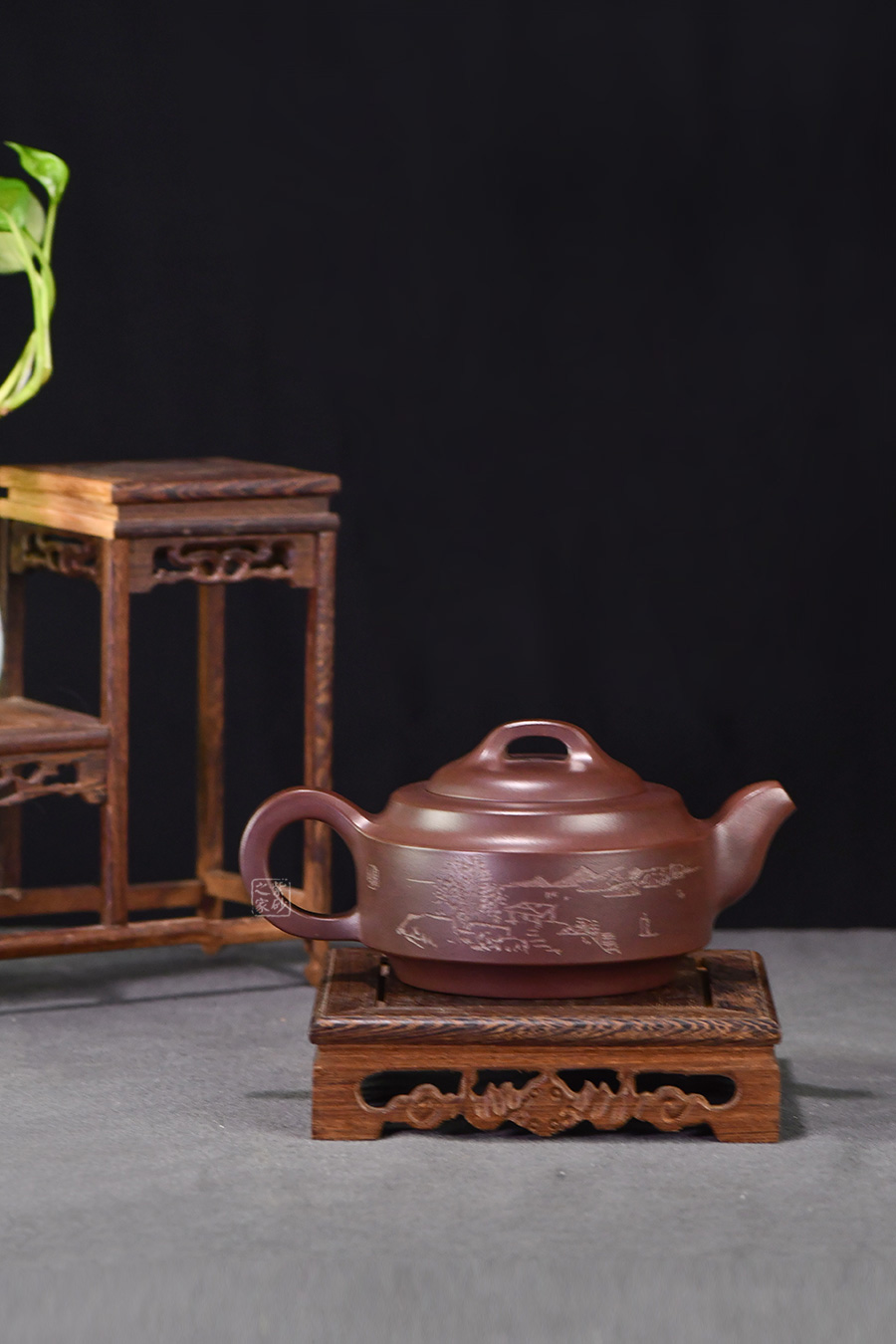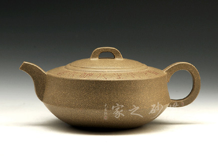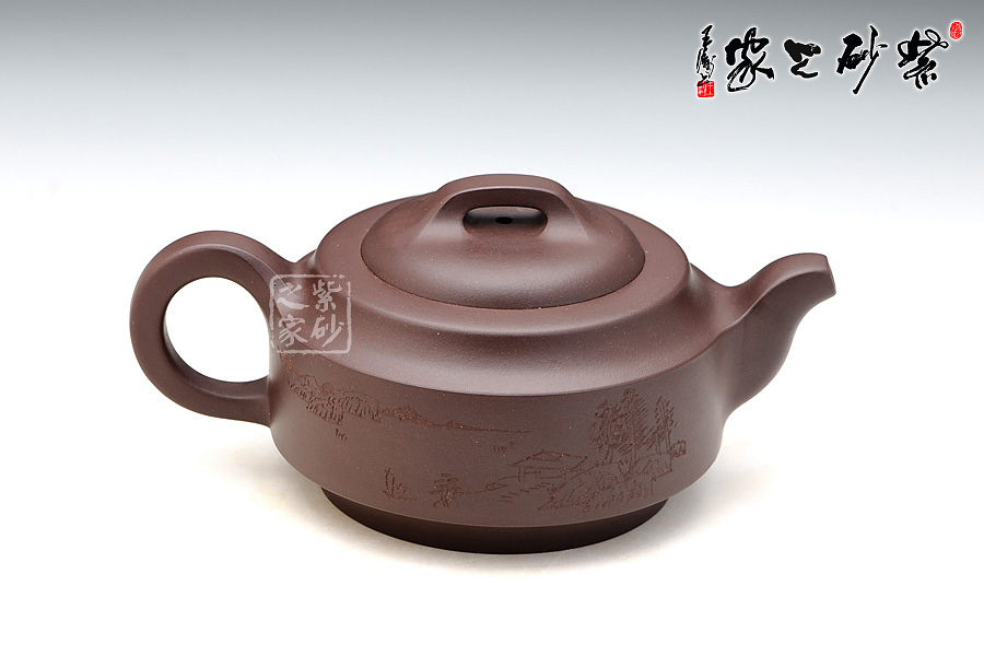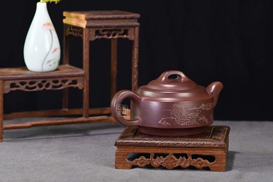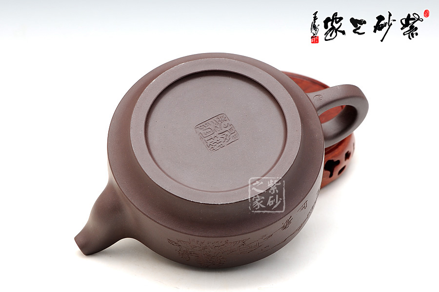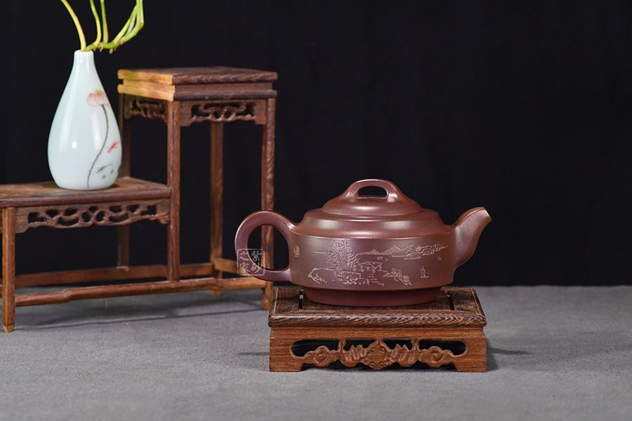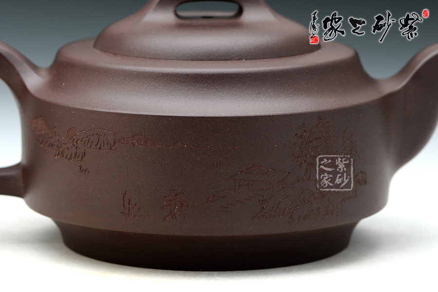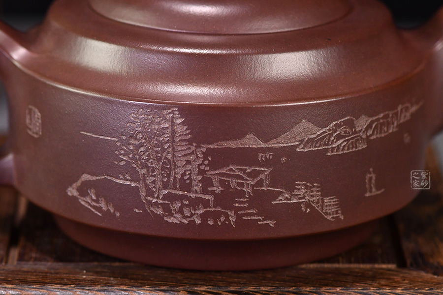 此壺壺身成扁鼓式,圓棱肩,腹部雙折成帶形,壺腹下緣作對應(yīng)處理,把圓蓄勁,流作二彎,根部略大,以“暗接”手法過渡,將壺肩線與壺嘴、壺把的側(cè)線接連一氣,自然舒暢、整體感強(qiáng),橋鈕方中寓圓,嵌蓋圓穹與口唇合體,微細(xì)中見神韻。壺身一側(cè)刻有石刻字,字體流暢飛舞,壺的另一側(cè)刻有湖邊山水圖,如此意境的畫面總?cè)菀琢钊松裢摹?/span>