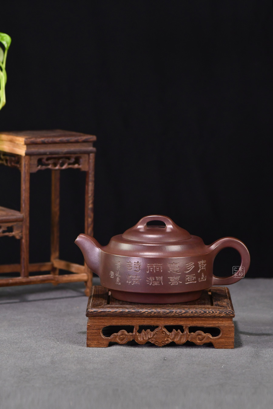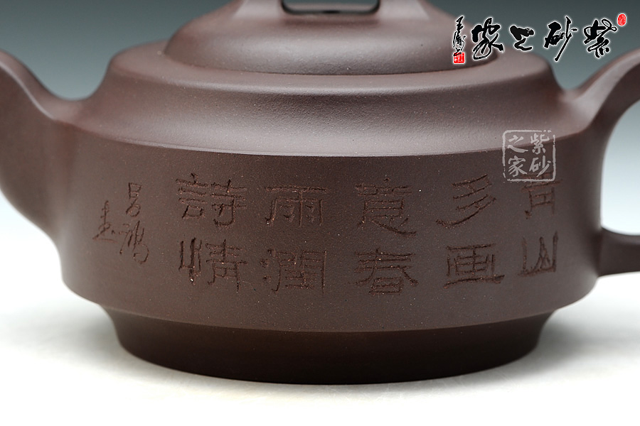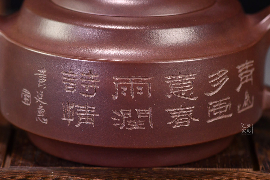 A面: 裝飾: 素刻詩詞 裝飾者:李昌鴻 裝飾內(nèi)容: 此款作品壺身裝飾由紫砂大師、研究院級高工李昌鴻親筆題字,正面篆刻的是“春山多畫意,春雨潤詩情”,意境清幽自然。