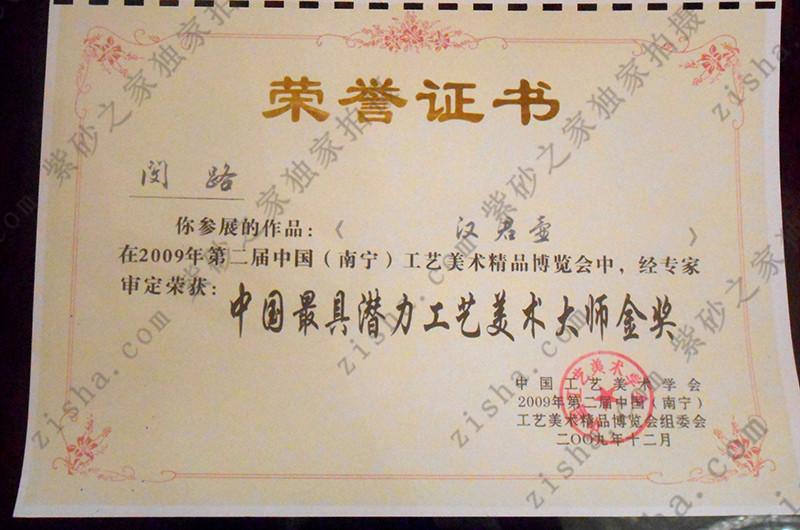2009年“漢君壺”獲“中國最具潛力工藝美術(shù)大師”金獎(jiǎng);