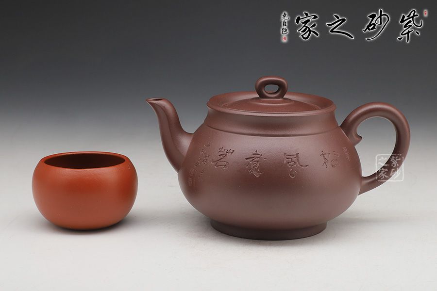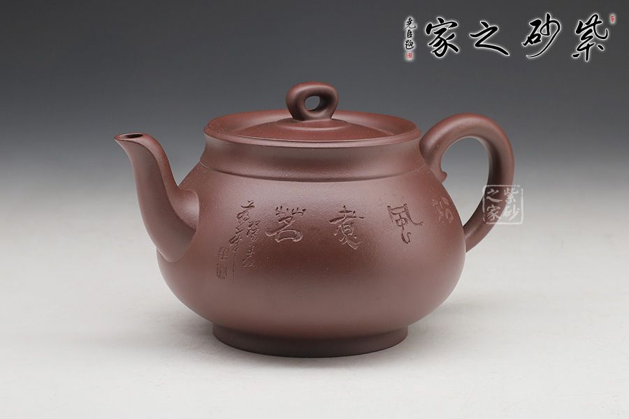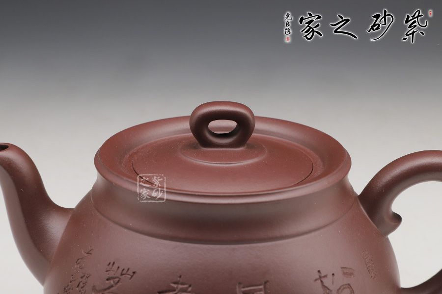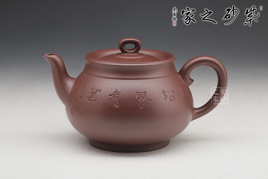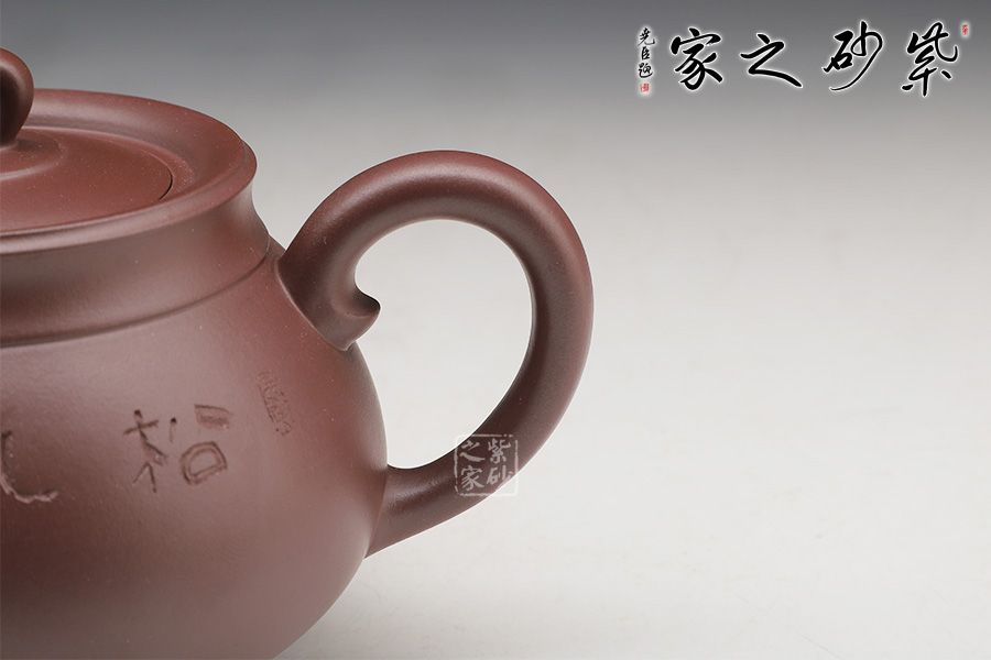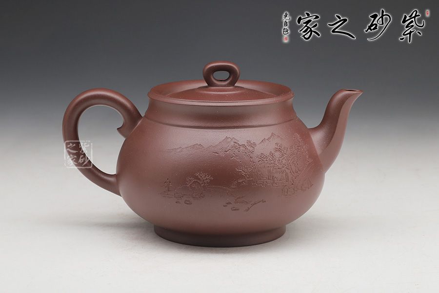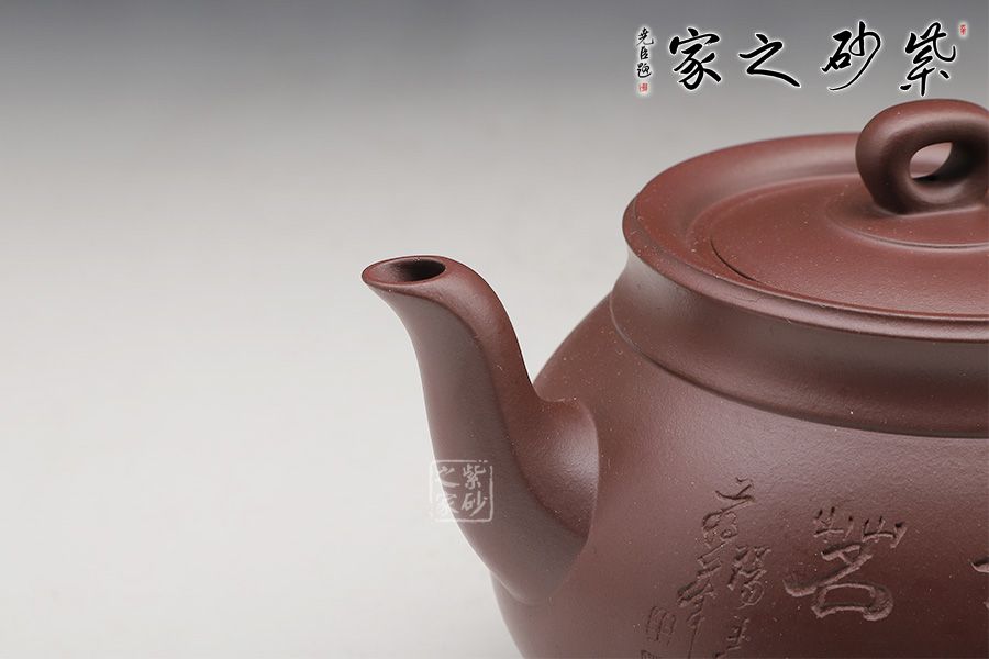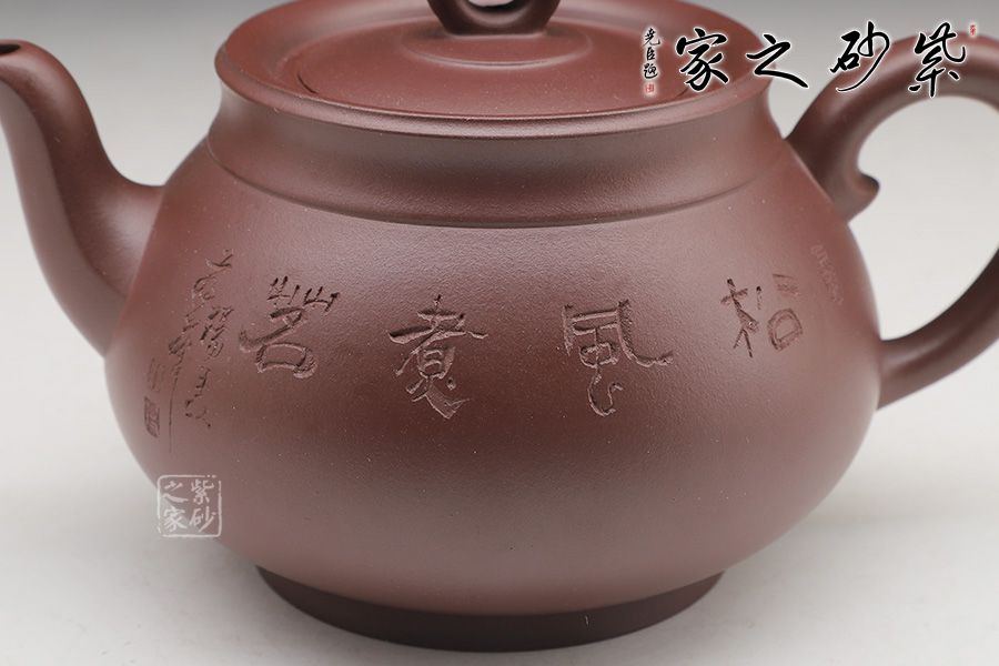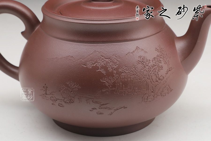此壺壺身上斂下豐,圓潤飽滿,加底設(shè)計(jì),壺腹刻繪“松風(fēng)煮茗”具有詩情畫意,彎流嘴胥出,出水干凈利落,耳形把,端拿舒適,嵌蓋之上獨(dú)特的壺鈕與壺身渾若一體,整體簡(jiǎn)樸古雅,莊重大氣。