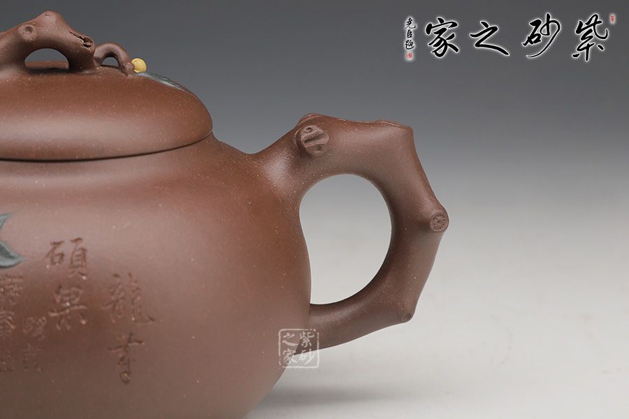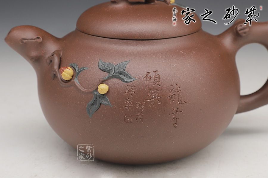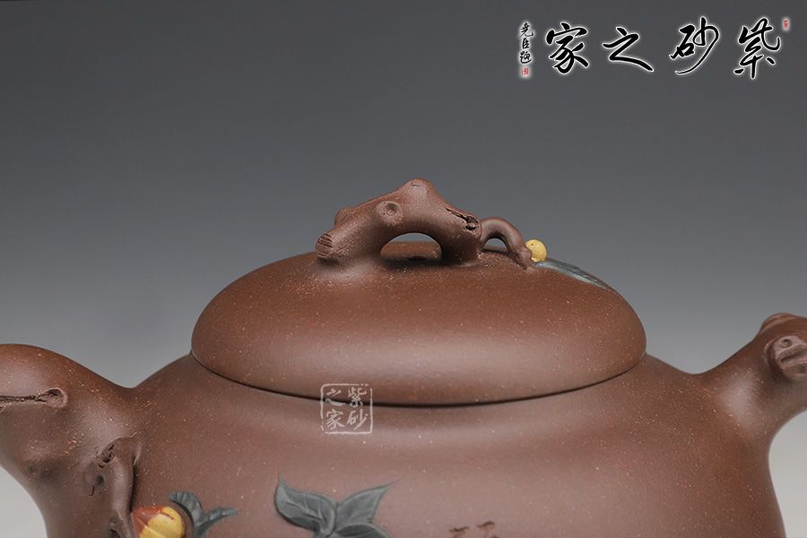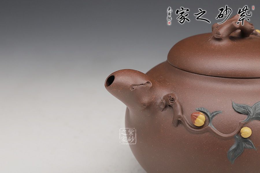 縱觀整壺,線條流暢優(yōu)美、弧度柔和、一氣呵成,給人以圓潤飽滿之感,身筒骨肉亭勻、珠圓玉潤。一彎流從壺身巧妙地胥出,簡約自然、出水流暢。圈把柔和有力,握把舒適。樹枝相連點(diǎn)綴的果葉以兩種不同泥料制作,對(duì)比明顯,金黃的果子是豐收的見證