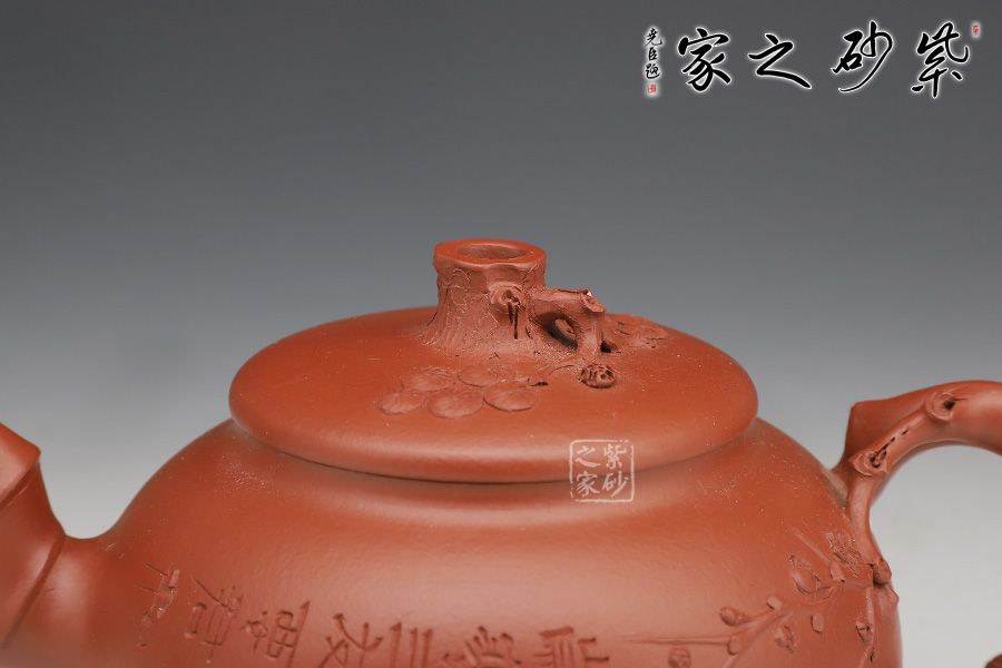 壺身呈圓柱形,平蓋,蓋面微鼓,以竹節(jié)為流,松干為柄,梅枝為鈕,蓋面上梅花點(diǎn)點(diǎn)裝飾點(diǎn)綴,此為歲寒三友。整器于拙樸中見(jiàn)秀妍,一切恰到精妙處。