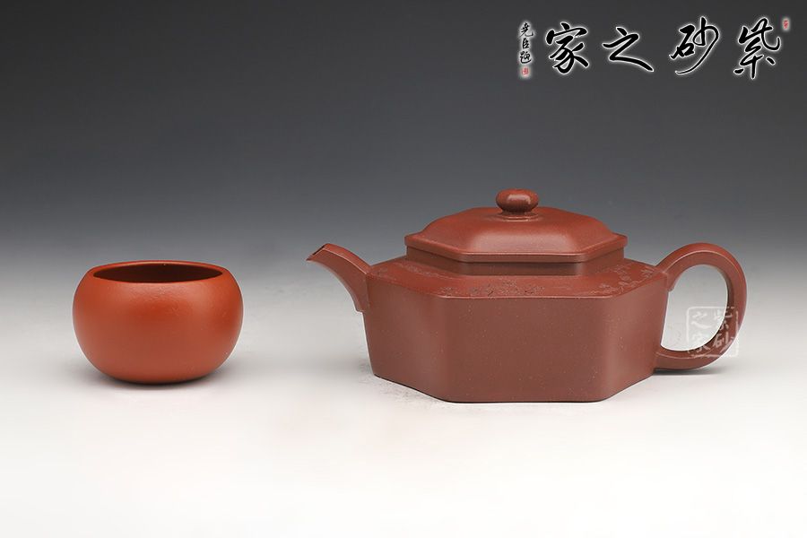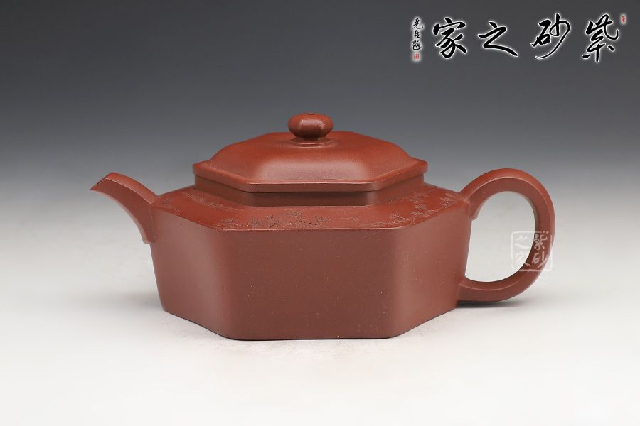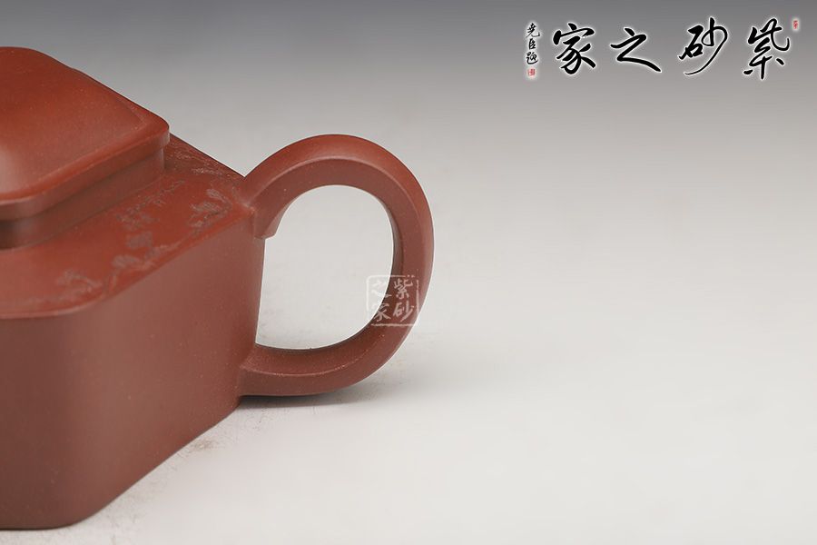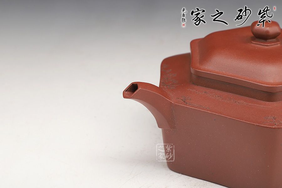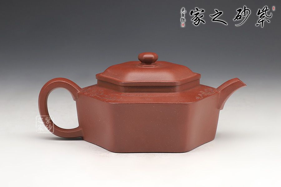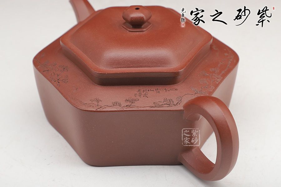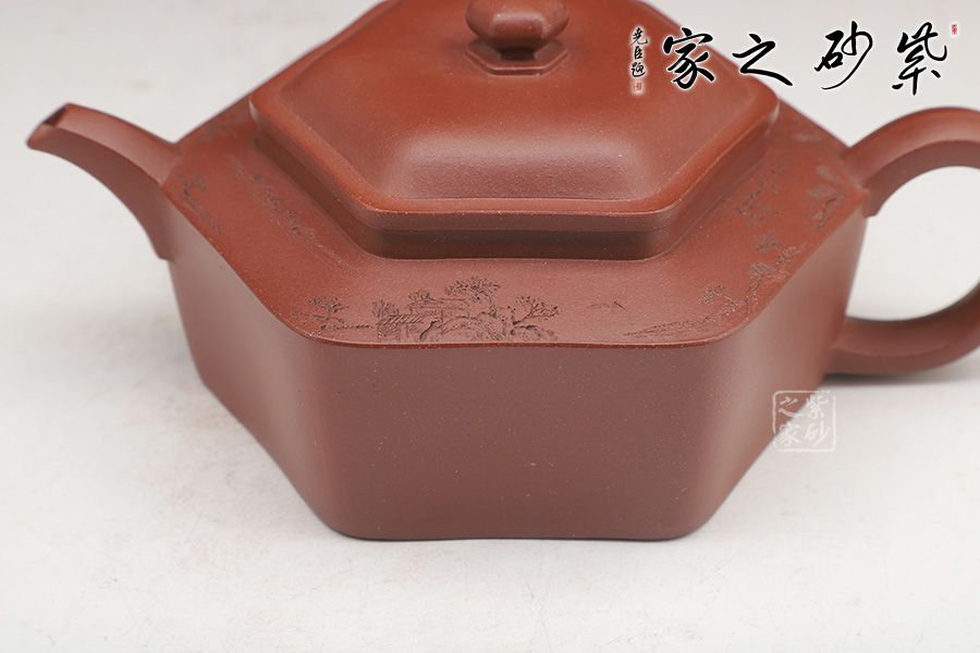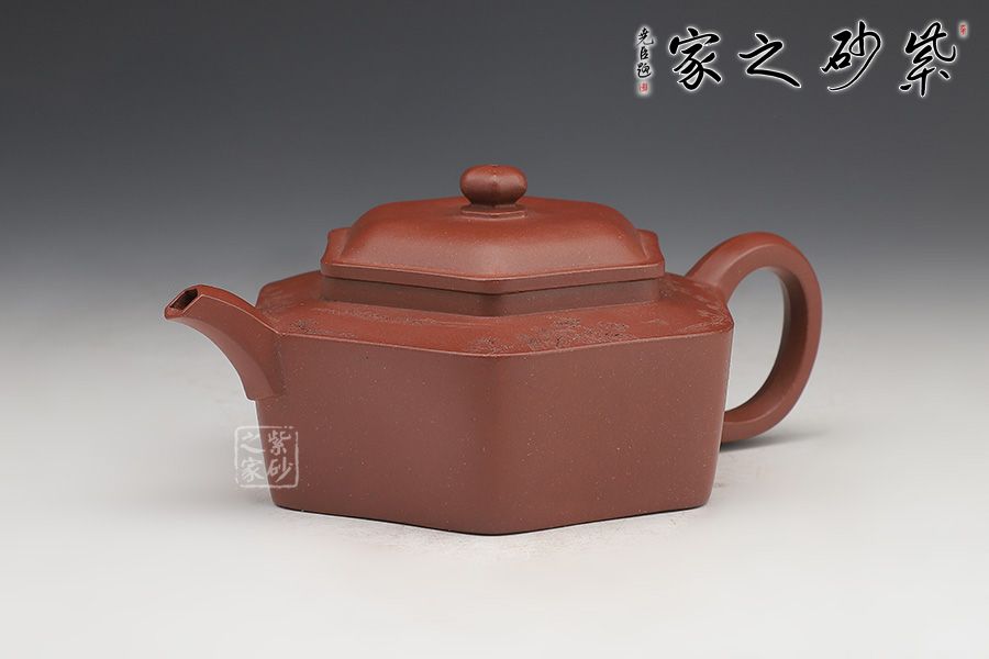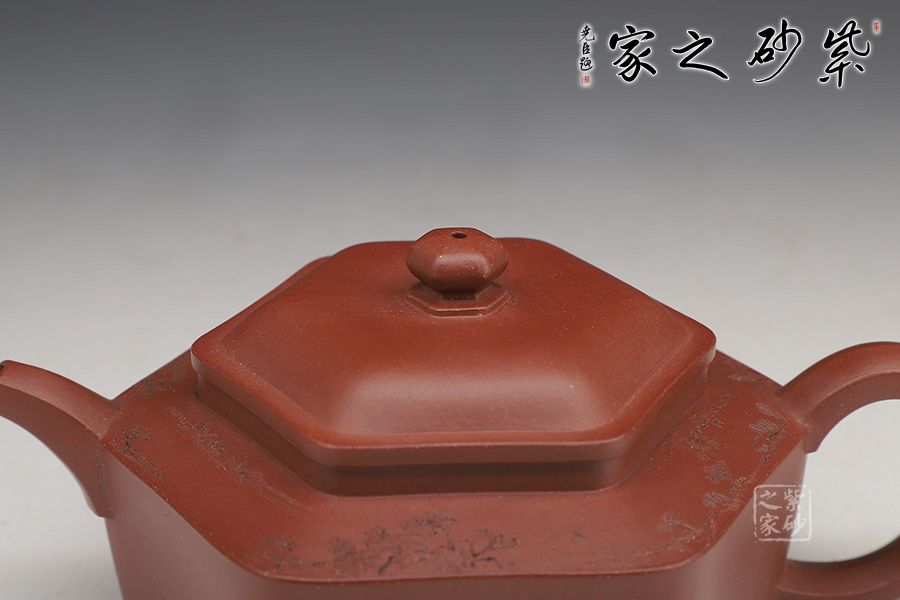 此壺是蔣峰老師在傳統(tǒng)壺型的基礎(chǔ)上創(chuàng)新而來(lái),壺身呈六棱柱型, 壺蓋與壺口相就對(duì)亦呈六方圓形,混六方的小圓鈕剛?cè)岵?jì),不規(guī)則六棱形彎流壺嘴以及壺把,壺的所有部位與壺形體相稱(chēng),整體線(xiàn)面挺括平整,有棱有角,給人明秀挺快,干凈利落的陽(yáng)剛之美,做到“方中寓圓,方中求變,口蓋劃一,剛?cè)嵯喾Q(chēng)”。