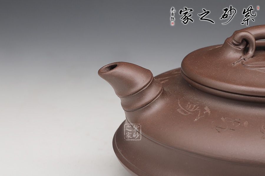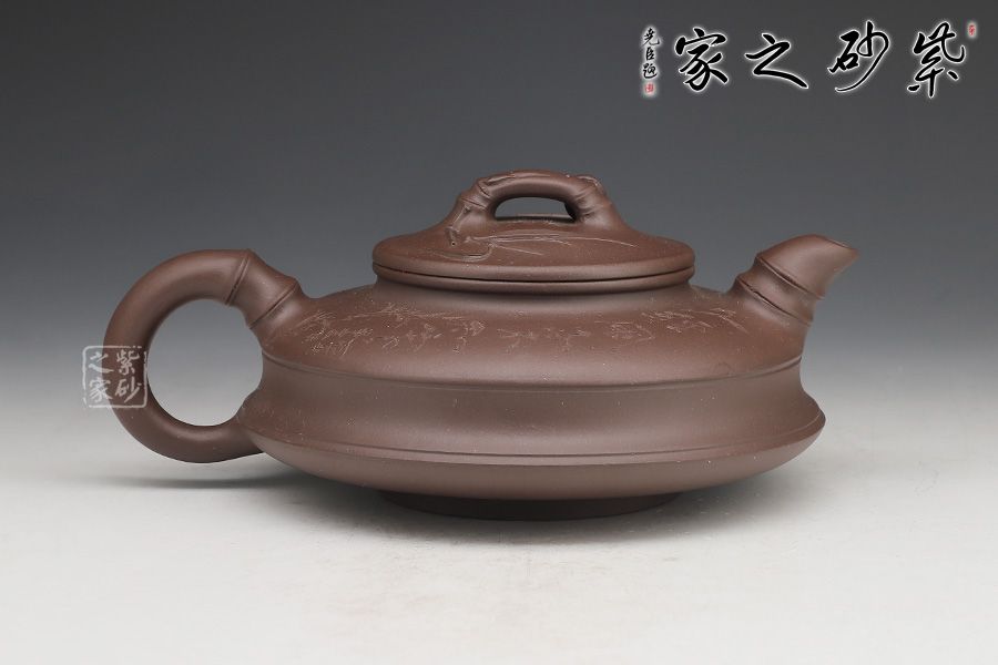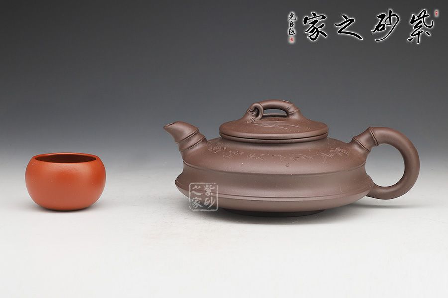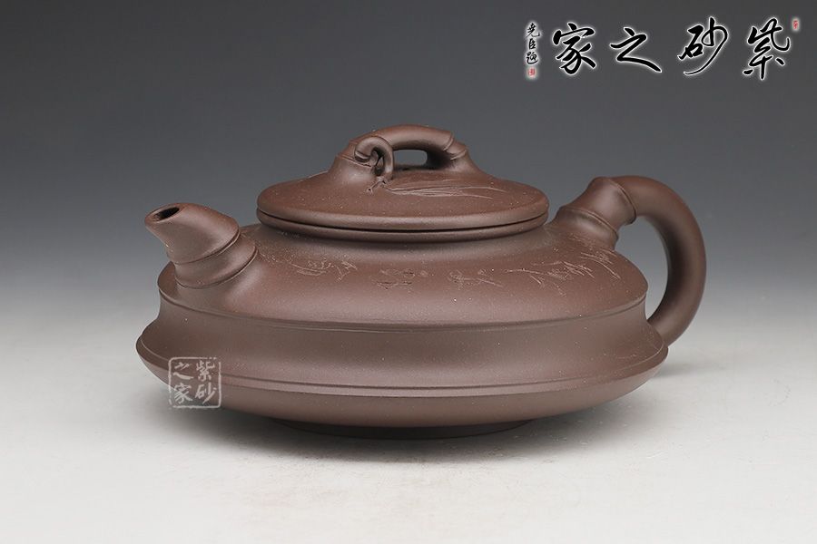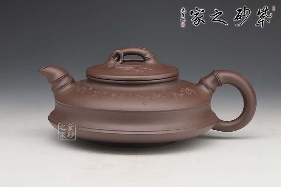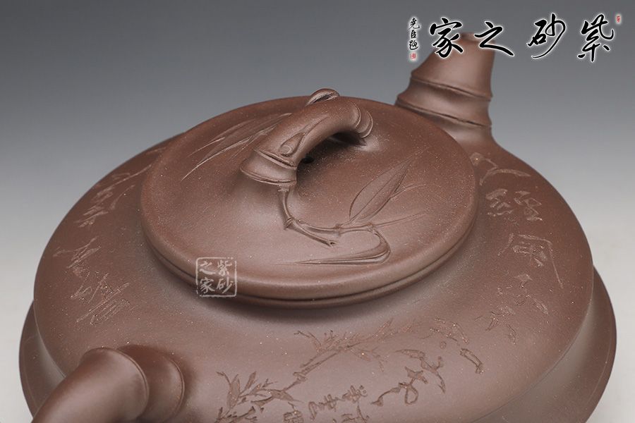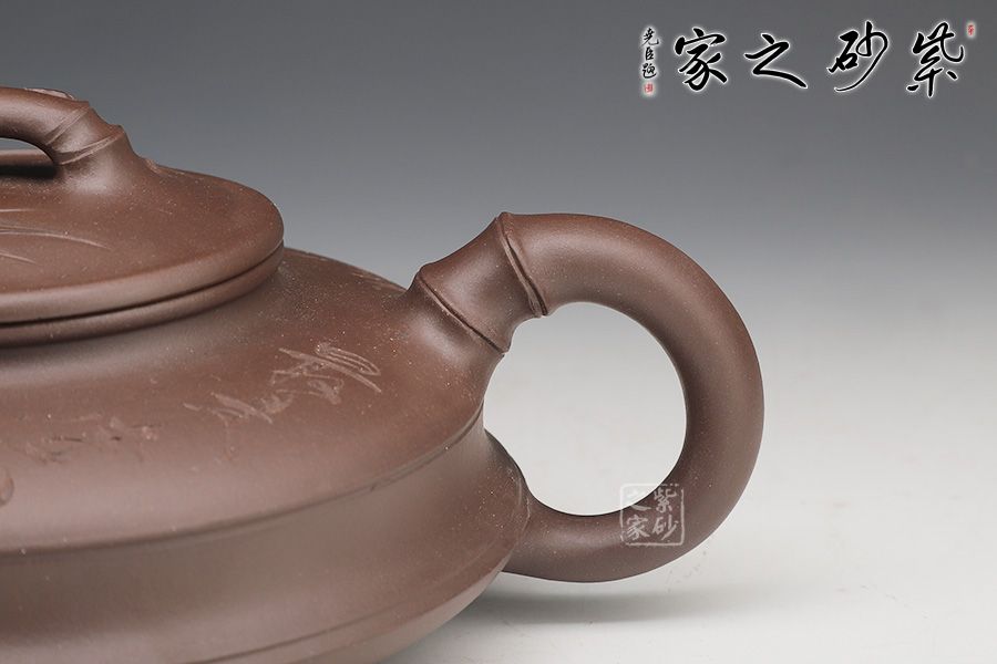 此款勁竹壺,在穩(wěn)穩(wěn)的壺身中,可感受到竹的靈氣,流與把皆以竹段裝飾,壺身沉穩(wěn)大氣。整壺如同一顆勁松,迎風(fēng)佇立,不屈不折。紫茄泥,色澤神秘高貴,散發(fā)特殊紫砂質(zhì)感,光潔而氣蘊(yùn);充分表現(xiàn)砂壺表面肌理,及光線折射變化,動(dòng)人心弦。