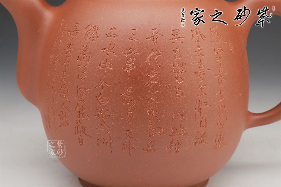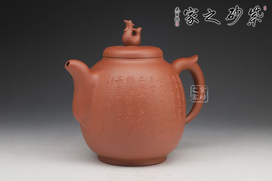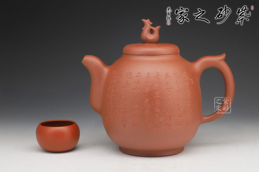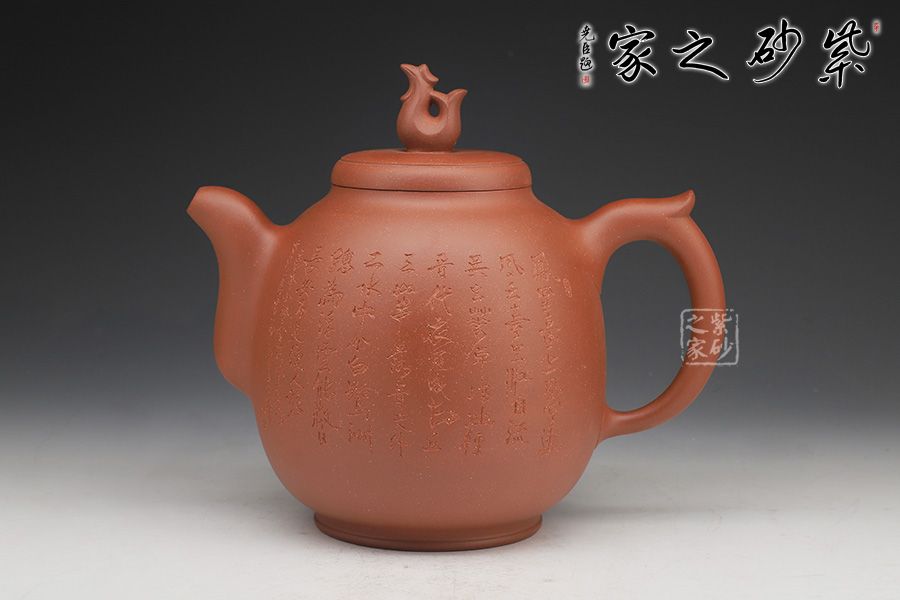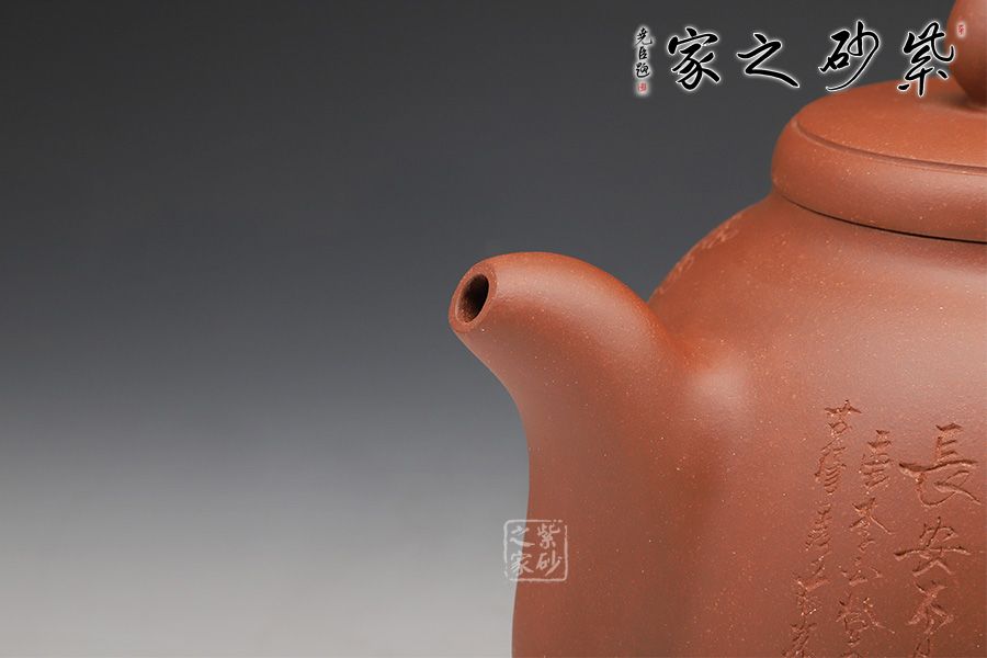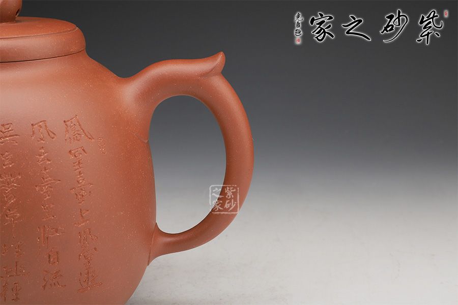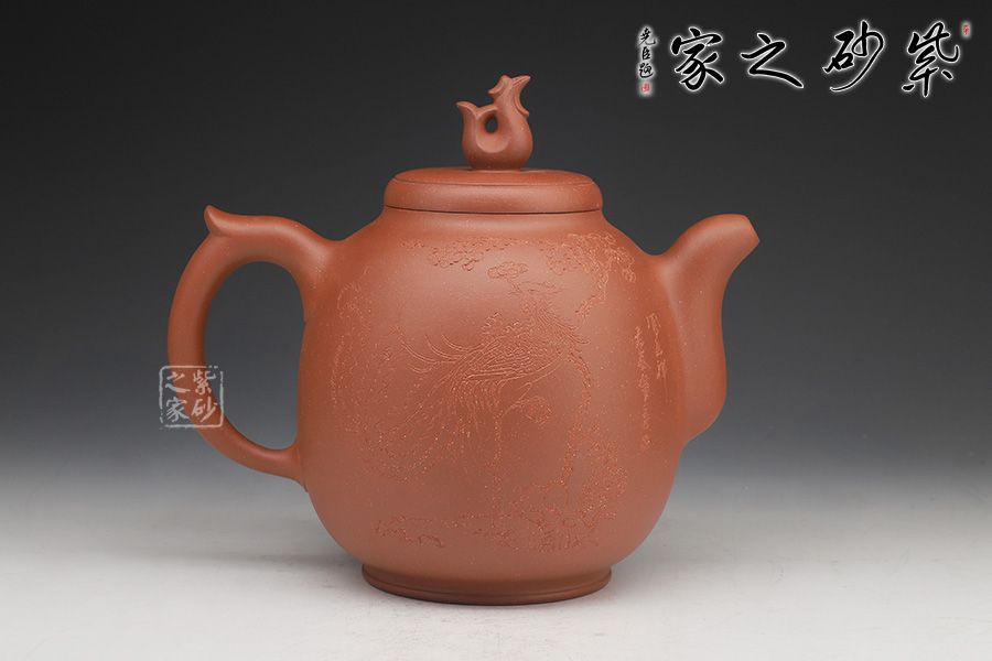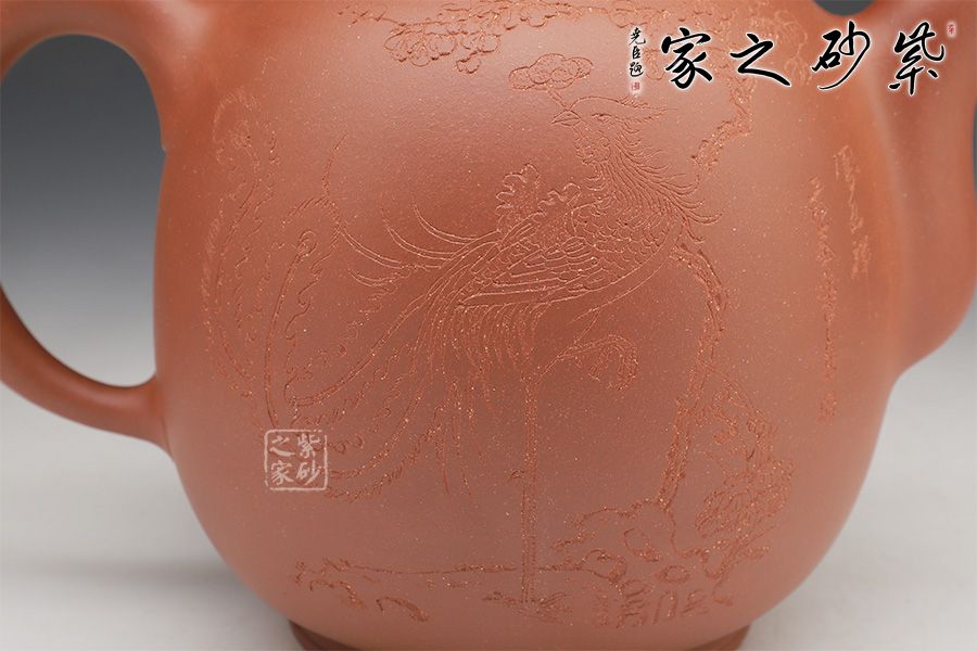 此壺精選原礦清水泥制成,壺身呈圓柱形,上下口徑一致,壺腹圓潤飽滿,彎流嘴胥出,出水爽利,飛把設(shè)計(jì),端拿舒適。壓蓋上鳳形壺鈕與主題相應(yīng)和,壺腹刻繪詩詞,整體大氣美觀,端莊文雅。