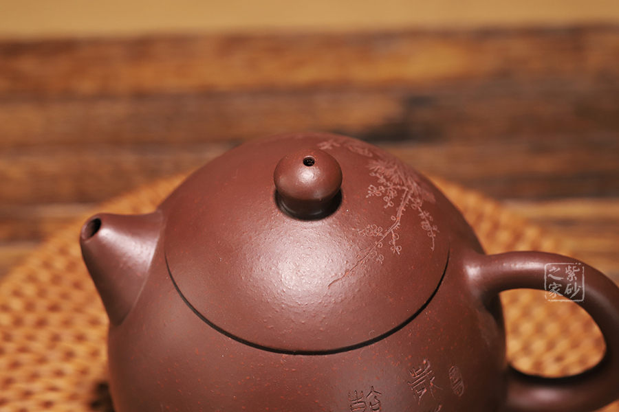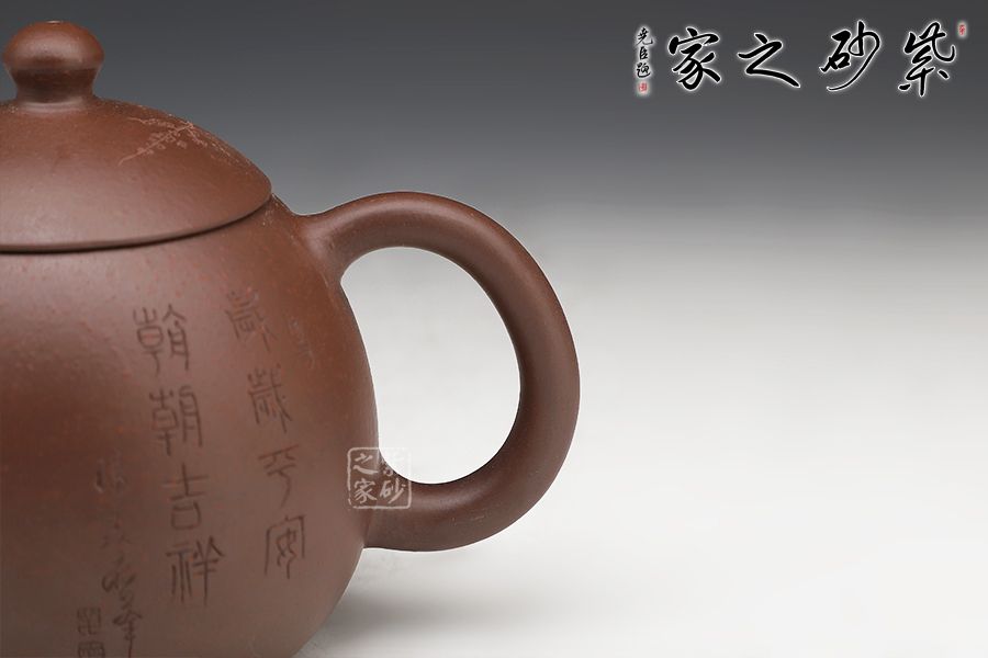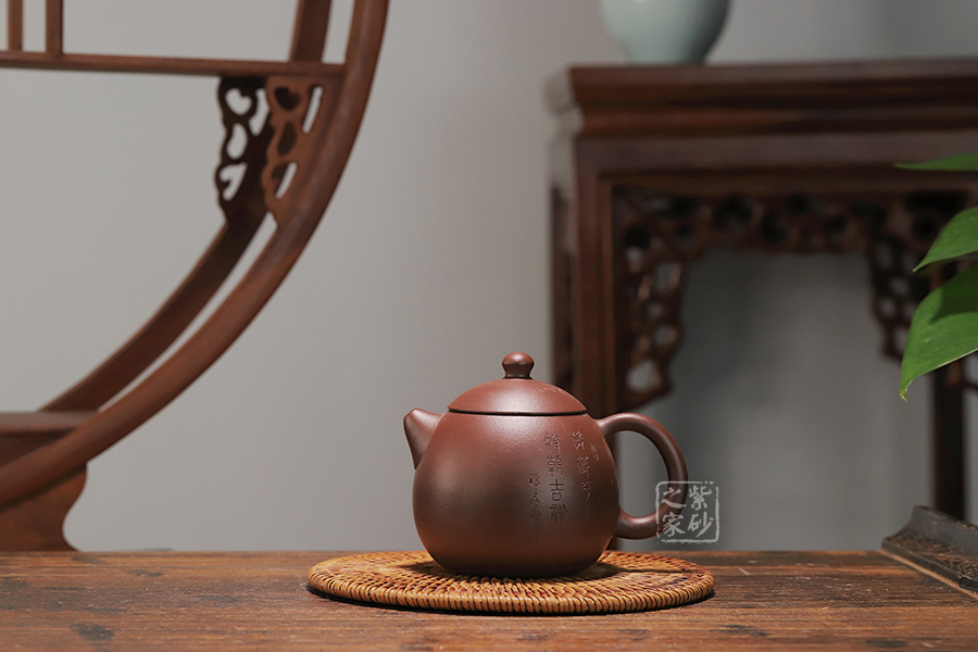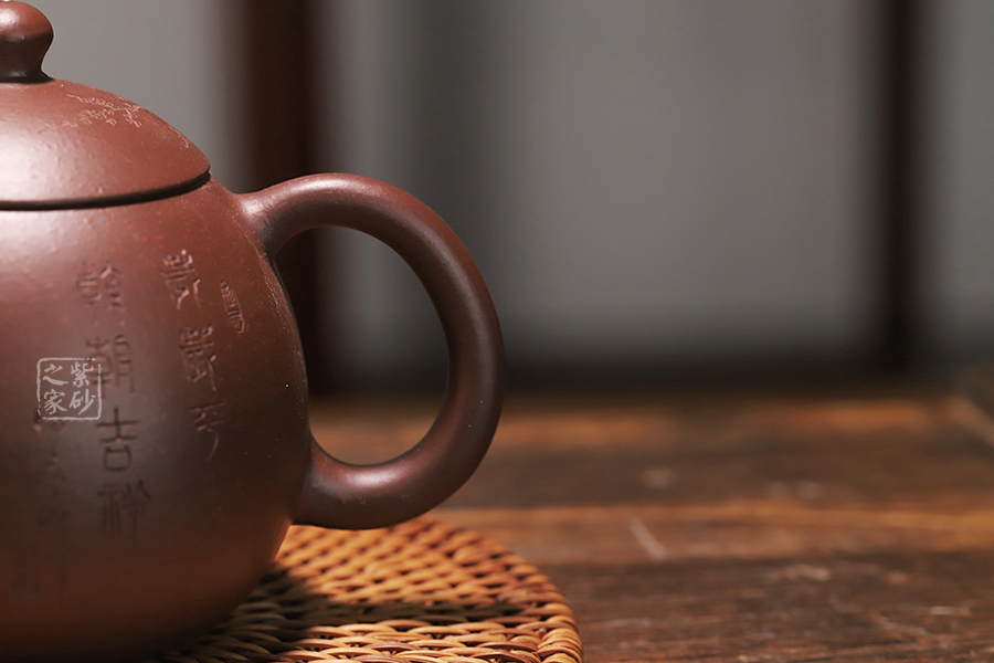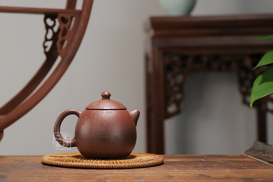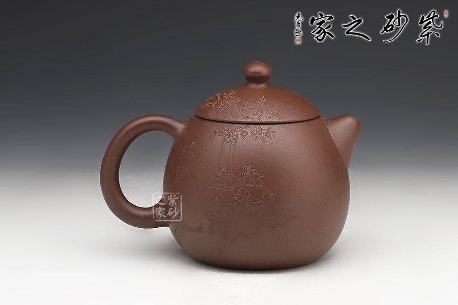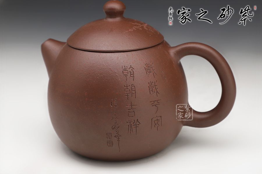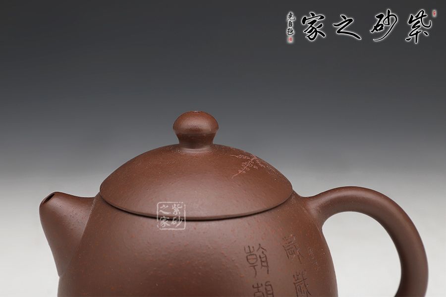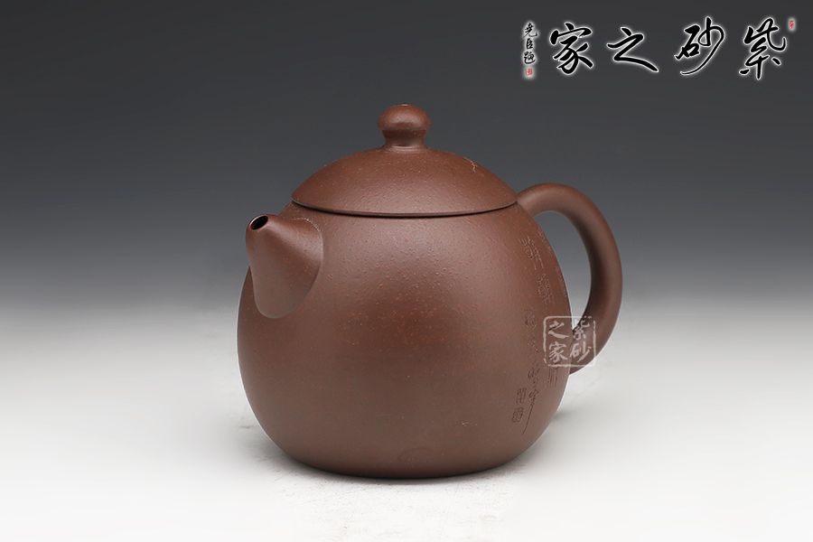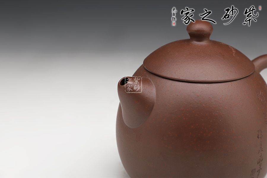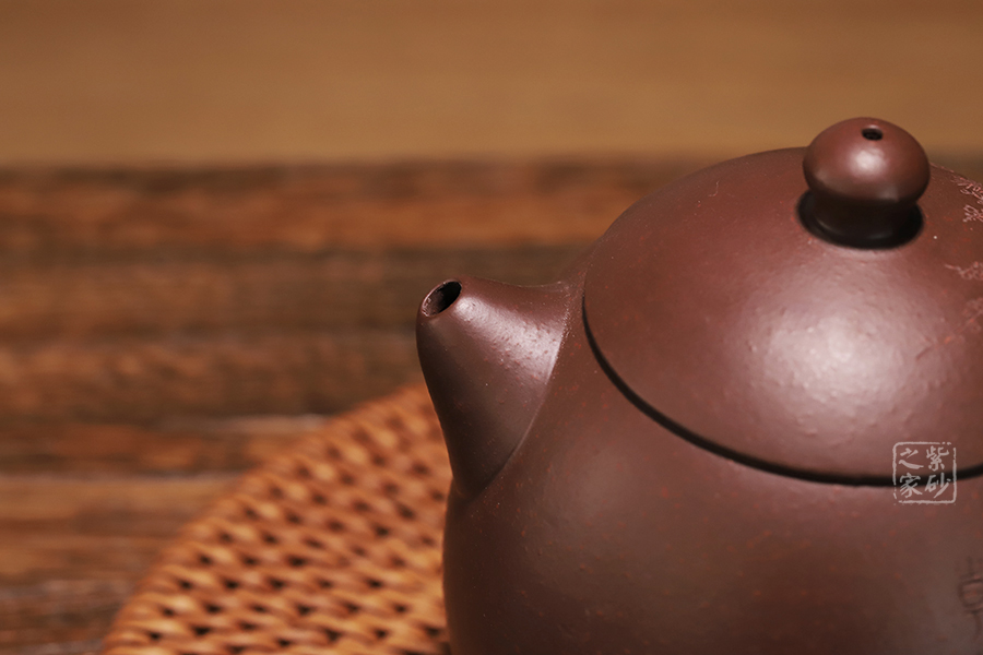 此龍旦通體狀似蛋形,截蓋與壺身渾然一體,氣密性良好,笠形三角狀壺鈕別致而精巧,明接直錐嘴過渡自然,出水迅猛有力,大圈把勢與壺體趁勢,壺體下部過渡平緩,手握舒適,全器平添一種拙味和稚氣的親切感。
