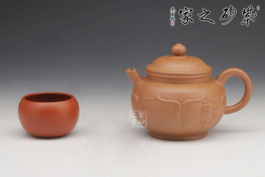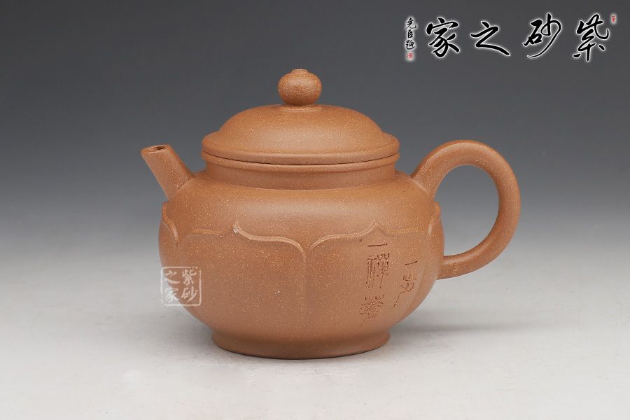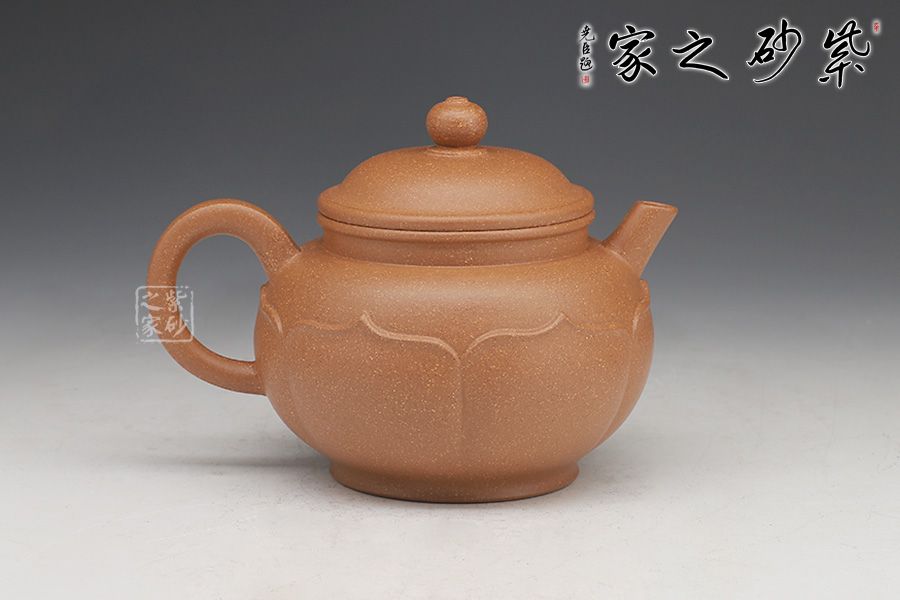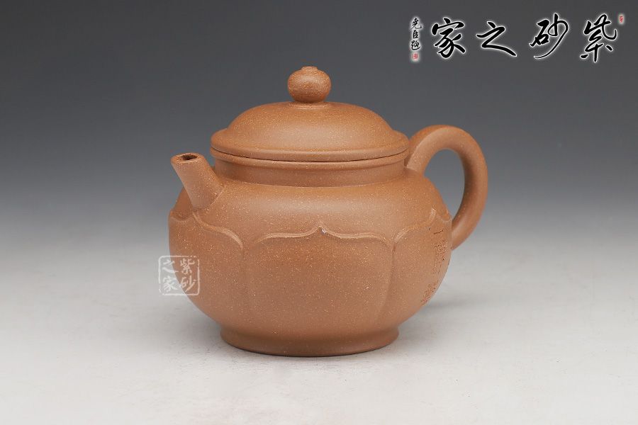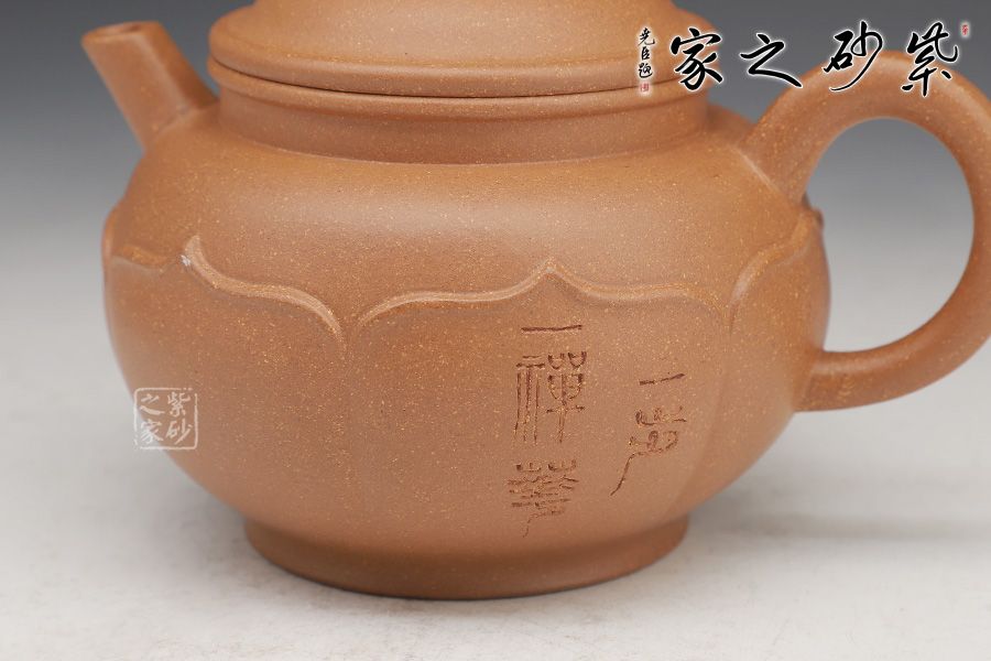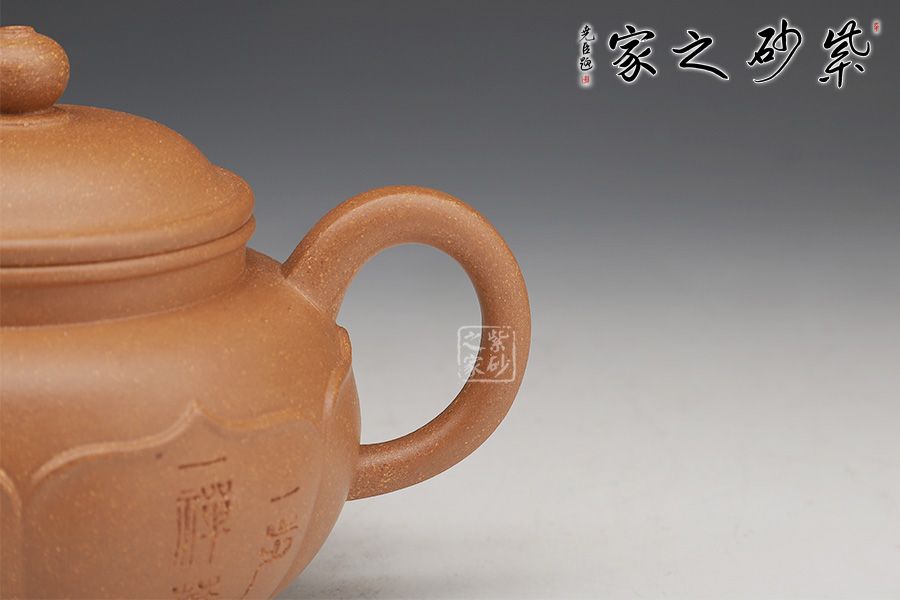 此壺圈足底,壺身圓潤(rùn)光滑。壺口外張,嵌蓋入里,蓋面拱起。壺嘴微彎,出水利落;壺把粗出細(xì)收,精致巧妙。最獨(dú)特之處在于有蓮花自壺身底部出,將壺緊緊包裹,禪意無限。