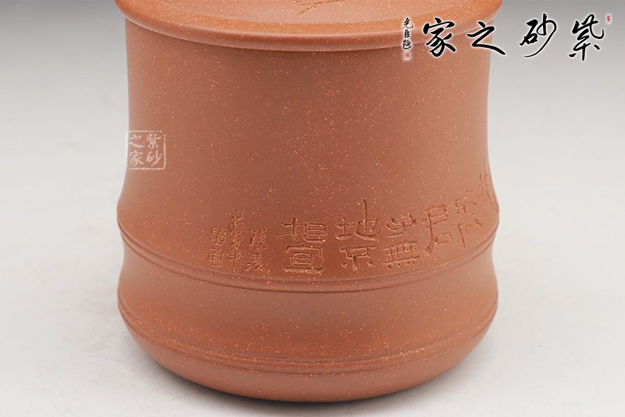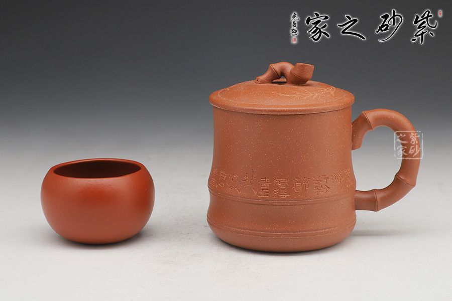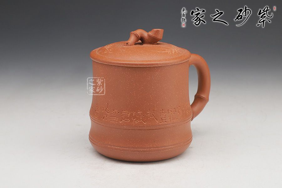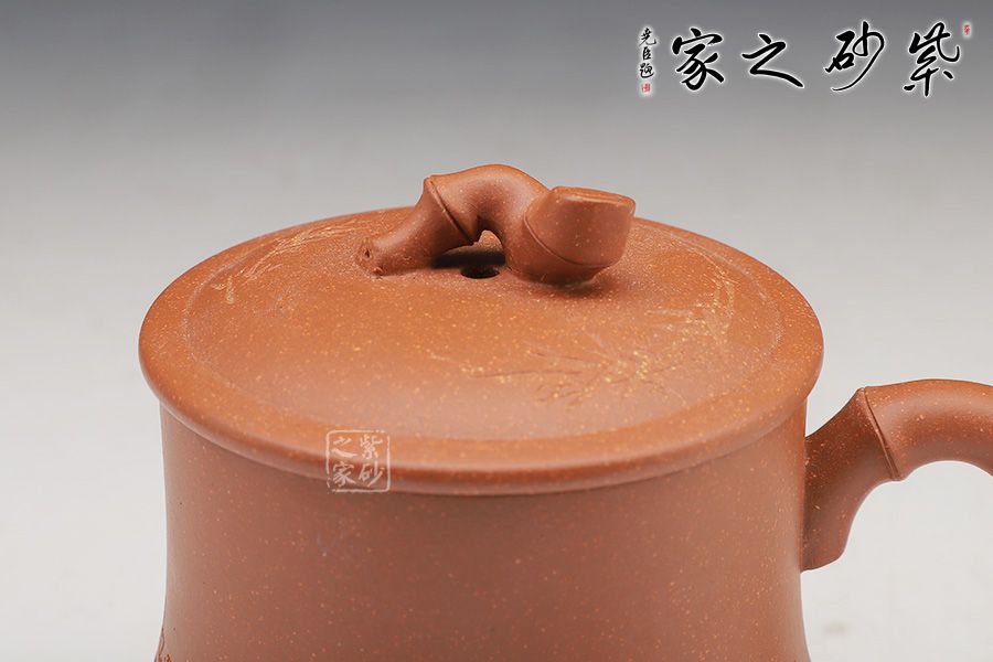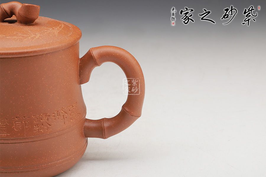 此款蓋杯做工精湛,壺身刻繪,生動(dòng)自然,形象逼真,細(xì)節(jié)的完美,更是體現(xiàn)了次杯的高品質(zhì);背面光潔干凈,可見泥料上乘,手感細(xì)膩;蓋鈕與杯把和杯身以竹段設(shè)計(jì),惟妙惟肖,可見其技法高超。